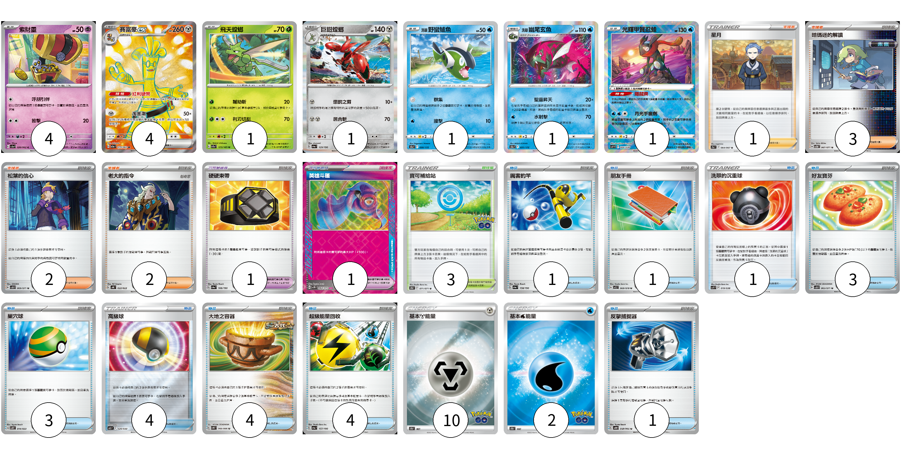牌組構築方案 以此牌組為基礎新構築牌組 顯示卡面 顯示列表 寶可夢卡(13) 4 4 1 1 1 1 1 寶可夢道具(2) 1 1 物品卡(22) 1 1 1 3 3 4 4 4 1 支援者卡(8) 1 3 2 2 競技場卡(3) 3 能量卡(12) 10 2 寶可夢卡(13) 卡牌名稱 張數 卡牌名稱 張數 索財靈 SV3a 020/062 04 賽富豪ex SV3a 079/062 04 飛天螳螂 SV2a 123/165 01 巨鉗螳螂 SV4a 129/190 01 洗翠 野蠻鱸魚 S12a 030/172 01 洗翠 幽尾玄魚 S12a 031/172 01 光輝甲賀忍蛙 SVF 004/038 01 寶可夢道具(2) 卡牌名稱 張數 卡牌名稱 張數 硬硬束帶 SV4a 166/190 01 英雄斗篷 SV5M 064/071 01 物品卡(22) 卡牌名稱 張數 卡牌名稱 張數 厲害釣竿 SV4a 158/190 01 朋友手冊 SV1S 069/078 01 洗翠的沉重球 SVF 019/038 01 好友寶芬 SV5K 063/071 03 巢穴球 SVAW 014/023 03 高級球 SO 020/030 04 大地之容器 SV4K 060/066 04 超級能量回收 SV4a 157/190 04 反擊捕捉器 SV4M 059/066 01 支援者卡(8) 卡牌名稱 張數 卡牌名稱 張數 星月 S9a 064/067 01 暗碼迷的解讀 SV5M 067/071 03 松葉的信心 SV5K 069/071 02 老大的指令 SVHK 022/022 02 競技場卡(3) 卡牌名稱 張數 卡牌名稱 張數 寶可補給站 S10b 071/071 03 能量卡(12) 卡牌名稱 張數 卡牌名稱 張數 基本鋼能量 S10b MET 10 基本水能量 S10b WAT 02 以此牌組為基礎新構築牌組 牌組編碼 KbmKAJ-EgvCEG-wPrUGJ copy 列印牌組單 牌組編碼已複製 分享至SNS