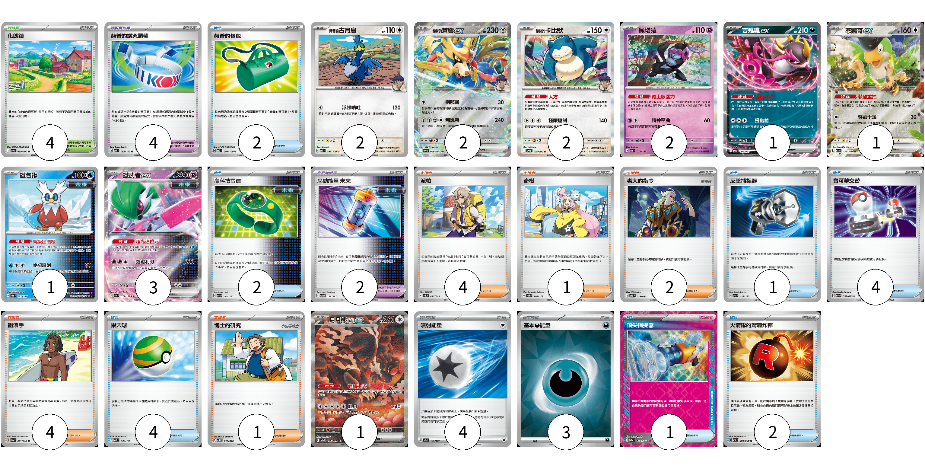 牌組構築方案 以此牌組為基礎新構築牌組 顯示卡面 顯示列表 寶可夢卡(15) 2 2 2 2 1 1 1 3 1 寶可夢道具(6) 4 2 物品卡(16) 2 2 1 4 4 1 2 支援者卡(12) 4 1 2 4 1 競技場卡(4) 4 能量卡(7) 4 3 寶可夢卡(15) 卡牌名稱 張數 卡牌名稱 張數 赫普的古月鳥 SV9 087/100 02 赫普的蒼響ex SV9 069/100 02 赫普的卡比獸 SV9 075/100 02 願增猿 SV8a 075/187 02 吉雉雞ex SVOM 009/021 01 怒鸚哥ex SV4a 154/190 01 鐵包袱 SV8a 047/187 01 鐵武者ex SV8a 074/187 03 月月熊 赫月ex SV8a 225/187 01 寶可夢道具(6) 卡牌名稱 張數 卡牌名稱 張數 赫普的講究頭帶 SV9 092/100 04 驅勁能量 未來 SV8a 158/187 02 物品卡(16) 卡牌名稱 張數 卡牌名稱 張數 赫普的包包 SV9 091/100 02 高科技雷達 SV8a 144/187 02 反擊捕捉器 SV8a 139/187 01 寶可夢交替 SV9a 058/063 04 巢穴球 SVM 133/175 04 頂尖捕捉器 SV8a 148/187 01 火箭隊的驚嚇炸彈 SV10 089/098 02 支援者卡(12) 卡牌名稱 張數 卡牌名稱 張數 派帕 SVK 035/042 04 奇樹 SVM 160/175 01 老大的指令 SVOD 019/020 02 衝浪手 SV7a 061/064 04 博士的研究 SVOD 017/020 01 競技場卡(4) 卡牌名稱 張數 卡牌名稱 張數 化朗鎮 SV9 099/100 04 能量卡(7) 卡牌名稱 張數 卡牌名稱 張數 噴射能量 SV8a 185/187 04 基本【惡】能量 SVOM DAR 03 以此牌組為基礎新構築牌組 牌組編碼 KcBRlk-pQQjGk-RkgoDY copy 列印牌組單 牌組編碼已複製 分享至SNS