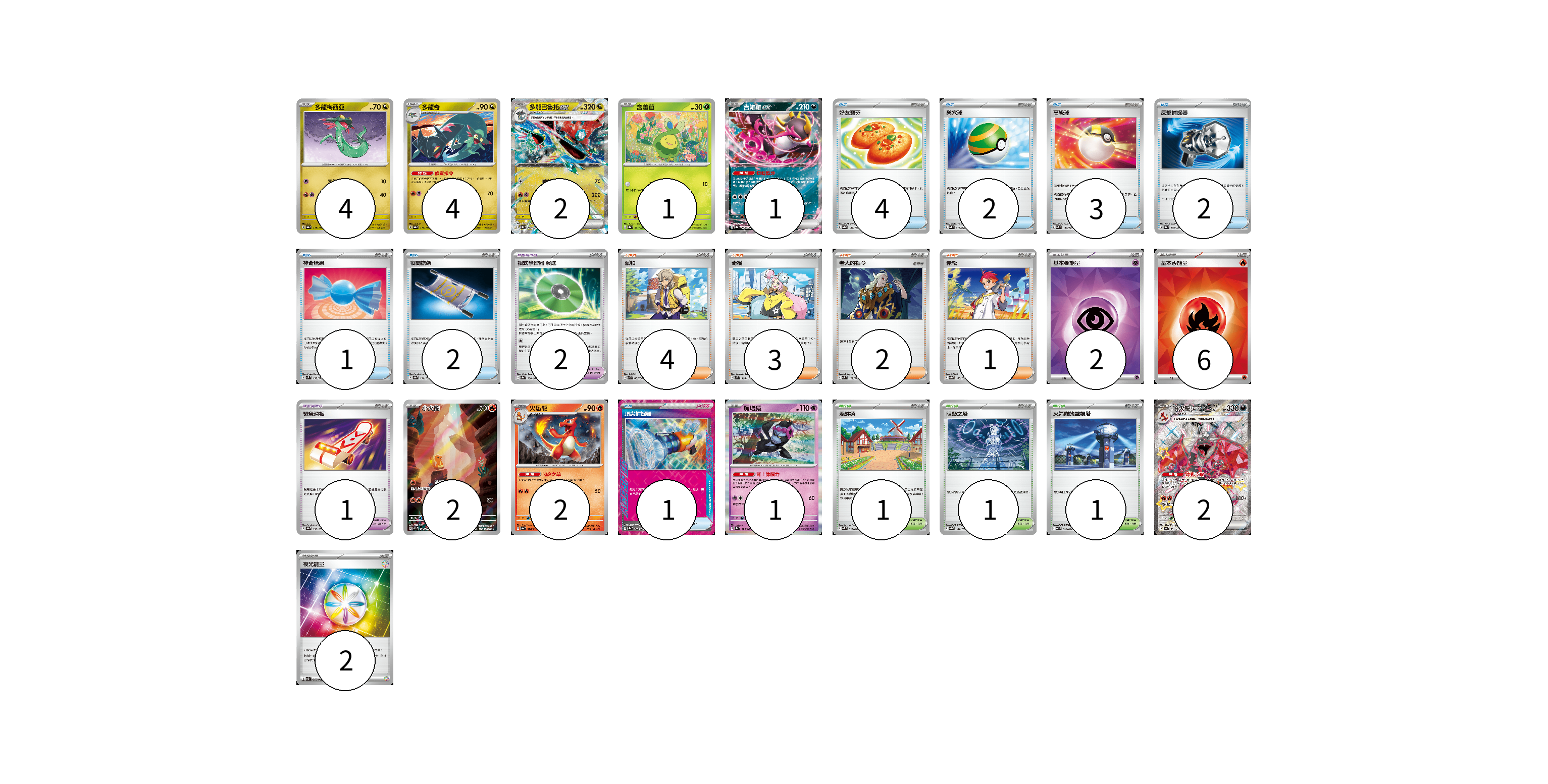 牌組構築方案 以此牌組為基礎新構築牌組 顯示卡面 顯示列表 寶可夢卡(19) 4 4 2 1 1 2 2 1 2 寶可夢道具(3) 2 1 物品卡(15) 4 2 3 2 1 2 1 支援者卡(10) 4 3 2 1 競技場卡(3) 1 1 1 能量卡(10) 2 6 2 寶可夢卡(19) 卡牌名稱 張數 卡牌名稱 張數 多龍梅西亞 SV8a 118/187 04 多龍奇 SV8a 119/187 04 多龍巴魯托ex SV8a 120/187 02 含羞苞 SV8a 001/187 01 吉雉雞ex SV8a 104/187 01 小火龍 SV2a 168/165 02 火恐龍 SV4a 026/190 02 願增猿 SV8a 075/187 01 噴火龍ex SV4a 331/190 02 寶可夢道具(3) 卡牌名稱 張數 卡牌名稱 張數 招式學習器 演進 SV8a 160/187 02 緊急滑板 SV8a 153/187 01 物品卡(15) 卡牌名稱 張數 卡牌名稱 張數 好友寶芬 SV8a 147/187 04 巢穴球 SVK 016/042 02 高級球 SVM 134/175 03 反擊捕捉器 SV8a 139/187 02 神奇糖果 SVM 135/175 01 夜間擔架 SV8a 151/187 02 頂尖捕捉器 SV8a 148/187 01 支援者卡(10) 卡牌名稱 張數 卡牌名稱 張數 派帕 SVK 035/042 04 奇樹 SVM 160/175 03 老大的指令 SVM 172/175 02 赤松 SV8a 163/187 01 競技場卡(3) 卡牌名稱 張數 卡牌名稱 張數 深缽鎮 SVK 039/042 01 阻礙之塔 SV8a 181/187 01 火箭隊的監視塔 SV10 096/098 01 能量卡(10) 卡牌名稱 張數 卡牌名稱 張數 基本【超】能量 SVK PSY 02 基本【火】能量 SVK FIR 06 夜光能量 SVK 042/042 02 以此牌組為基礎新構築牌組 牌組編碼 KcLzDU-VHwULv-Mpksvu copy 列印牌組單 牌組編碼已複製 分享至SNS