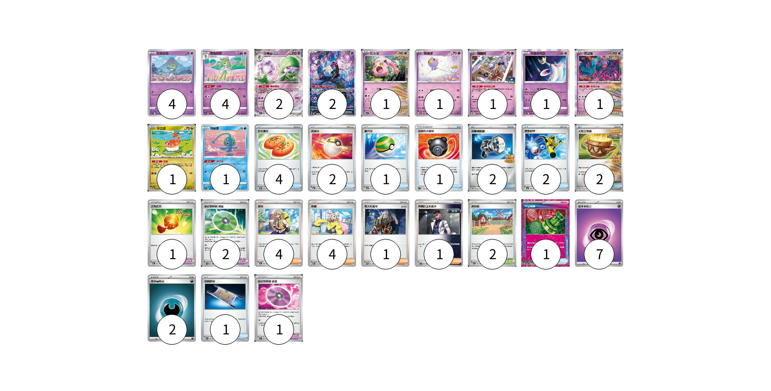 牌組構築方案 以此牌組為基礎新構築牌組 顯示卡面 顯示列表 寶可夢卡(19) 4 4 2 2 1 1 1 1 1 1 1 寶可夢道具(4) 1 2 1 物品卡(16) 4 2 1 1 2 2 2 1 1 支援者卡(10) 4 4 1 1 競技場卡(2) 2 能量卡(9) 7 2 寶可夢卡(19) 卡牌名稱 張數 卡牌名稱 張數 拉魯拉絲 S9a 032/067 04 奇魯莉安 SVF 007/038 04 沙奈朵ex SV4a 082/190 02 願增猿 SV6 107/101 02 吼叫尾 SV4K 032/066 01 飄飄球 SVD 052/139 01 鑰圈兒 SV-P 089/SV-P 01 克雷色利亞 S10D 028/067 01 振翼髮 SV5K 033/071 01 米立龍 SV6 082/101 01 瑪納霏 SVF 003/038 01 寶可夢道具(4) 卡牌名稱 張數 卡牌名稱 張數 勇氣護符 SV4a 169/190 01 招式學習器 演進 SV4M 063/066 02 招式學習器 衰退 SVK 026/042 01 物品卡(16) 卡牌名稱 張數 卡牌名稱 張數 好友寶芬 SV5K 063/071 04 高級球 SVHK 013/022 02 巢穴球 SVHK 012/022 01 洗翠的沉重球 SVF 019/038 01 反擊捕捉器 SV-P 083/SV-P 02 厲害釣竿 SV4a 158/190 02 大地之容器 SV-P 084/SV-P 02 不公印章 SV5a 053/066 01 夜間擔架 SV6a 056/064 01 支援者卡(10) 卡牌名稱 張數 卡牌名稱 張數 派帕 SV4a 180/190 04 奇樹 SVHK 019/022 04 老大的指令 SVHK 022/022 01 弗圖博士的劇本 SV4M 065/066 01 競技場卡(2) 卡牌名稱 張數 卡牌名稱 張數 深缽鎮 SV4a 185/190 02 能量卡(9) 卡牌名稱 張數 卡牌名稱 張數 基本【超】能量 SVHM PSY 07 基本【惡】能量 SVF DAR 02 以此牌組為基礎新構築牌組 牌組編碼 KdUoNo-moPWCr-IDYhpX copy 列印牌組單 牌組編碼已複製 分享至SNS