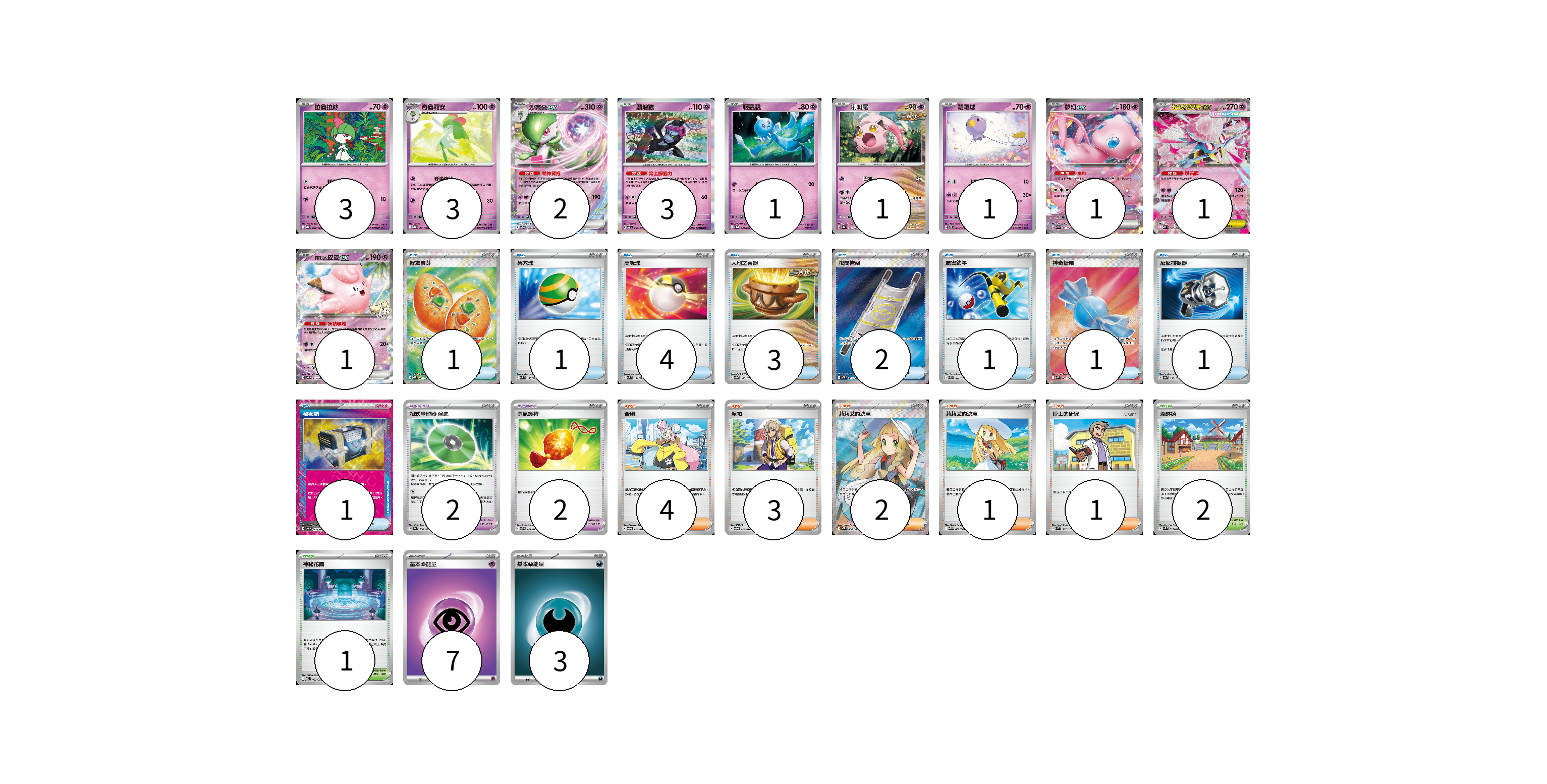 牌組構築方案 以此牌組為基礎新構築牌組 顯示卡面 顯示列表 寶可夢卡(18) 3 3 2 3 1 1 1 1 1 1 1 寶可夢道具(4) 2 2 物品卡(14) 1 1 4 3 2 1 1 1 支援者卡(11) 4 3 2 1 1 競技場卡(3) 2 1 能量卡(10) 7 3 寶可夢卡(18) 卡牌名稱 張數 卡牌名稱 張數 拉魯拉絲 M1S 040/063 03 奇魯莉安 M1S 041/063 03 沙奈朵ex SVTS 004/022 02 願增猿 SV6 055/101 03 輕飄飄 SV11W 041/086 01 吼叫尾 SV8a 071/187 01 飄飄球 SVTS 005/022 01 夢幻ex SVK 001/042 01 超級蒂安希ex MBD 006/022 01 莉莉艾的皮皮ex SV9 033/100 01 厲害釣竿 SVEL 010/020 01 寶可夢道具(4) 卡牌名稱 張數 卡牌名稱 張數 招式學習器 演進 SV8a 160/187 02 勇氣護符 SVTS 017/022 02 物品卡(14) 卡牌名稱 張數 卡牌名稱 張數 好友寶芬 M1S 081/063 01 巢穴球 SVM 133/175 01 高級球 SVM 134/175 04 大地之容器 SV8a 143/187 03 夜間擔架 M1L 083/063 02 神奇糖果 M1S 082/063 01 反擊捕捉器 SV8a 139/187 01 秘密箱 SV6 092/101 01 支援者卡(11) 卡牌名稱 張數 卡牌名稱 張數 奇樹 SVOD 016/020 04 派帕 SVOD 018/020 03 莉莉艾的決意 M1L 086/063 02 莉莉艾的決意 M1L 062/063 01 博士的研究 SVM 162/175 01 競技場卡(3) 卡牌名稱 張數 卡牌名稱 張數 深缽鎮 SVK 039/042 02 神秘花園 MBD 022/022 01 能量卡(10) 卡牌名稱 張數 卡牌名稱 張數 基本超能量 sv-p PSY 07 基本【惡】能量 SVF DAR 03 以此牌組為基礎新構築牌組 牌組編碼 KdawjG-kFoslr-BknULs copy 列印牌組單 牌組編碼已複製 分享至SNS