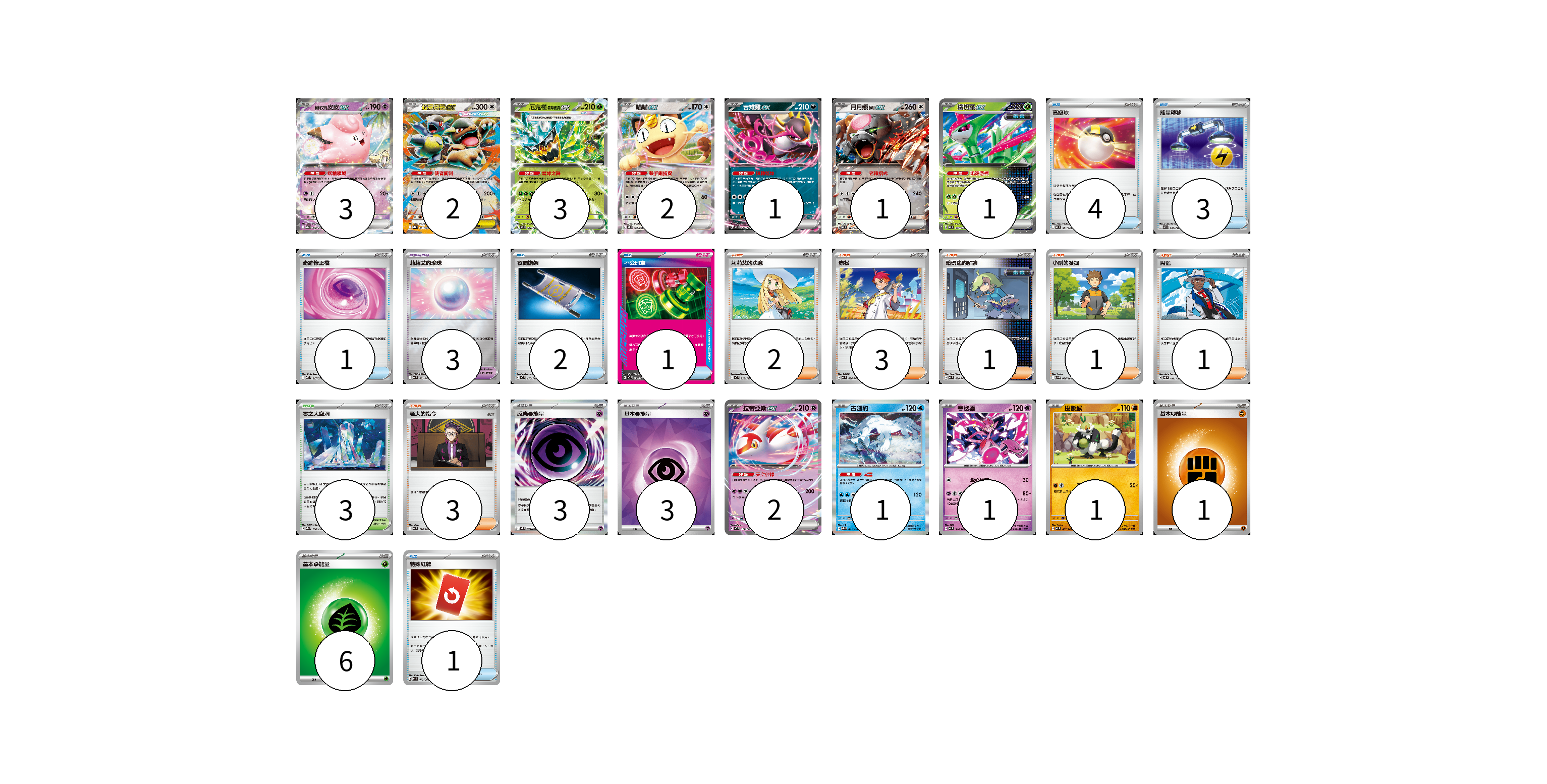 牌組構築方案 以此牌組為基礎新構築牌組 顯示卡面 顯示列表 寶可夢卡(18) 3 2 3 2 1 1 1 2 1 1 1 寶可夢道具(3) 3 物品卡(12) 4 3 1 2 1 1 支援者卡(11) 2 3 1 1 1 3 競技場卡(3) 3 能量卡(13) 3 3 1 6 寶可夢卡(18) 卡牌名稱 張數 卡牌名稱 張數 莉莉艾的皮皮ex M2a 060/193 03 超級袋獸ex M1S 051/063 02 厄鬼椪 碧草面具ex MC 082/742 03 喵喵ex M3 061/080 02 吉雉雞ex MC 489/742 01 月月熊 赫月 ex MC 625/742 01 鐵斑葉ex MC 077/742 01 拉帝亞斯ex MC 312/742 02 古劍豹 M2a 043/193 01 眷戀雲 MC 346/742 01 投擲猴 MC 407/742 01 寶可夢道具(3) 卡牌名稱 張數 卡牌名稱 張數 莉莉艾的珍珠 MC 692/742 03 物品卡(12) 卡牌名稱 張數 卡牌名稱 張數 高級球 MC 651/742 04 能量轉移 MC 638/742 03 奇跡修正檔 MBD 017/022 01 夜間擔架 MC 670/742 02 不公印章 MC 633/742 01 特殊紅牌 M4 072/083 01 支援者卡(11) 卡牌名稱 張數 卡牌名稱 張數 莉莉艾的決意 MC 729/742 02 赤松 MC 696/742 03 暗碼迷的解讀 MC 698/742 01 小剛的發掘 SV9 096/100 01 席藍 SV8 102/106 01 老大的指令 MC 724/742 03 競技場卡(3) 卡牌名稱 張數 卡牌名稱 張數 零之大空洞 M2a 184/193 03 能量卡(13) 卡牌名稱 張數 卡牌名稱 張數 感應【超】能量 M3 079/080 03 基本【超】能量 SVOD PSY 03 基本【鬥】能量 MC FIG 01 基本【草】能量 MJ GRA 06 以此牌組為基礎新構築牌組 牌組編碼 KgCMjt-LYhxCY-XYcdsT copy 列印牌組單 牌組編碼已複製 分享至SNS