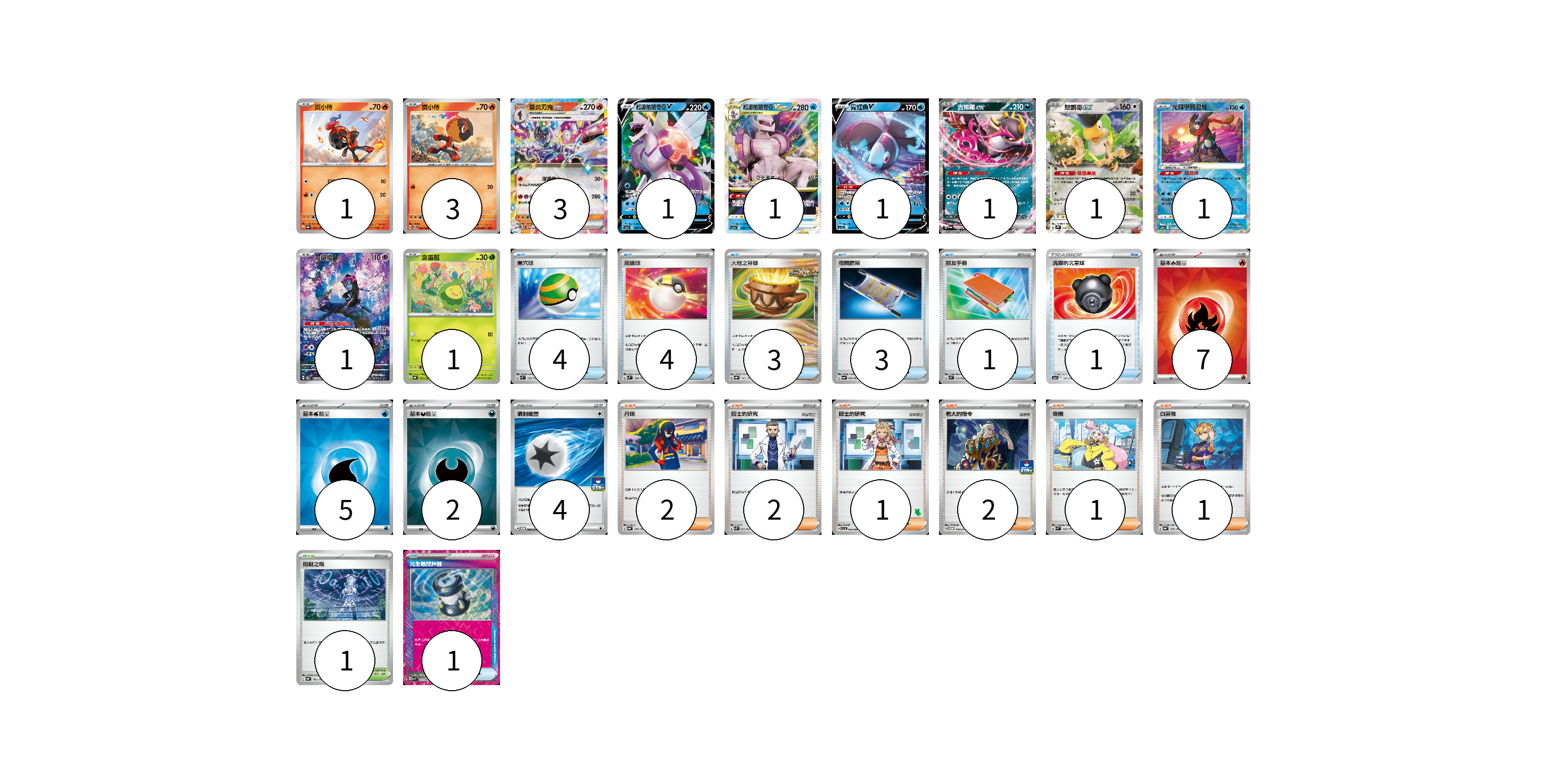 牌組構築方案 以此牌組為基礎新構築牌組 顯示卡面 顯示列表 寶可夢卡(15) 1 3 3 1 1 1 1 1 1 1 1 物品卡(17) 4 4 3 3 1 1 1 支援者卡(9) 2 2 1 2 1 1 競技場卡(1) 1 能量卡(18) 7 5 2 4 寶可夢卡(15) 卡牌名稱 張數 卡牌名稱 張數 炭小侍 SV8a 023/187 01 炭小侍 SVPS 005/008 03 蒼炎刃鬼ex SVPS 006/008 03 起源帕路奇亞V S12a 027/172 01 起源帕路奇亞VSTAR S12a 028/172 01 霓虹魚V SVHK 004/022 01 吉雉雞ex SV6a 038/064 01 怒鸚哥ex SV2P 065/071 01 光輝甲賀忍蛙 S12a 033/172 01 願增猿 SV6 107/101 01 含羞苞 SV8a 001/187 01 物品卡(17) 卡牌名稱 張數 卡牌名稱 張數 巢穴球 SVM 133/175 04 高級球 SVM 134/175 04 大地之容器 SV8a 143/187 03 夜間擔架 SV6a 056/064 03 朋友手冊 SVK 014/042 01 洗翠的沉重球 S12a 140/172 01 完全體攪拌器 SVK 017/042 01 支援者卡(9) 卡牌名稱 張數 卡牌名稱 張數 丹瑜 SV8a 170/187 02 博士的研究 SVK 033/042 02 博士的研究 SVI 063/066 01 老大的指令 SV-P 178/SV-P 02 奇樹 SVM 160/175 01 白蕾雅 SV8a 176/187 01 競技場卡(1) 卡牌名稱 張數 卡牌名稱 張數 阻礙之塔 SV8a 181/187 01 能量卡(18) 卡牌名稱 張數 卡牌名稱 張數 基本【火】能量 SVK FIR 07 基本【水】能量 SVK WAT 05 基本【惡】能量 SVK DAR 02 噴射能量 SV-P 180/SV-P 04 以此牌組為基礎新構築牌組 牌組編碼 KgpqsQ-roPBce-tdQhkZ copy 列印牌組單 牌組編碼已複製 分享至SNS