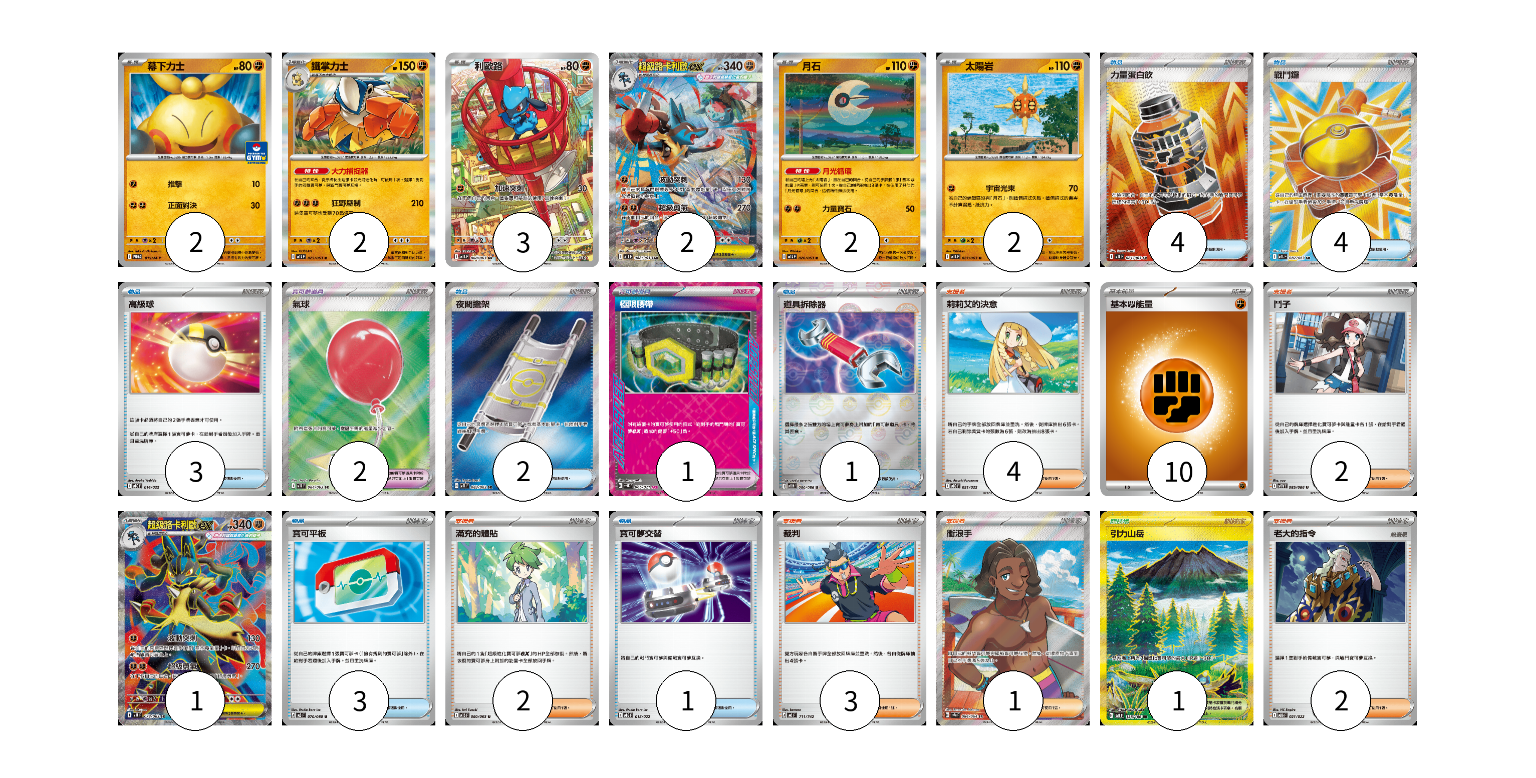 牌組構築方案 以此牌組為基礎新構築牌組 顯示卡面 顯示列表 寶可夢卡(14) 2 2 3 2 2 2 1 寶可夢道具(3) 2 1 物品卡(18) 4 4 3 2 1 3 1 支援者卡(14) 4 2 2 3 1 2 競技場卡(1) 1 能量卡(10) 10 寶可夢卡(14) 卡牌名稱 張數 卡牌名稱 張數 幕下力士 M-P 015/M-P 02 鐵掌力士 M1L 025/063 02 利歐路 M1L 068/063 03 超級路卡利歐ex M1L 088/063 02 月石 M1L 026/063 02 太陽岩 M1L 027/063 02 超級路卡利歐ex M1L 078/063 01 寶可夢道具(3) 卡牌名稱 張數 卡牌名稱 張數 氣球 M1L 084/063 02 極限腰帶 SV5K 066/071 01 物品卡(18) 卡牌名稱 張數 卡牌名稱 張數 力量蛋白飲 M1L 081/063 04 戰鬥鑼 M1L 082/063 04 高級球 MBD 014/022 03 夜間擔架 M1L 083/063 02 道具拆除器 SV11W 080/086 01 寶可平板 M3 070/080 03 寶可夢交替 MBG 015/022 01 支援者卡(14) 卡牌名稱 張數 卡牌名稱 張數 莉莉艾的決意 MBD 021/022 04 鬥子 SV11W 085/086 02 滿充的體貼 M1S 060/063 02 裁判 MC 711/742 03 衝浪手 SV7a 084/064 01 老大的指令 MBG 021/022 02 競技場卡(1) 卡牌名稱 張數 卡牌名稱 張數 引力山岳 SV8 138/106 01 能量卡(10) 卡牌名稱 張數 卡牌名稱 張數 基本【鬥】能量 M-P FIG 10 以此牌組為基礎新構築牌組 牌組編碼 KgzRhA-FMxFMT-uLmcZV copy 列印牌組單 牌組編碼已複製 分享至SNS