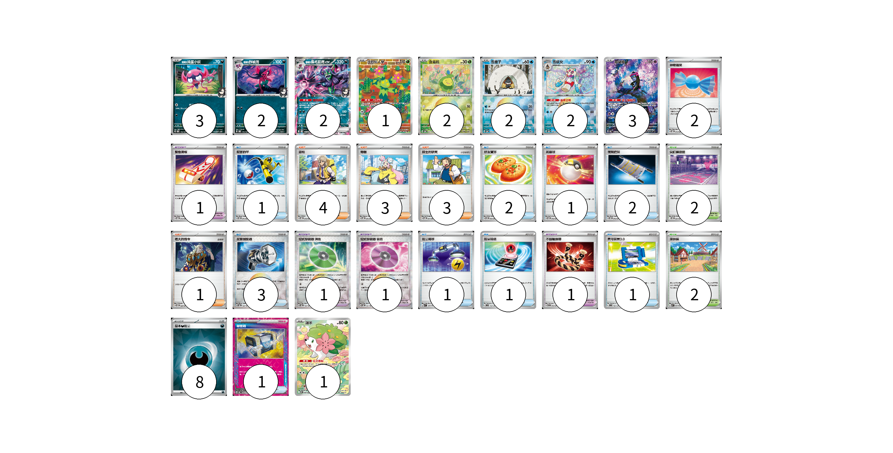 牌組構築方案 以此牌組為基礎新構築牌組 顯示卡面 顯示列表 寶可夢卡(18) 3 2 2 1 2 2 2 3 1 寶可夢道具(4) 1 1 1 1 物品卡(15) 2 1 2 1 2 3 1 1 1 1 支援者卡(11) 4 3 3 1 競技場卡(4) 2 2 能量卡(8) 8 寶可夢卡(18) 卡牌名稱 張數 卡牌名稱 張數 <瑪俐的>搗蛋小妖 SVOM 005/021 03 <瑪俐的>詐唬魔 SVOM 006/021 02 <瑪俐的>長毛巨魔ex SVOM 007/021 02 沙鈴仙人掌 SV9 101/100 01 含羞苞 SV8a 001/187 02 雪童子 SV8a 037/187 02 雪妖女 SV8a 038/187 02 願增猿 SV6 107/101 03 謝米 SV9a 066/063 01 寶可夢道具(4) 卡牌名稱 張數 卡牌名稱 張數 緊急滑板 SVOD 015/020 01 招式學習器 演進 SV8a 160/187 01 招式學習器 衰退 SV8a 161/187 01 不服輸頭帶 SVTL 016/021 01 物品卡(15) 卡牌名稱 張數 卡牌名稱 張數 神奇糖果 SVOD 013/020 02 厲害釣竿 SVOM 011/021 01 好友寶芬 SVOM 012/021 02 高級球 SVOM 013/021 01 夜間擔架 SVOM 016/021 02 反擊捕捉器 SV8a 139/187 03 能量轉移 SVM 127/175 01 能量輸送 SVD 112/139 01 寶可裝置3.0 SVD 121/139 01 秘密箱 SV6 092/101 01 支援者卡(11) 卡牌名稱 張數 卡牌名稱 張數 派帕 SVOD 018/020 04 奇樹 SVOD 016/020 03 博士的研究 SVOD 017/020 03 老大的指令 SVOM 020/021 01 競技場卡(4) 卡牌名稱 張數 卡牌名稱 張數 尖釘鎮道館 SVOM 021/021 02 深缽鎮 SVK 039/042 02 能量卡(8) 卡牌名稱 張數 卡牌名稱 張數 基本【惡】能量 SVOM DAR 08 以此牌組為基礎新構築牌組 牌組編碼 KhbENj-PNbXtY-OJjlpH copy 列印牌組單 牌組編碼已複製 分享至SNS