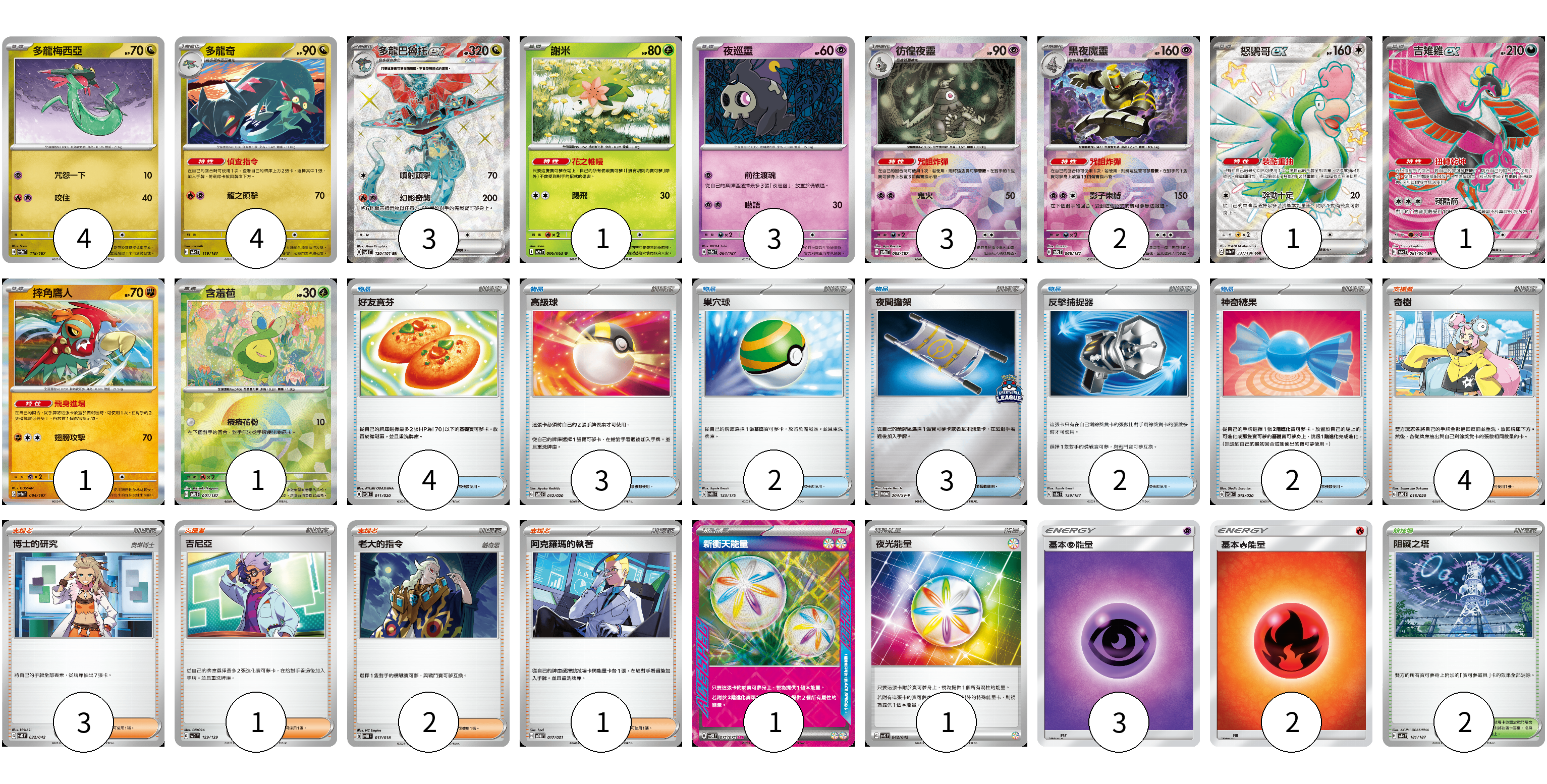 牌組構築方案 以此牌組為基礎新構築牌組 顯示卡面 顯示列表 寶可夢卡(24) 4 4 3 1 3 3 2 1 1 1 1 物品卡(16) 4 3 2 3 2 2 支援者卡(11) 4 3 1 2 1 競技場卡(2) 2 能量卡(7) 1 1 3 2 寶可夢卡(24) 卡牌名稱 張數 卡牌名稱 張數 多龍梅西亞 SV8a 118/187 04 多龍奇 SV8a 119/187 04 多龍巴魯托ex SV6 120/101 03 謝米 SV9a 006/063 01 夜巡靈 SV8a 064/187 03 彷徨夜靈 SV8a 065/187 03 黑夜魔靈 SV8a 066/187 02 怒鸚哥ex SV4a 337/190 01 吉雉雞ex SV6a 081/064 01 摔角鷹人 SV8a 084/187 01 含羞苞 SV8a 001/187 01 物品卡(16) 卡牌名稱 張數 卡牌名稱 張數 好友寶芬 SVOD 011/020 04 高級球 SVOD 012/020 03 巢穴球 SVM 133/175 02 夜間擔架 SV-P 204/SV-P 03 反擊捕捉器 SV8a 139/187 02 神奇糖果 SVOD 013/020 02 支援者卡(11) 卡牌名稱 張數 卡牌名稱 張數 奇樹 SVOD 016/020 04 博士的研究 SVK 032/042 03 吉尼亞 SVD 129/139 01 老大的指令 SVTH 017/018 02 阿克羅瑪的執著 SVOM 017/021 01 競技場卡(2) 卡牌名稱 張數 卡牌名稱 張數 阻礙之塔 SV8a 181/187 02 能量卡(7) 卡牌名稱 張數 卡牌名稱 張數 新衝天能量 SV5K 071/071 01 夜光能量 SVK 042/042 01 基本超能量 AS6D PSY 03 基本火能量 AS6D FIR 02 以此牌組為基礎新構築牌組 牌組編碼 KijnKD-SSYzsh-XASDnY copy 列印牌組單 牌組編碼已複製 分享至SNS