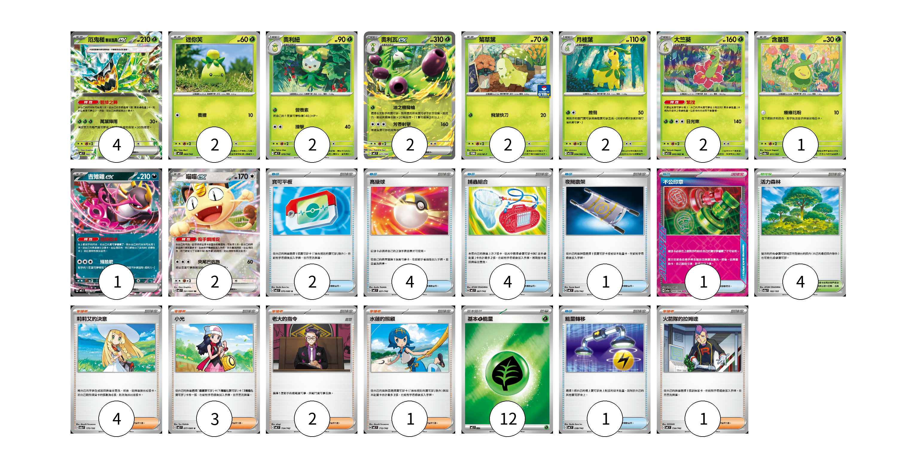 牌組構築方案 以此牌組為基礎新構築牌組 顯示卡面 顯示列表 寶可夢卡(20) 4 2 2 2 2 2 2 1 1 2 物品卡(13) 2 4 4 1 1 1 支援者卡(11) 4 3 2 1 1 競技場卡(4) 4 能量卡(12) 12 寶可夢卡(20) 卡牌名稱 張數 卡牌名稱 張數 厄鬼椪 碧草面具ex MC 082/742 04 迷你芙 MC 069/742 02 奧利紐 MC 070/742 02 奧利瓦ex MC 071/742 02 菊草葉 M-P 012/M-P 02 月桂葉 M1S 004/063 02 大竺葵 M1S 005/063 02 含羞苞 M2a 011/193 01 吉雉雞ex MC 489/742 01 喵喵ex M3 061/080 02 物品卡(13) 卡牌名稱 張數 卡牌名稱 張數 寶可平板 M3 070/080 02 高級球 MC 651/742 04 捕蟲組合 MC 667/742 04 夜間擔架 MC 670/742 01 不公印章 SV5a 053/066 01 能量轉移 MC 638/742 01 支援者卡(11) 卡牌名稱 張數 卡牌名稱 張數 莉莉艾的決意 M2a 175/193 04 小光 M2 077/080 03 老大的指令 MC 724/742 02 水蓮的照顧 MC 712/742 01 火箭隊的拉姆達 MC 734/742 01 競技場卡(4) 卡牌名稱 張數 卡牌名稱 張數 活力森林 M2a 182/193 04 能量卡(12) 卡牌名稱 張數 卡牌名稱 張數 基本【草】能量 MC GRA 12 以此牌組為基礎新構築牌組 牌組編碼 KjgDPU-pKymwF-dEzERW copy 列印牌組單 牌組編碼已複製 分享至SNS