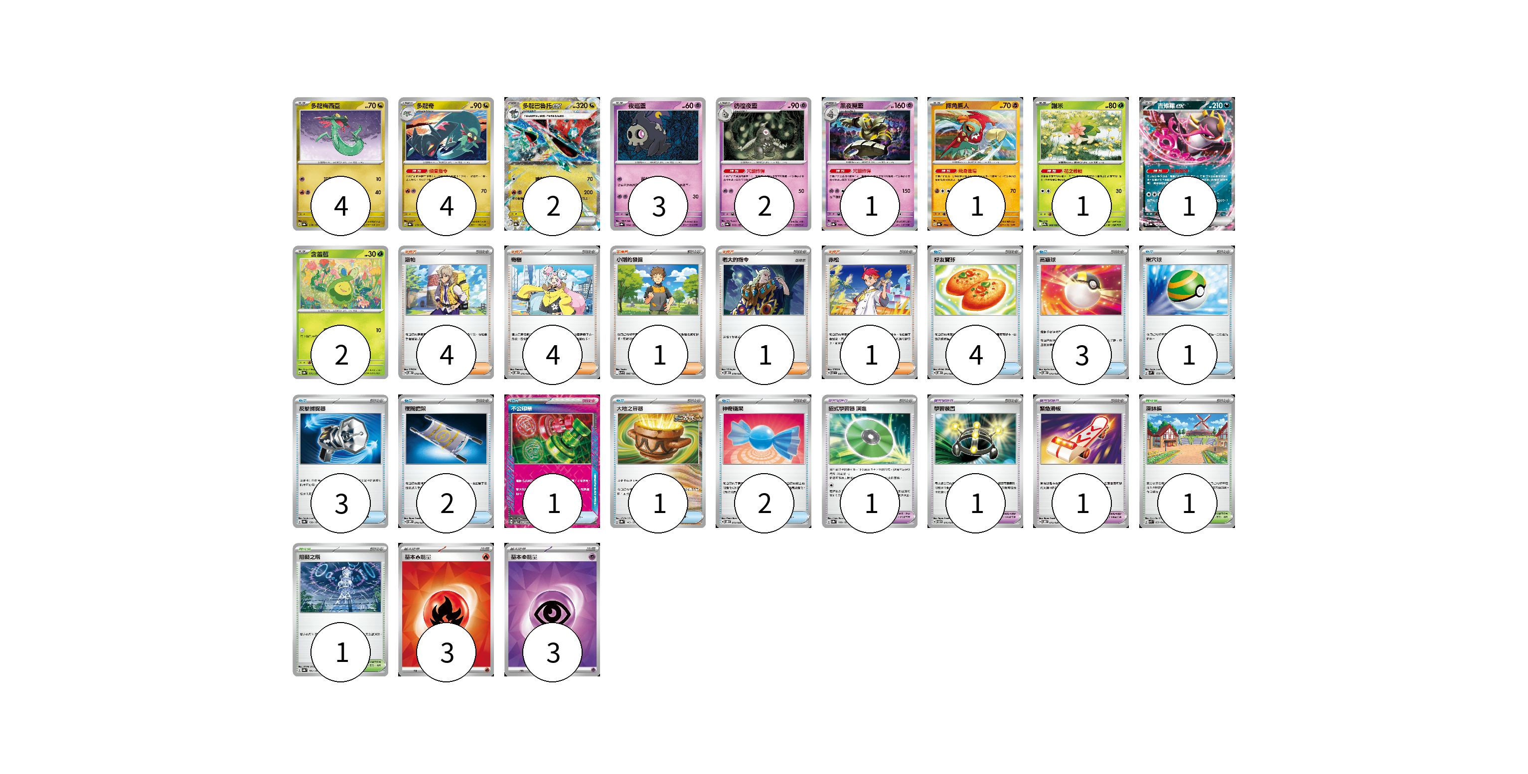 牌組構築方案 以此牌組為基礎新構築牌組 顯示卡面 顯示列表 寶可夢卡(21) 4 4 2 3 2 1 1 1 1 2 寶可夢道具(3) 1 1 1 物品卡(17) 4 3 1 3 2 1 1 2 支援者卡(11) 4 4 1 1 1 競技場卡(2) 1 1 能量卡(6) 3 3 寶可夢卡(21) 卡牌名稱 張數 卡牌名稱 張數 多龍梅西亞 SV8a 118/187 04 多龍奇 SV8a 119/187 04 多龍巴魯托ex SV8a 120/187 02 夜巡靈 SV8a 064/187 03 彷徨夜靈 SV8a 065/187 02 黑夜魔靈 SV8a 066/187 01 摔角鷹人 SV8a 084/187 01 謝米 SV9a 006/063 01 吉雉雞ex SV8a 104/187 01 含羞苞 SV8a 001/187 02 寶可夢道具(3) 卡牌名稱 張數 卡牌名稱 張數 招式學習器 演進 SV8a 160/187 01 學習裝置 SVTM 016/022 01 緊急滑板 SVOD 015/020 01 物品卡(17) 卡牌名稱 張數 卡牌名稱 張數 好友寶芬 SVOD 011/020 04 高級球 SVOD 012/020 03 巢穴球 SVM 133/175 01 反擊捕捉器 SV8a 139/187 03 夜間擔架 SVOM 016/021 02 不公印章 SV5a 053/066 01 大地之容器 SV8a 143/187 01 神奇糖果 SVOD 013/020 02 支援者卡(11) 卡牌名稱 張數 卡牌名稱 張數 派帕 SVOD 018/020 04 奇樹 SVOD 016/020 04 小剛的發掘 SV9 096/100 01 老大的指令 SVOD 019/020 01 赤松 SV7 097/102 01 競技場卡(2) 卡牌名稱 張數 卡牌名稱 張數 深缽鎮 SVK 039/042 01 阻礙之塔 SV8a 181/187 01 能量卡(6) 卡牌名稱 張數 卡牌名稱 張數 基本【火】能量 SVK FIR 03 基本【超】能量 SVK PSY 03 以此牌組為基礎新構築牌組 牌組編碼 KkBodB-dtFolB-BOKRBk copy 列印牌組單 牌組編碼已複製 分享至SNS
