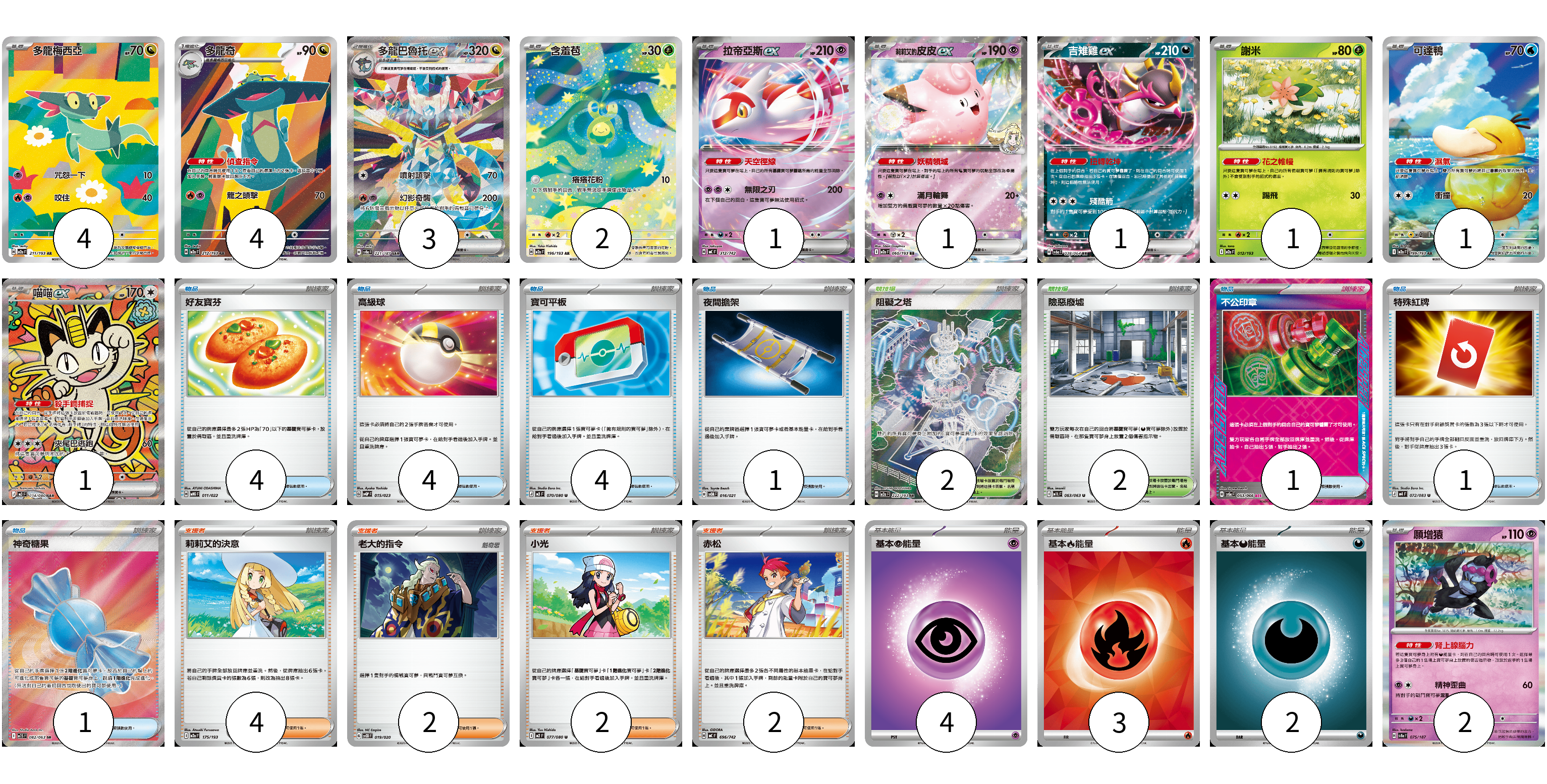 牌組構築方案 以此牌組為基礎新構築牌組 顯示卡面 顯示列表 寶可夢卡(21) 4 4 3 2 1 1 1 1 1 1 2 物品卡(16) 4 4 4 1 1 1 1 支援者卡(10) 4 2 2 2 競技場卡(4) 2 2 能量卡(9) 4 3 2 寶可夢卡(21) 卡牌名稱 張數 卡牌名稱 張數 多龍梅西亞 M2a 211/193 04 多龍奇 M2a 212/193 04 多龍巴魯托ex SV8a 221/187 03 含羞苞 M2a 196/193 02 拉帝亞斯ex MC 312/742 01 莉莉艾的皮皮ex M2a 060/193 01 吉雉雞ex SV6a 038/064 01 謝米 M2a 012/193 01 可達鴨 M2a 199/193 01 喵喵ex M3 114/080 01 願增猿 SV8a 075/187 02 物品卡(16) 卡牌名稱 張數 卡牌名稱 張數 好友寶芬 MBG 011/022 04 高級球 SVQP 015/023 04 寶可平板 M3 070/080 04 夜間擔架 SVOM 016/021 01 不公印章 SV5a 053/066 01 特殊紅牌 M4 072/083 01 神奇糖果 M1S 082/063 01 支援者卡(10) 卡牌名稱 張數 卡牌名稱 張數 莉莉艾的決意 M2a 175/193 04 老大的指令 SVOD 019/020 02 小光 M2 077/080 02 赤松 MC 696/742 02 競技場卡(4) 卡牌名稱 張數 卡牌名稱 張數 阻礙之塔 M2a 222/193 02 險惡廢墟 M1L 063/063 02 能量卡(9) 卡牌名稱 張數 卡牌名稱 張數 基本【超】能量 M-P PSY 04 基本【火】能量 SVQL FIR 03 基本【惡】能量 MC DAR 02 以此牌組為基礎新構築牌組 牌組編碼 KlPKJu-jDpVca-WYNJir copy 列印牌組單 牌組編碼已複製 分享至SNS