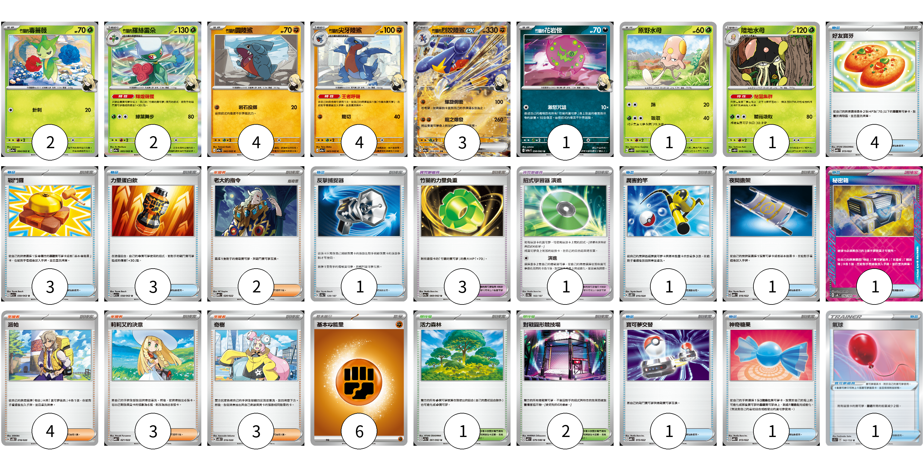 牌組構築方案 以此牌組為基礎新構築牌組 顯示卡面 顯示列表 寶可夢卡(18) 2 2 4 4 3 1 1 1 寶可夢道具(5) 3 1 1 物品卡(16) 4 3 3 1 1 1 1 1 1 支援者卡(12) 2 4 3 3 競技場卡(3) 1 2 能量卡(6) 6 寶可夢卡(18) 卡牌名稱 張數 卡牌名稱 張數 <竹蘭的>毒薔薇 SV9a 004/063 02 <竹蘭的>羅絲雷朵 SV9a 005/063 02 <竹蘭的>圓陸鯊 SV9a 042/063 04 <竹蘭的>尖牙陸鯊 SV9a 043/063 04 <竹蘭的>烈咬陸鯊ex SV9a 044/063 03 <竹蘭的>花岩怪 SV9a 050/063 01 原野水母 SV4M 007/066 01 陸地水母 SV4M 008/066 01 寶可夢道具(5) 卡牌名稱 張數 卡牌名稱 張數 竹蘭的力量負重 SV9a 060/063 03 招式學習器 演進 SV8a 160/187 01 氣球 SC1b 142/153 01 物品卡(16) 卡牌名稱 張數 卡牌名稱 張數 好友寶芬 MBD 013/022 04 戰鬥鑼 M1L 059/063 03 力量蛋白飲 M1L 058/063 03 反擊捕捉器 SV8a 139/187 01 厲害釣竿 SVOD 010/020 01 夜間擔架 MBD 016/022 01 秘密箱 SV6 092/101 01 寶可夢交替 MBG 015/022 01 神奇糖果 MBG 013/022 01 支援者卡(12) 卡牌名稱 張數 卡牌名稱 張數 老大的指令 MBD 020/022 02 派帕 SVOD 018/020 04 莉莉艾的決意 MBD 021/022 03 奇樹 SVOD 016/020 03 競技場卡(3) 卡牌名稱 張數 卡牌名稱 張數 活力森林 M1S 061/063 01 對戰圓形競技場 M2 079/080 02 能量卡(6) 卡牌名稱 張數 卡牌名稱 張數 基本【鬥】能量 M-P FIG 06 以此牌組為基礎新構築牌組 牌組編碼 KmchEQ-gClMzd-BPZHGz copy 列印牌組單 牌組編碼已複製 分享至SNS