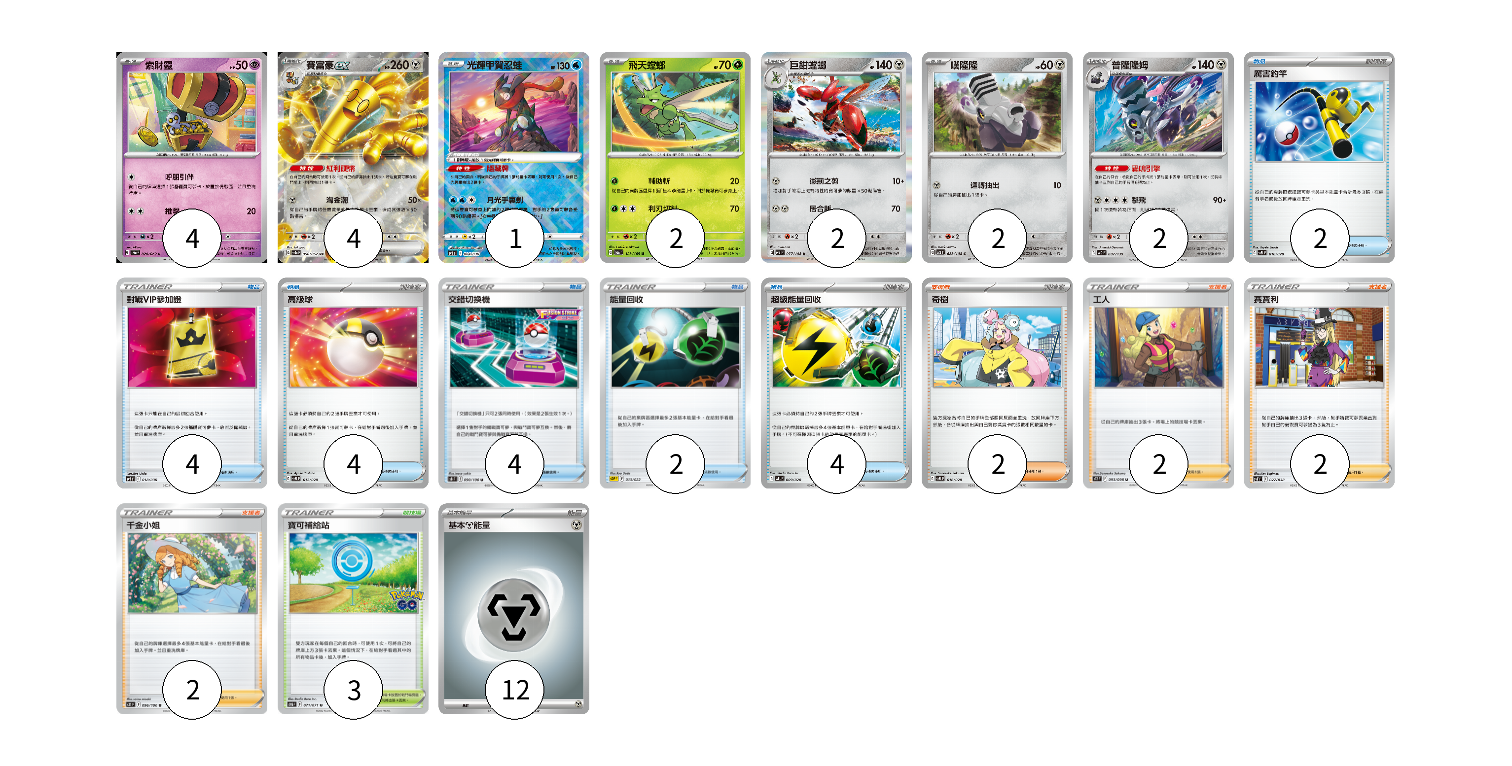 牌組構築方案 以此牌組為基礎新構築牌組 顯示卡面 顯示列表 寶可夢卡(19) 4 4 1 2 2 2 2 2 物品卡(18) 4 4 4 2 4 支援者卡(8) 2 2 2 2 競技場卡(3) 3 能量卡(12) 12 寶可夢卡(19) 卡牌名稱 張數 卡牌名稱 張數 索財靈 SV3a 020/062 04 賽富豪ex SV3a 050/062 04 光輝甲賀忍蛙 SVF 004/038 01 飛天螳螂 SV2a 123/165 02 巨鉗螳螂 SV3 077/108 02 噗隆隆 SV3 083/108 02 普隆隆姆 SVD 087/139 02 厲害釣竿 SVEL 010/020 02 物品卡(18) 卡牌名稱 張數 卡牌名稱 張數 對戰VIP參加證 SVF 018/038 04 高級球 SVEL 012/020 04 交錯切換機 S8 090/100 04 能量回收 SDP 013/022 02 超級能量回收 SVEL 009/020 04 支援者卡(8) 卡牌名稱 張數 卡牌名稱 張數 奇樹 SVEL 016/020 02 工人 S12 093/098 02 賽寶利 SVF 027/038 02 千金小姐 S11 096/100 02 競技場卡(3) 卡牌名稱 張數 卡牌名稱 張數 寶可補給站 S10b 071/071 03 能量卡(12) 卡牌名稱 張數 卡牌名稱 張數 基本【鋼】能量 SVF MET 12 以此牌組為基礎新構築牌組 牌組編碼 KnLNSJ-fjtMWI-eIEYwy copy 列印牌組單 牌組編碼已複製 分享至SNS
