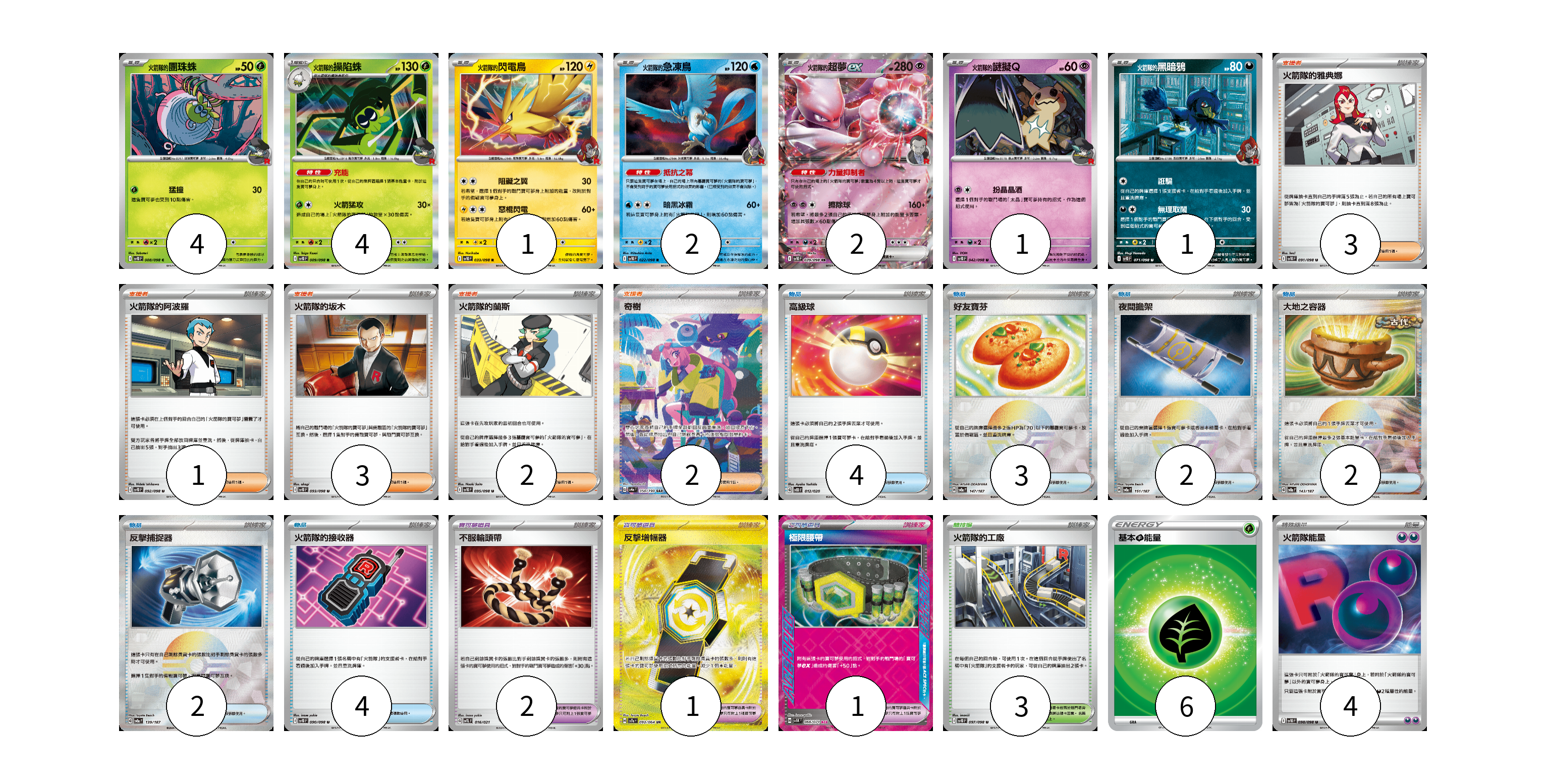 牌組構築方案 以此牌組為基礎新構築牌組 顯示卡面 顯示列表 寶可夢卡(15) 4 4 1 2 2 1 1 寶可夢道具(4) 2 1 1 物品卡(17) 4 3 2 2 2 4 支援者卡(11) 3 1 3 2 2 競技場卡(3) 3 能量卡(10) 6 4 寶可夢卡(15) 卡牌名稱 張數 卡牌名稱 張數 <火箭隊的>團珠蛛 SV10 008/098 04 <火箭隊的>操陷蛛 SV10 009/098 04 <火箭隊的>閃電鳥 SV10 033/098 01 <火箭隊的>急凍鳥 SV10 022/098 02 <火箭隊的>超夢ex SV10 039/098 02 <火箭隊的>謎擬Q SV10 042/098 01 <火箭隊的>黑暗鴉 SV10 071/098 01 寶可夢道具(4) 卡牌名稱 張數 卡牌名稱 張數 不服輸頭帶 SVTL 016/021 02 反擊增幅器 SV7a 093/064 01 極限腰帶 SV5K 066/071 01 物品卡(17) 卡牌名稱 張數 卡牌名稱 張數 高級球 SVOD 012/020 04 好友寶芬 SV8a 147/187 03 夜間擔架 SV8a 151/187 02 大地之容器 SV8a 143/187 02 反擊捕捉器 SV8a 139/187 02 火箭隊的接收器 SV10 090/098 04 支援者卡(11) 卡牌名稱 張數 卡牌名稱 張數 火箭隊的雅典娜 SV10 091/098 03 火箭隊的阿波羅 SV10 092/098 01 火箭隊的坂木 SV10 093/098 03 火箭隊的蘭斯 SV10 095/098 02 奇樹 SV4a 350/190 02 競技場卡(3) 卡牌名稱 張數 卡牌名稱 張數 火箭隊的工廠 SV10 097/098 03 能量卡(10) 卡牌名稱 張數 卡牌名稱 張數 基本【草】能量 SI GRA 06 火箭隊能量 SV10 098/098 04 以此牌組為基礎新構築牌組 牌組編碼 KnfwmT-TbLWoD-ZtjGYU copy 列印牌組單 牌組編碼已複製 分享至SNS