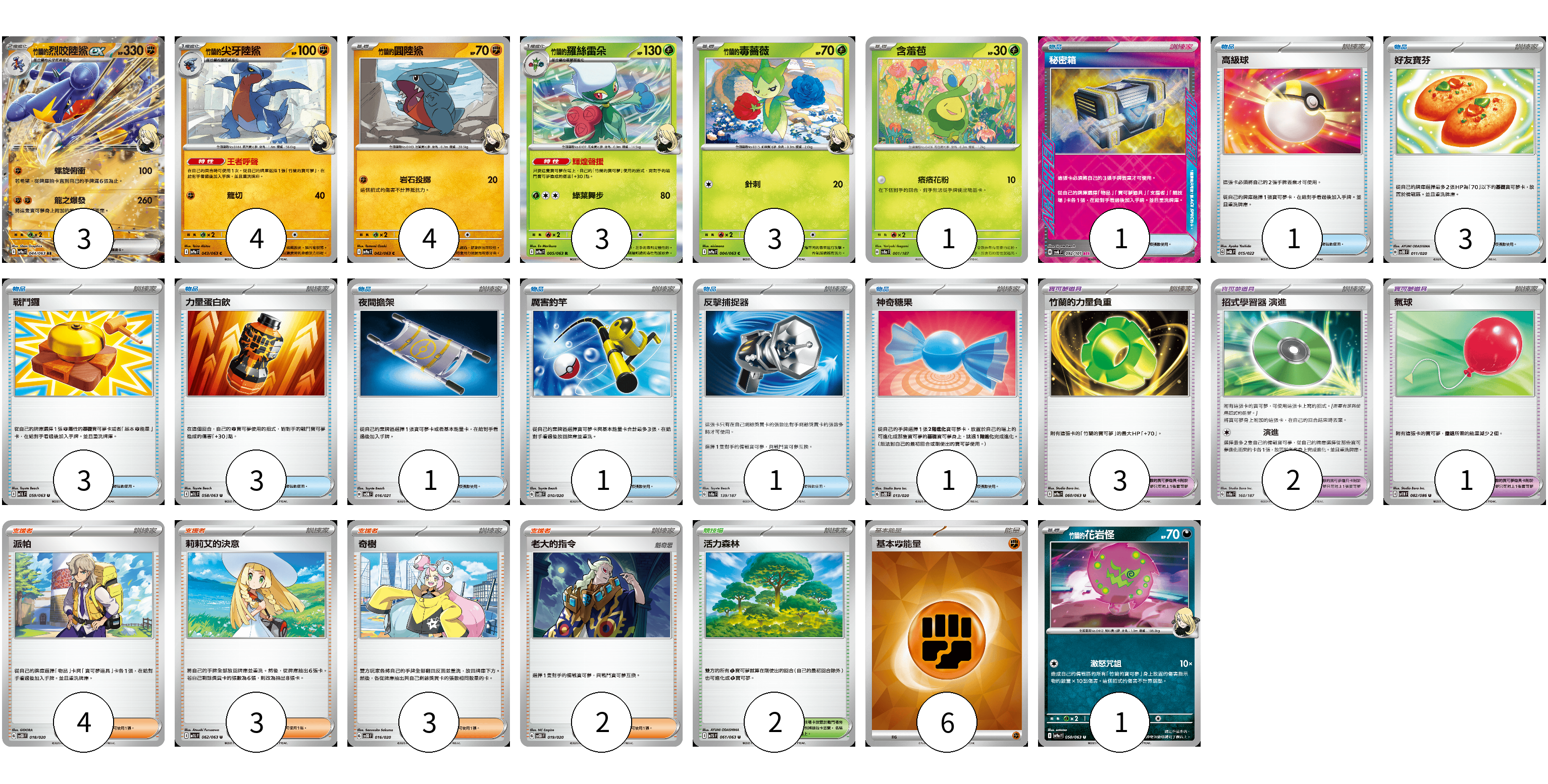 牌組構築方案 以此牌組為基礎新構築牌組 顯示卡面 顯示列表 寶可夢卡(19) 3 4 4 3 3 1 1 寶可夢道具(6) 3 2 1 物品卡(15) 1 1 3 3 3 1 1 1 1 支援者卡(12) 4 3 3 2 競技場卡(2) 2 能量卡(6) 6 寶可夢卡(19) 卡牌名稱 張數 卡牌名稱 張數 <竹蘭的>烈咬陸鯊ex SV9a 044/063 03 <竹蘭的>尖牙陸鯊 SV9a 043/063 04 <竹蘭的>圓陸鯊 SV9a 042/063 04 <竹蘭的>羅絲雷朵 SV9a 005/063 03 <竹蘭的>毒薔薇 SV9a 004/063 03 含羞苞 SV8a 001/187 01 <竹蘭的>花岩怪 SV9a 050/063 01 寶可夢道具(6) 卡牌名稱 張數 卡牌名稱 張數 竹蘭的力量負重 SV9a 060/063 03 招式學習器 演進 SV8a 160/187 02 氣球 SV11B 082/086 01 物品卡(15) 卡牌名稱 張數 卡牌名稱 張數 秘密箱 SV6 092/101 01 高級球 SVQL 015/022 01 好友寶芬 SVOD 011/020 03 戰鬥鑼 M1L 059/063 03 力量蛋白飲 M1L 058/063 03 夜間擔架 SVOM 016/021 01 厲害釣竿 SVOD 010/020 01 反擊捕捉器 SV8a 139/187 01 神奇糖果 SVOD 013/020 01 支援者卡(12) 卡牌名稱 張數 卡牌名稱 張數 派帕 SVOD 018/020 04 莉莉艾的決意 M1L 062/063 03 奇樹 SVOD 016/020 03 老大的指令 SVOD 019/020 02 競技場卡(2) 卡牌名稱 張數 卡牌名稱 張數 活力森林 M1S 061/063 02 能量卡(6) 卡牌名稱 張數 卡牌名稱 張數 基本【鬥】能量 SVM FIG 06 以此牌組為基礎新構築牌組 牌組編碼 KrWnkx-WcSgrz-aKjWfb copy 列印牌組單 牌組編碼已複製 分享至SNS