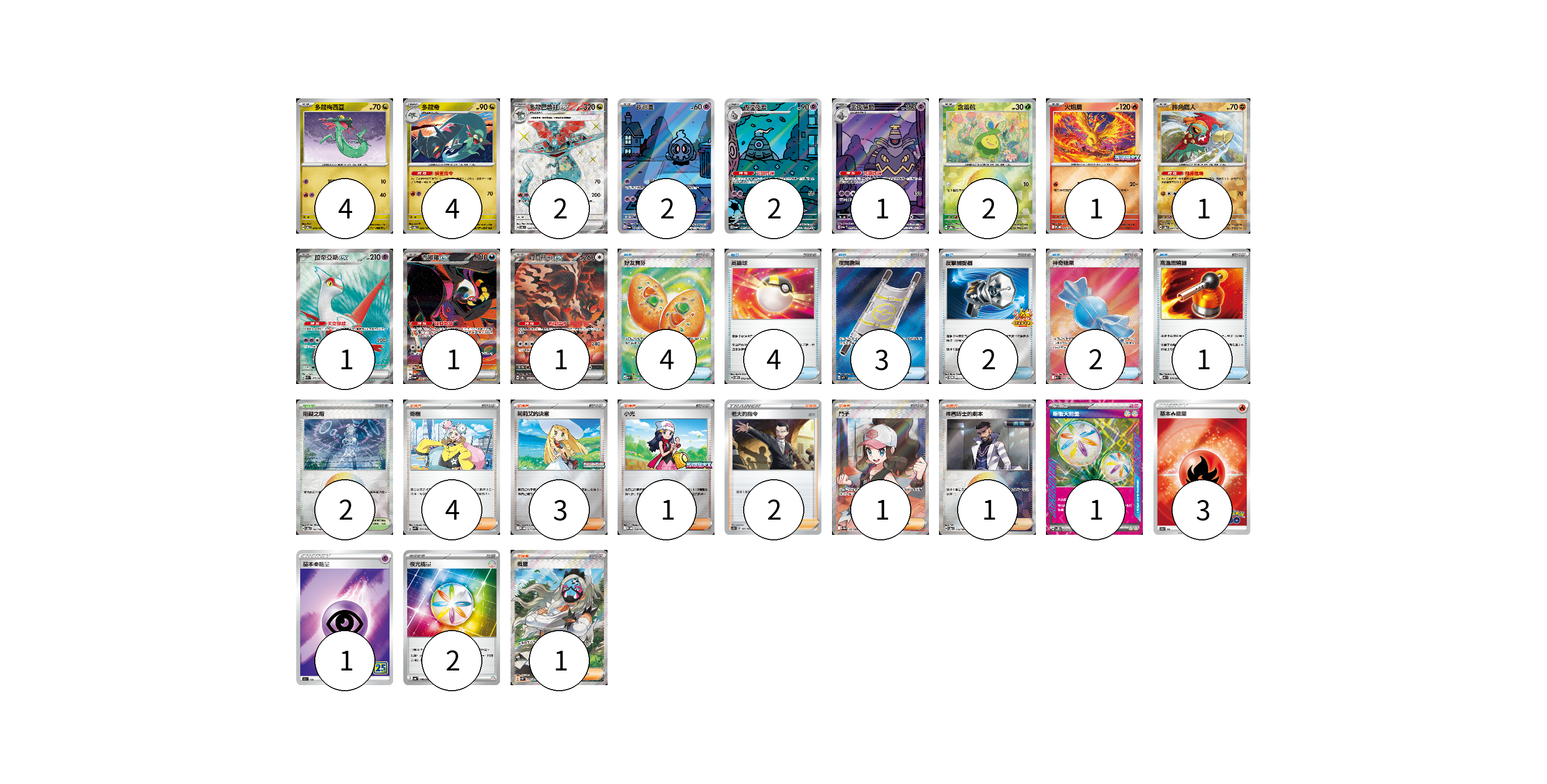 牌組構築方案 以此牌組為基礎新構築牌組 顯示卡面 顯示列表 寶可夢卡(22) 4 4 2 2 2 1 2 1 1 1 1 1 物品卡(16) 4 4 3 2 2 1 支援者卡(13) 4 3 1 2 1 1 1 競技場卡(2) 2 能量卡(7) 1 3 1 2 寶可夢卡(22) 卡牌名稱 張數 卡牌名稱 張數 多龍梅西亞 SV6 079/101 04 多龍奇 SV6 080/101 04 多龍巴魯托ex SV6 120/101 02 夜巡靈 SV6a 068/064 02 彷徨夜靈 SV6a 069/064 02 黑夜魔靈 SV6a 070/064 01 含羞苞 SV8a 001/187 02 火焰鳥 M-P 022/M-P 01 摔角鷹人 SV8a 084/187 01 拉帝亞斯ex SV7a 078/064 01 吉雉雞ex SV6a 089/064 01 月月熊 赫月ex SV8a 225/187 01 物品卡(16) 卡牌名稱 張數 卡牌名稱 張數 好友寶芬 M1S 081/063 04 高級球 SVOM 013/021 04 夜間擔架 M1L 083/063 03 反擊捕捉器 SV-P 083/SV-P 02 神奇糖果 M1S 082/063 02 高溫燃燒器 M2 074/080 01 支援者卡(13) 卡牌名稱 張數 卡牌名稱 張數 奇樹 SVK 031/042 04 莉莉艾的決意 M-P 011/M-P 03 小光 M-P 028/M-P 01 老大的指令(坂木) SC1D 161/164 02 鬥子 SV11W 166/086 01 弗圖博士的劇本 SV8a 175/187 01 枇琶 SV5K 091/071 01 競技場卡(2) 卡牌名稱 張數 卡牌名稱 張數 阻礙之塔 SV8a 181/187 02 能量卡(7) 卡牌名稱 張數 卡牌名稱 張數 新衝天能量 SV5K 071/071 01 基本火能量 S10b FIR 03 基本超能量 S8a PSY 01 夜光能量 SV4a 190/190 02 以此牌組為基礎新構築牌組 牌組編碼 KrmmFQ-eWPfLu-rySQVk copy 列印牌組單 牌組編碼已複製 分享至SNS