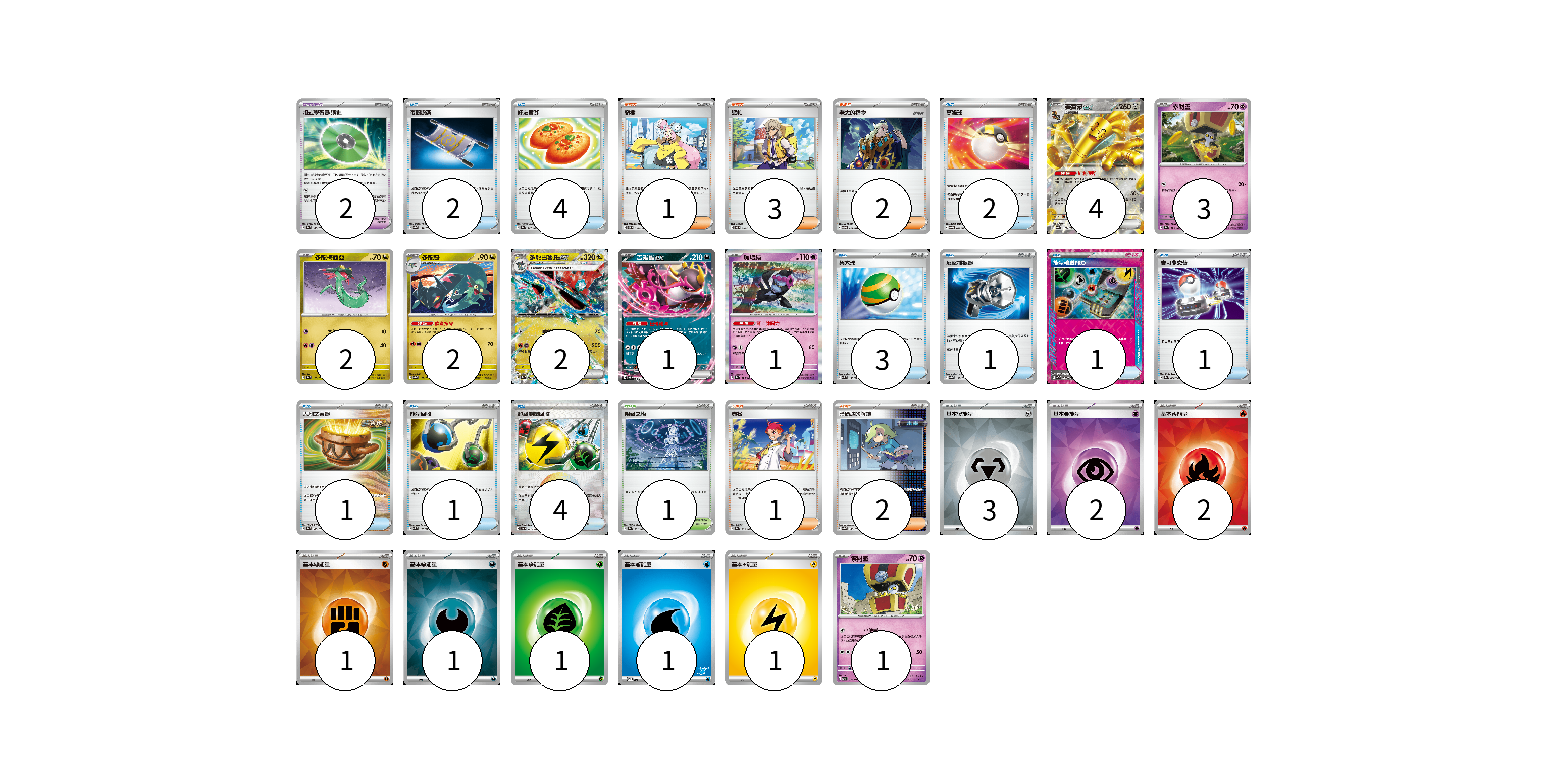 牌組構築方案 以此牌組為基礎新構築牌組 顯示卡面 顯示列表 寶可夢卡(16) 4 3 2 2 2 1 1 1 寶可夢道具(2) 2 物品卡(20) 2 4 2 3 1 1 1 1 1 4 支援者卡(9) 1 3 2 1 2 競技場卡(1) 1 能量卡(12) 3 2 2 1 1 1 1 1 寶可夢卡(16) 卡牌名稱 張數 卡牌名稱 張數 賽富豪ex SV8a 117/187 04 索財靈 SV8a 073/187 03 多龍梅西亞 SV8a 118/187 02 多龍奇 SV8a 119/187 02 多龍巴魯托ex SV8a 120/187 02 吉雉雞ex SVOD 004/020 01 願增猿 SV8a 075/187 01 索財靈 SV7a 024/064 01 寶可夢道具(2) 卡牌名稱 張數 卡牌名稱 張數 招式學習器 演進 SV8a 160/187 02 物品卡(20) 卡牌名稱 張數 卡牌名稱 張數 夜間擔架 SV8a 151/187 02 好友寶芬 SV8a 147/187 04 高級球 SVOM 013/021 02 巢穴球 SVM 133/175 03 反擊捕捉器 SV8a 139/187 01 能量輸送PRO SV7a 052/064 01 寶可夢交替 SV9a 058/063 01 大地之容器 SV8a 143/187 01 能量回收 SVM 125/175 01 超級能量回收 SV8a 141/187 04 支援者卡(9) 卡牌名稱 張數 卡牌名稱 張數 奇樹 SVOM 018/021 01 派帕 SVOD 018/020 03 老大的指令 SVOD 019/020 02 赤松 SV8a 163/187 01 暗碼迷的解讀 SV8a 165/187 02 競技場卡(1) 卡牌名稱 張數 卡牌名稱 張數 阻礙之塔 SV8a 181/187 01 能量卡(12) 卡牌名稱 張數 卡牌名稱 張數 基本【鋼】能量 SVOD MET 03 基本【超】能量 SVOD PSY 02 基本【火】能量 SVK FIR 02 基本【鬥】能量 SVK FIG 01 基本【惡】能量 SVK DAR 01 基本【草】能量 SVTM GRA 01 基本【水】能量 SVI WAT 01 基本【雷】能量 SVTR LIG 01 以此牌組為基礎新構築牌組 牌組編碼 KsIKQt-TPgKrd-cxGZpy copy 列印牌組單 牌組編碼已複製 分享至SNS