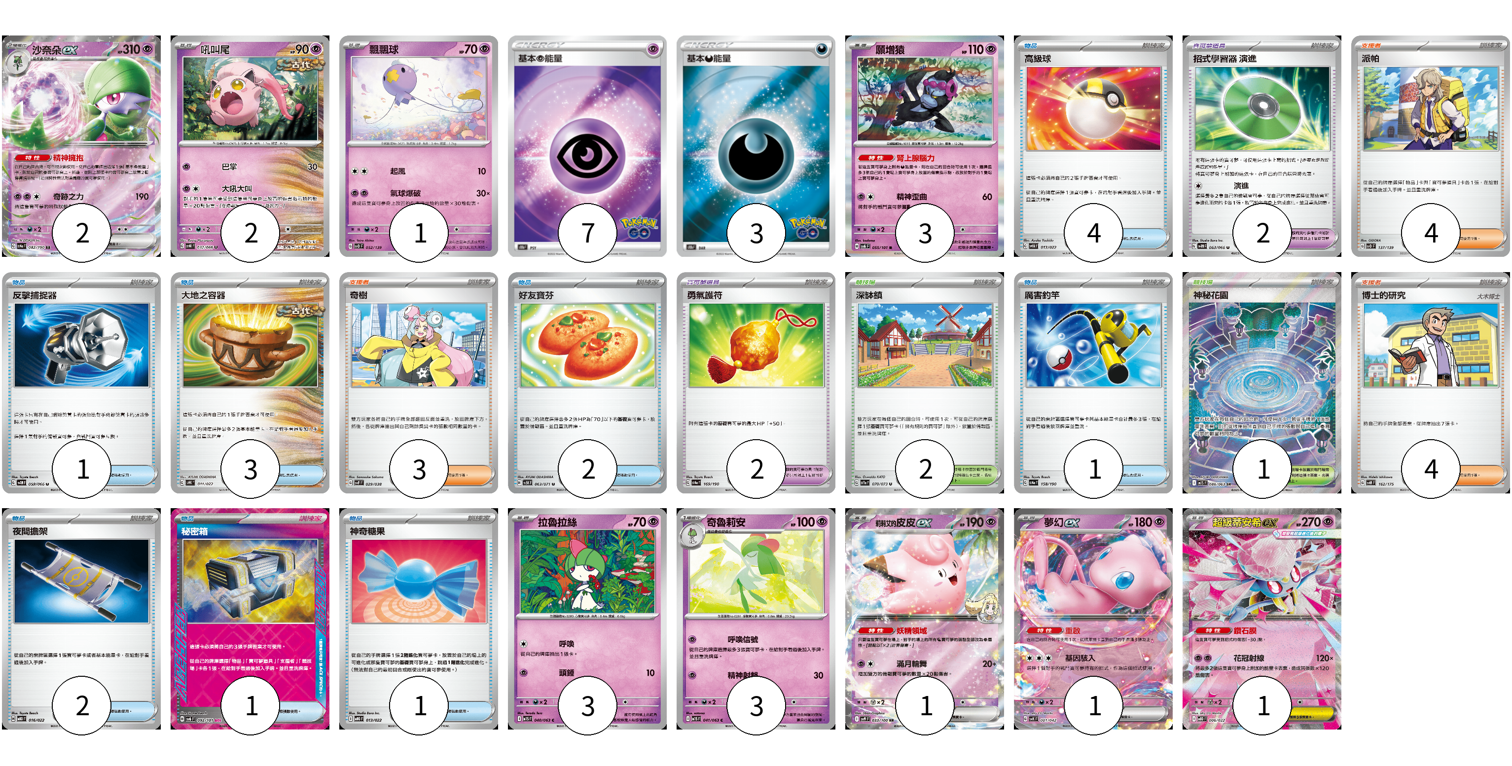 牌組構築方案 以此牌組為基礎新構築牌組 顯示卡面 顯示列表 寶可夢卡(17) 2 2 1 3 3 3 1 1 1 寶可夢道具(4) 2 2 物品卡(15) 4 1 3 2 1 2 1 1 支援者卡(11) 4 3 4 競技場卡(3) 2 1 能量卡(10) 7 3 寶可夢卡(17) 卡牌名稱 張數 卡牌名稱 張數 沙奈朵ex SV4a 082/190 02 吼叫尾 SV4K 032/066 02 飄飄球 SVD 052/139 01 願增猿 SV6 055/101 03 拉魯拉絲 M1S 040/063 03 奇魯莉安 M1S 041/063 03 莉莉艾的皮皮ex SV9 033/100 01 夢幻ex SVK 001/042 01 超級蒂安希ex MBD 006/022 01 寶可夢道具(4) 卡牌名稱 張數 卡牌名稱 張數 招式學習器 演進 SV4M 063/066 02 勇氣護符 SV4a 169/190 02 物品卡(15) 卡牌名稱 張數 卡牌名稱 張數 高級球 SVHM 013/022 04 反擊捕捉器 SV4M 059/066 01 大地之容器 SVHK 011/022 03 好友寶芬 SV5K 063/071 02 厲害釣竿 SV4a 158/190 01 夜間擔架 MBD 016/022 02 秘密箱 SV6 092/101 01 神奇糖果 MBG 013/022 01 支援者卡(11) 卡牌名稱 張數 卡牌名稱 張數 派帕 SVD 137/139 04 奇樹 SVF 029/038 03 博士的研究 SVM 162/175 04 競技場卡(3) 卡牌名稱 張數 卡牌名稱 張數 深缽鎮 SV1a 070/073 02 神秘花園 M1S 086/063 01 能量卡(10) 卡牌名稱 張數 卡牌名稱 張數 基本超能量 S10b PSY 07 基本惡能量 S10b DAR 03 以此牌組為基礎新構築牌組 牌組編碼 KssQXW-TSDTUG-mbbJGh copy 列印牌組單 牌組編碼已複製 分享至SNS