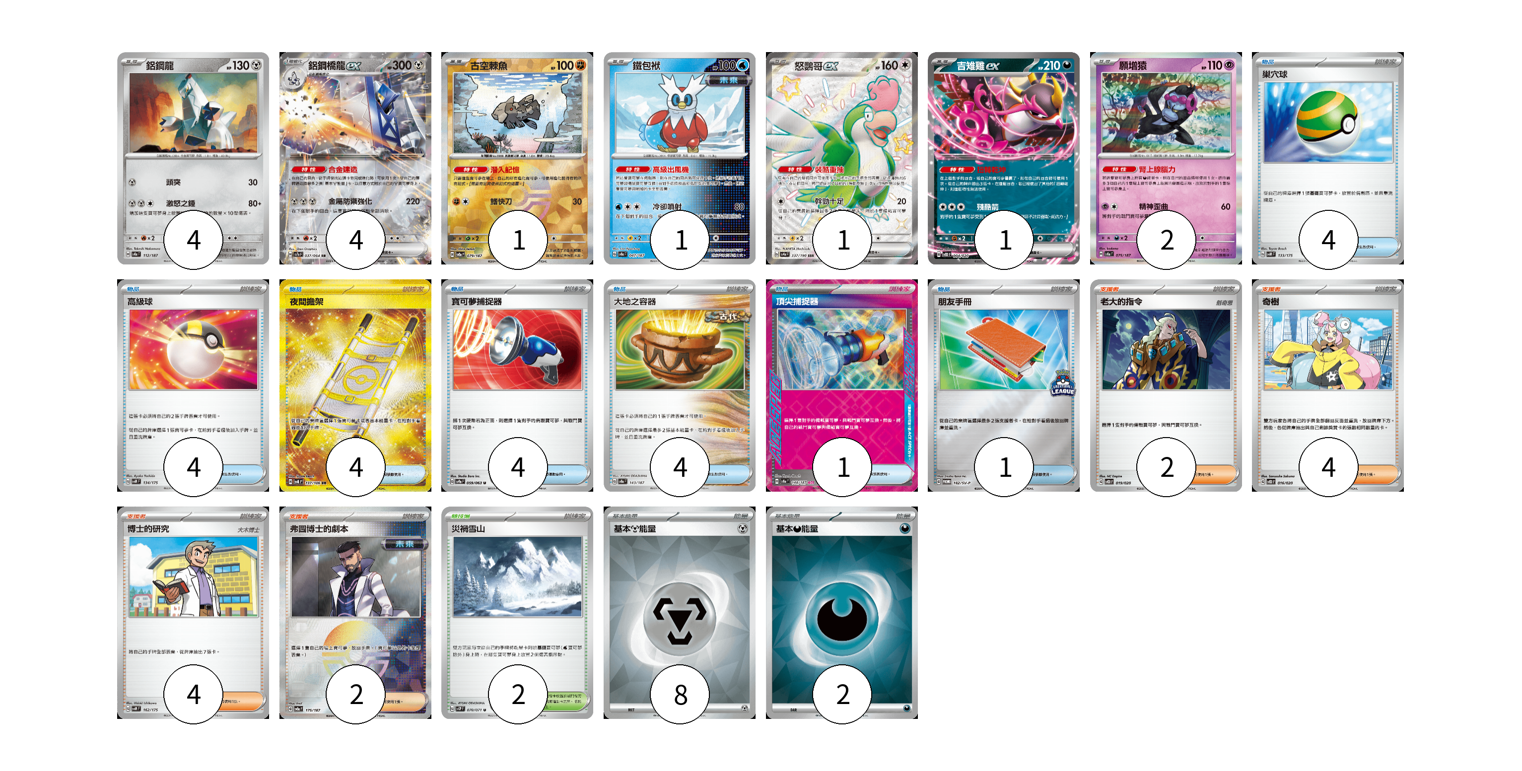 牌組構築方案 以此牌組為基礎新構築牌組 顯示卡面 顯示列表 寶可夢卡(14) 4 4 1 1 1 1 2 物品卡(22) 4 4 4 4 4 1 1 支援者卡(12) 2 4 4 2 競技場卡(2) 2 能量卡(10) 8 2 寶可夢卡(14) 卡牌名稱 張數 卡牌名稱 張數 鋁鋼龍 SV8a 112/187 04 鋁鋼橋龍ex SV7a 037/064 04 古空棘魚 SV8a 079/187 01 鐵包袱 SV8a 047/187 01 怒鸚哥ex SV4a 337/190 01 吉雉雞ex SVOD 004/020 01 願增猿 SV8a 075/187 02 物品卡(22) 卡牌名稱 張數 卡牌名稱 張數 巢穴球 SVM 133/175 04 高級球 SVM 134/175 04 夜間擔架 SV8 137/106 04 寶可夢捕捉器 SV9a 059/063 04 大地之容器 SV8a 143/187 04 頂尖捕捉器 SV8a 148/187 01 朋友手冊 SV-P 182/SV-P 01 支援者卡(12) 卡牌名稱 張數 卡牌名稱 張數 老大的指令 SVOD 019/020 02 奇樹 SVOD 016/020 04 博士的研究 SVM 162/175 04 弗圖博士的劇本 SV8a 175/187 02 競技場卡(2) 卡牌名稱 張數 卡牌名稱 張數 災禍雪山 SV2P 070/071 02 能量卡(10) 卡牌名稱 張數 卡牌名稱 張數 基本【鋼】能量 SVOD MET 08 基本【惡】能量 SVOM DAR 02 以此牌組為基礎新構築牌組 牌組編碼 KtQpGx-wSYTIM-ZaEEEm copy 列印牌組單 牌組編碼已複製 分享至SNS