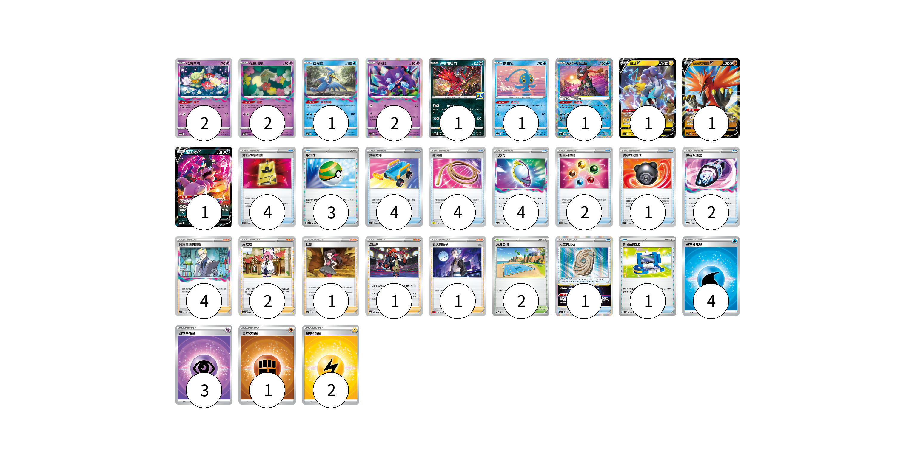 牌組構築方案 以此牌組為基礎新構築牌組 顯示卡面 顯示列表 寶可夢卡(13) 2 2 1 2 1 1 1 1 1 1 寶可夢道具(1) 1 物品卡(25) 4 3 4 4 4 2 1 2 1 支援者卡(9) 4 2 1 1 1 競技場卡(2) 2 能量卡(10) 4 3 1 2 寶可夢卡(13) 卡牌名稱 張數 卡牌名稱 張數 花療環環 S12a 064/172 02 花療環環 S11 049/100 02 古月鳥 S11 033/100 01 勾魂眼 S11 044/100 02 伊裴爾塔爾 S8a 013/028 01 瑪納霏 S12a 029/172 01 光輝甲賀忍蛙 S12a 033/172 01 雷公V SI 137/414 01 伽勒爾 閃電鳥V S5a 037/070 01 龍王蠍V S12a 085/172 01 寶可夢道具(1) 卡牌名稱 張數 卡牌名稱 張數 天空封印石 S12a 146/172 01 物品卡(25) 卡牌名稱 張數 卡牌名稱 張數 對戰VIP參加證 S8 091/100 04 巢穴球 SVB 001/028 03 交替推車 S10D 060/067 04 離洞繩 SDP 012/022 04 幻想門 S12a 141/172 04 能量回收器 S5R 062/070 02 洗翠的沉重球 S10P 062/067 01 放逐吸塵器 S12a 144/172 02 寶可裝置3.0 SVB 004/028 01 支援者卡(9) 卡牌名稱 張數 卡牌名稱 張數 阿克羅瑪的實驗 S11 095/100 04 克拉拉 SVB 019/028 02 杜娟 S9a 065/067 01 奇巴納 SVB 018/028 01 老大的指令(赤日) SDL 021/021 01 競技場卡(2) 卡牌名稱 張數 卡牌名稱 張數 海灘場地 SV1S 078/078 02 能量卡(10) 卡牌名稱 張數 卡牌名稱 張數 基本【水】能量 SI WAT 04 基本【超】能量 SI PSY 03 基本【鬥】能量 SI FIG 01 基本【雷】能量 SI LIG 02 以此牌組為基礎新構築牌組 牌組編碼 KukIsj-LQCBwQ-MOEwNW copy 列印牌組單 牌組編碼已複製 分享至SNS