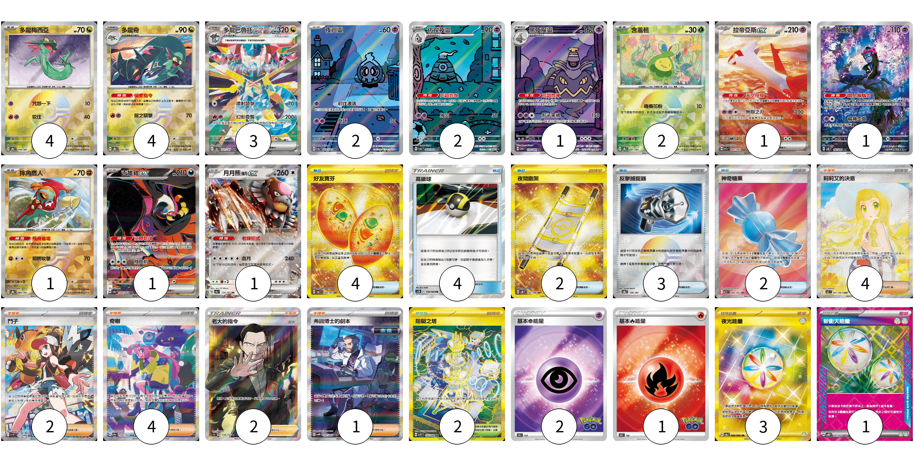 牌組構築方案 以此牌組為基礎新構築牌組 顯示卡面 顯示列表 寶可夢卡(23) 4 4 3 2 2 1 2 1 1 1 1 1 物品卡(15) 4 4 2 3 2 支援者卡(13) 4 2 4 2 1 競技場卡(2) 2 能量卡(7) 2 1 3 1 寶可夢卡(23) 卡牌名稱 張數 卡牌名稱 張數 多龍梅西亞 SV8a 118/187 04 多龍奇 SV8a 119/187 04 多龍巴魯托ex SV8a 221/187 03 夜巡靈 SV6a 068/064 02 彷徨夜靈 SV6a 069/064 02 黑夜魔靈 SV6a 070/064 01 含羞苞 SV8a 001/187 02 拉帝亞斯ex SV7a 087/064 01 願增猿 SV6 107/101 01 摔角鷹人 SV8a 084/187 01 吉雉雞ex SV6a 089/064 01 月月熊 赫月ex SV8a 134/187 01 物品卡(15) 卡牌名稱 張數 卡牌名稱 張數 好友寶芬 SV6 133/101 04 高級球 AS5b 178/186 04 夜間擔架 SV8 137/106 02 反擊捕捉器 SV8a 139/187 03 神奇糖果 M1S 082/063 02 支援者卡(13) 卡牌名稱 張數 卡牌名稱 張數 莉莉艾的決意 M1L 091/063 04 鬥子 SV11W 173/086 02 奇樹 SV4a 350/190 04 老大的指令(坂木) SC1b 170/153 02 弗圖博士的劇本 SV4M 091/066 01 競技場卡(2) 卡牌名稱 張數 卡牌名稱 張數 阻礙之塔 SV10 132/098 02 能量卡(7) 卡牌名稱 張數 卡牌名稱 張數 基本超能量 S10b PSY 02 基本火能量 S10b FIR 01 夜光能量 SV5a 096/066 03 新衝天能量 SV5K 071/071 01 以此牌組為基礎新構築牌組 牌組編碼 KuprDA-KGtDoJ-MDFLnF copy 列印牌組單 牌組編碼已複製 分享至SNS