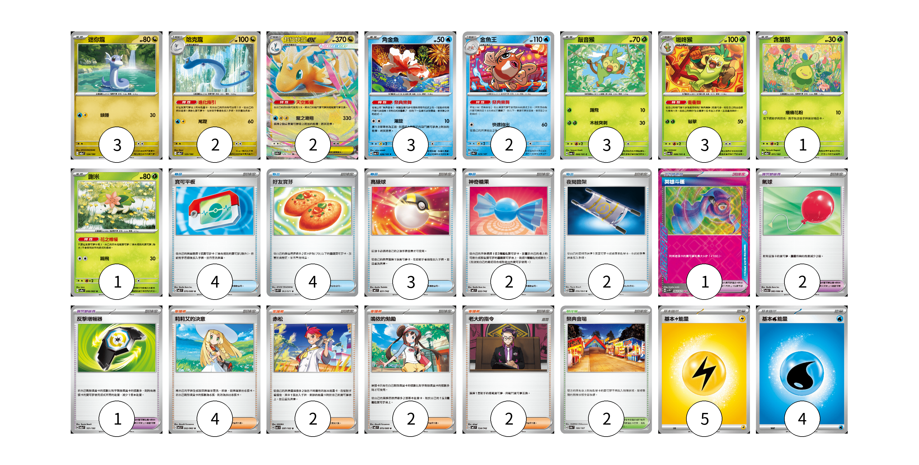 牌組構築方案 以此牌組為基礎新構築牌組 顯示卡面 顯示列表 寶可夢卡(20) 3 2 2 3 2 3 3 1 1 寶可夢道具(4) 1 2 1 物品卡(15) 4 4 3 2 2 支援者卡(10) 4 2 2 2 競技場卡(2) 2 能量卡(9) 5 4 寶可夢卡(20) 卡牌名稱 張數 卡牌名稱 張數 迷你龍 M2a 124/193 03 哈克龍 M2a 125/193 02 超級快龍ex M2a 126/193 02 角金魚 SV6 026/101 03 金魚王 SV8a 029/187 02 敲音猴 SV6 008/101 03 啪咚猴 SV6 009/101 03 含羞苞 M2a 011/193 01 謝米 SV9a 006/063 01 寶可夢道具(4) 卡牌名稱 張數 卡牌名稱 張數 英雄斗篷 SV5M 064/071 01 氣球 SV11B 082/086 02 反擊增幅器 M2a 161/193 01 物品卡(15) 卡牌名稱 張數 卡牌名稱 張數 寶可平板 M3 070/080 04 好友寶芬 SV5K 063/071 04 高級球 MC 651/742 03 神奇糖果 MC 655/742 02 夜間擔架 SV6a 056/064 02 支援者卡(10) 卡牌名稱 張數 卡牌名稱 張數 莉莉艾的決意 M1L 062/063 04 赤松 SV7 097/102 02 鳴依的勉勵 M3 075/080 02 老大的指令 MC 724/742 02 競技場卡(2) 卡牌名稱 張數 卡牌名稱 張數 祭典會場 SV8a 180/187 02 能量卡(9) 卡牌名稱 張數 卡牌名稱 張數 基本【雷】能量 MC LIG 05 基本【水】能量 MC WAT 04 以此牌組為基礎新構築牌組 牌組編碼 KvTLPX-UZKxlH-zUWNKq copy 列印牌組單 牌組編碼已複製 分享至SNS