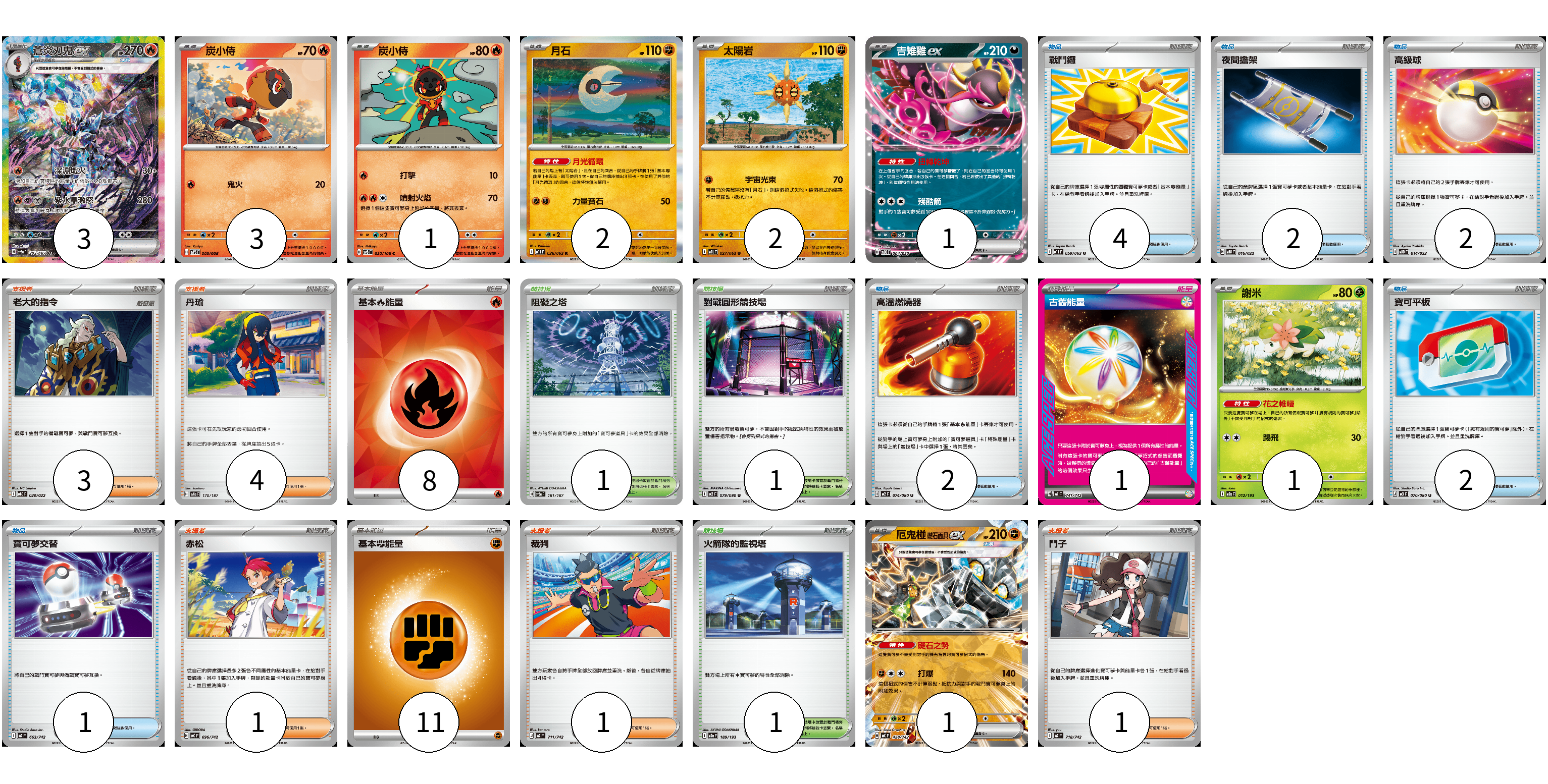 牌組構築方案 以此牌組為基礎新構築牌組 顯示卡面 顯示列表 寶可夢卡(14) 3 3 1 2 2 1 1 1 物品卡(13) 4 2 2 2 2 1 支援者卡(10) 3 4 1 1 1 競技場卡(3) 1 1 1 能量卡(20) 8 1 11 寶可夢卡(14) 卡牌名稱 張數 卡牌名稱 張數 蒼炎刃鬼ex SV8a 203/187 03 炭小侍 SVPS 005/008 03 炭小侍 SV8 020/106 01 月石 M1L 026/063 02 太陽岩 M1L 027/063 02 吉雉雞ex SVOD 004/020 01 謝米 M2a 012/193 01 厄鬼椪 礎石面具ex MC 428/742 01 物品卡(13) 卡牌名稱 張數 卡牌名稱 張數 戰鬥鑼 M1L 059/063 04 夜間擔架 MBD 016/022 02 高級球 MBD 014/022 02 高溫燃燒器 M2 074/080 02 寶可平板 M3 070/080 02 寶可夢交替 MC 663/742 01 支援者卡(10) 卡牌名稱 張數 卡牌名稱 張數 老大的指令 MBD 020/022 03 丹瑜 SV8a 170/187 04 赤松 MC 696/742 01 裁判 MC 711/742 01 鬥子 MC 718/742 01 競技場卡(3) 卡牌名稱 張數 卡牌名稱 張數 阻礙之塔 SV8a 181/187 01 對戰圓形競技場 M2 079/080 01 火箭隊的監視塔 M2a 189/193 01 能量卡(20) 卡牌名稱 張數 卡牌名稱 張數 基本【火】能量 SVQL FIR 08 古舊能量 MC 741/742 01 基本【鬥】能量 MC FIG 11 以此牌組為基礎新構築牌組 牌組編碼 KvtFyO-TWBIMs-qTXAaw copy 列印牌組單 牌組編碼已複製 分享至SNS