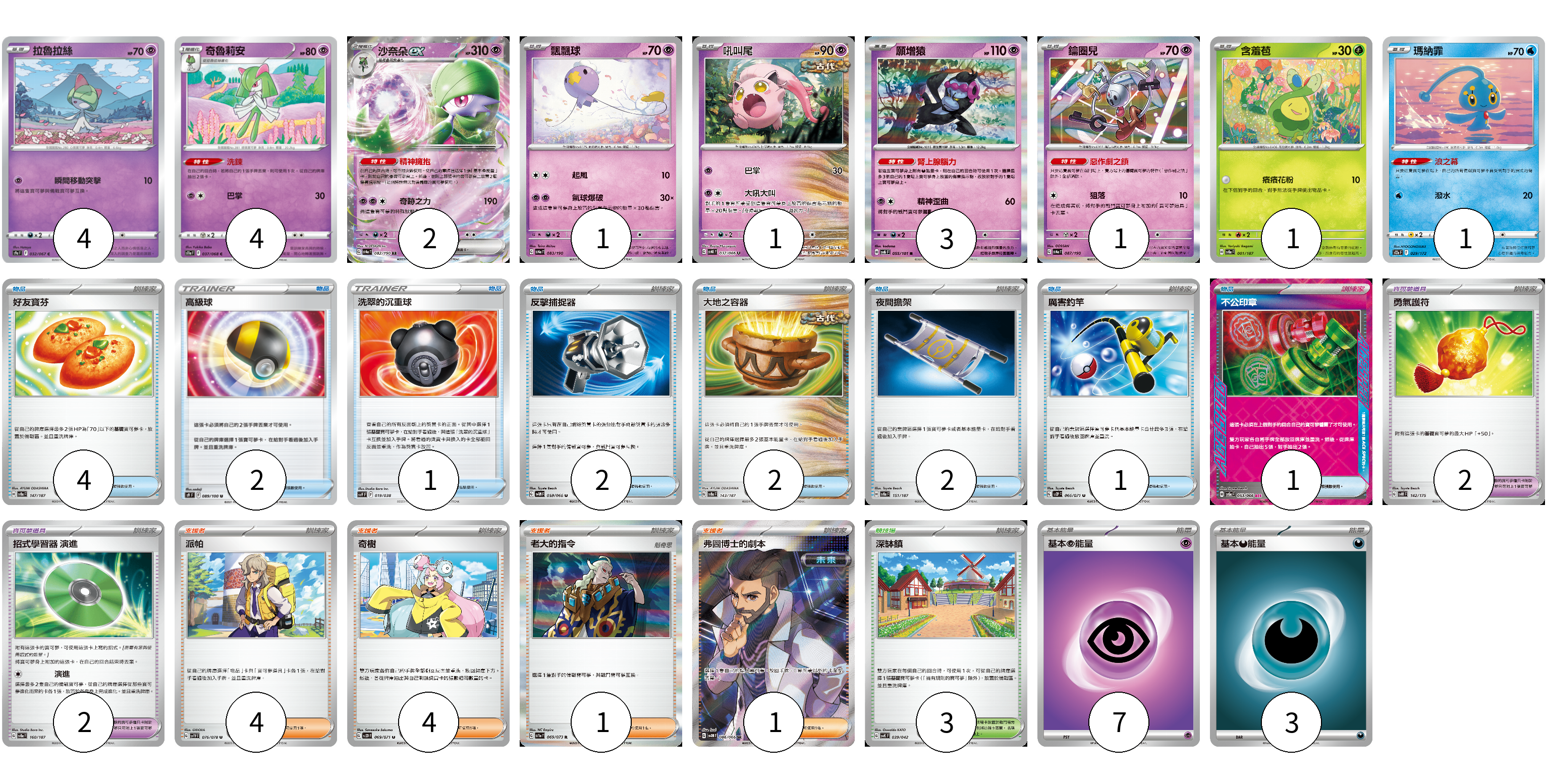 牌組構築方案 以此牌組為基礎新構築牌組 顯示卡面 顯示列表 寶可夢卡(18) 4 4 2 1 1 3 1 1 1 寶可夢道具(4) 2 2 物品卡(15) 4 2 1 2 2 2 1 1 支援者卡(10) 4 4 1 1 競技場卡(3) 3 能量卡(10) 7 3 寶可夢卡(18) 卡牌名稱 張數 卡牌名稱 張數 拉魯拉絲 S9a 032/067 04 奇魯莉安 S11a 037/068 04 沙奈朵ex SV4a 082/190 02 飄飄球 SV4a 083/190 01 吼叫尾 SV4K 032/066 01 願增猿 SV6 055/101 03 鑰圈兒 SV4a 087/190 01 含羞苞 SV8a 001/187 01 瑪納霏 S12a 029/172 01 寶可夢道具(4) 卡牌名稱 張數 卡牌名稱 張數 勇氣護符 SVM 142/175 02 招式學習器 演進 SV8a 160/187 02 物品卡(15) 卡牌名稱 張數 卡牌名稱 張數 好友寶芬 SV8a 147/187 04 高級球 S9 089/100 02 洗翠的沉重球 SVF 019/038 01 反擊捕捉器 SV4M 059/066 02 大地之容器 SV8a 143/187 02 夜間擔架 SV8a 151/187 02 厲害釣竿 SV2P 066/071 01 不公印章 SV5a 053/066 01 支援者卡(10) 卡牌名稱 張數 卡牌名稱 張數 派帕 SV1V 076/078 04 奇樹 SV2D 069/071 04 老大的指令 SV1a 069/073 01 弗圖博士的劇本 SV4M 086/066 01 競技場卡(3) 卡牌名稱 張數 卡牌名稱 張數 深缽鎮 SVK 039/042 03 能量卡(10) 卡牌名稱 張數 卡牌名稱 張數 基本【超】能量 SVEM PSY 07 基本【惡】能量 SVF DAR 03 以此牌組為基礎新構築牌組 牌組編碼 KyWwSN-kdhRIP-ZHGOfL copy 列印牌組單 牌組編碼已複製 分享至SNS