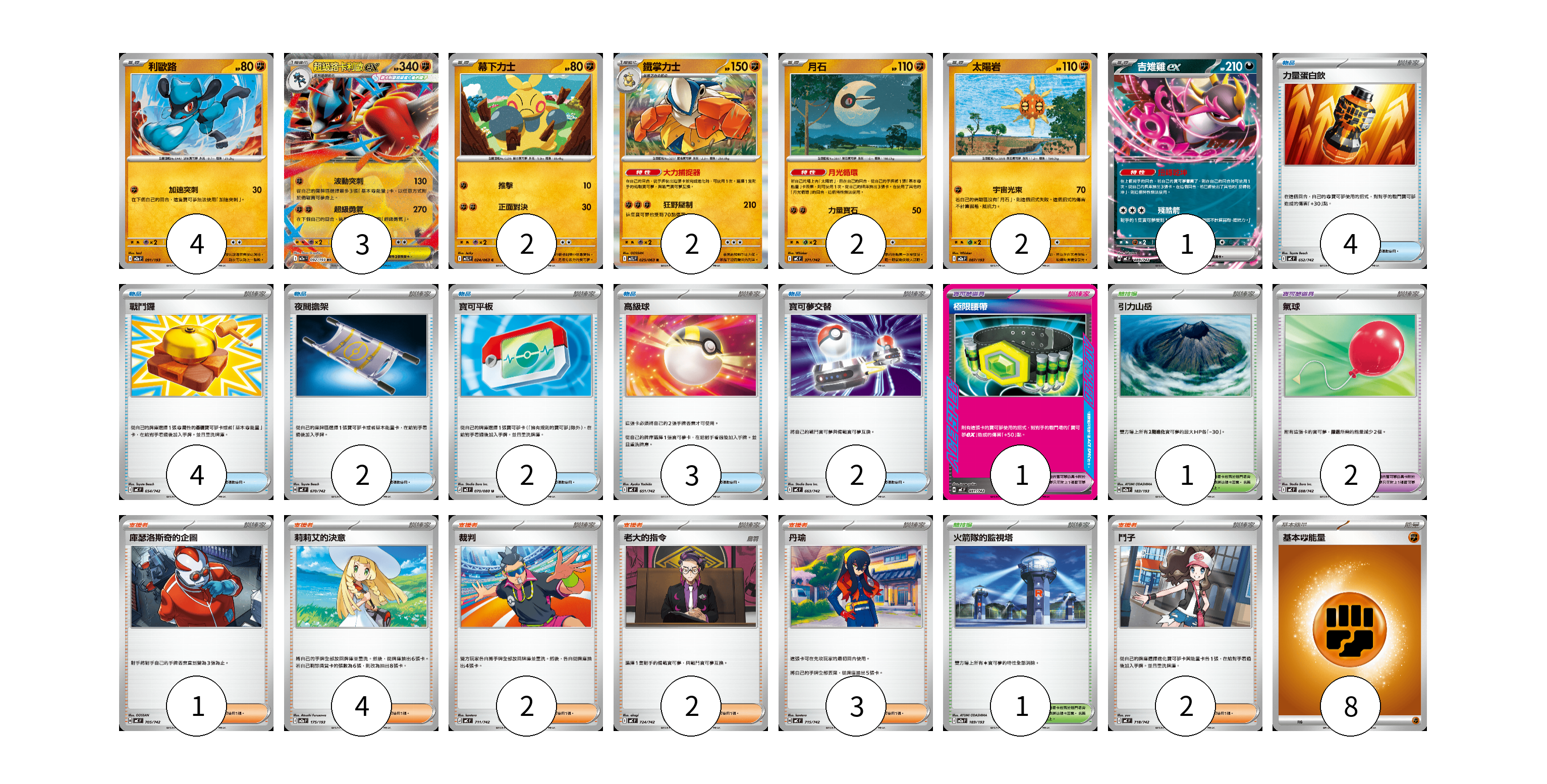 牌組構築方案 以此牌組為基礎新構築牌組 顯示卡面 顯示列表 寶可夢卡(16) 4 3 2 2 2 2 1 寶可夢道具(3) 1 2 物品卡(17) 4 4 2 2 3 2 支援者卡(14) 1 4 2 2 3 2 競技場卡(2) 1 1 能量卡(8) 8 寶可夢卡(16) 卡牌名稱 張數 卡牌名稱 張數 利歐路 M2a 091/193 04 超級路卡利歐ex M2a 092/193 03 幕下力士 M1L 024/063 02 鐵掌力士 M1L 025/063 02 月石 MC 371/742 02 太陽岩 M2a 087/193 02 吉雉雞ex MC 489/742 01 寶可夢道具(3) 卡牌名稱 張數 卡牌名稱 張數 極限腰帶 MC 691/742 01 氣球 MC 688/742 02 物品卡(17) 卡牌名稱 張數 卡牌名稱 張數 力量蛋白飲 MC 652/742 04 戰鬥鑼 MC 654/742 04 夜間擔架 MC 670/742 02 寶可平板 M3 070/080 02 高級球 MC 651/742 03 寶可夢交替 MC 663/742 02 支援者卡(14) 卡牌名稱 張數 卡牌名稱 張數 庫瑟洛斯奇的企圖 MC 705/742 01 莉莉艾的決意 M2a 175/193 04 裁判 MC 711/742 02 老大的指令 MC 724/742 02 丹瑜 MC 715/742 03 鬥子 MC 718/742 02 競技場卡(2) 卡牌名稱 張數 卡牌名稱 張數 引力山岳 M2a 183/193 01 火箭隊的監視塔 M2a 189/193 01 能量卡(8) 卡牌名稱 張數 卡牌名稱 張數 基本【鬥】能量 MC FIG 08 以此牌組為基礎新構築牌組 牌組編碼 LAYoup-DnQmiK-fEIWpX copy 列印牌組單 牌組編碼已複製 分享至SNS