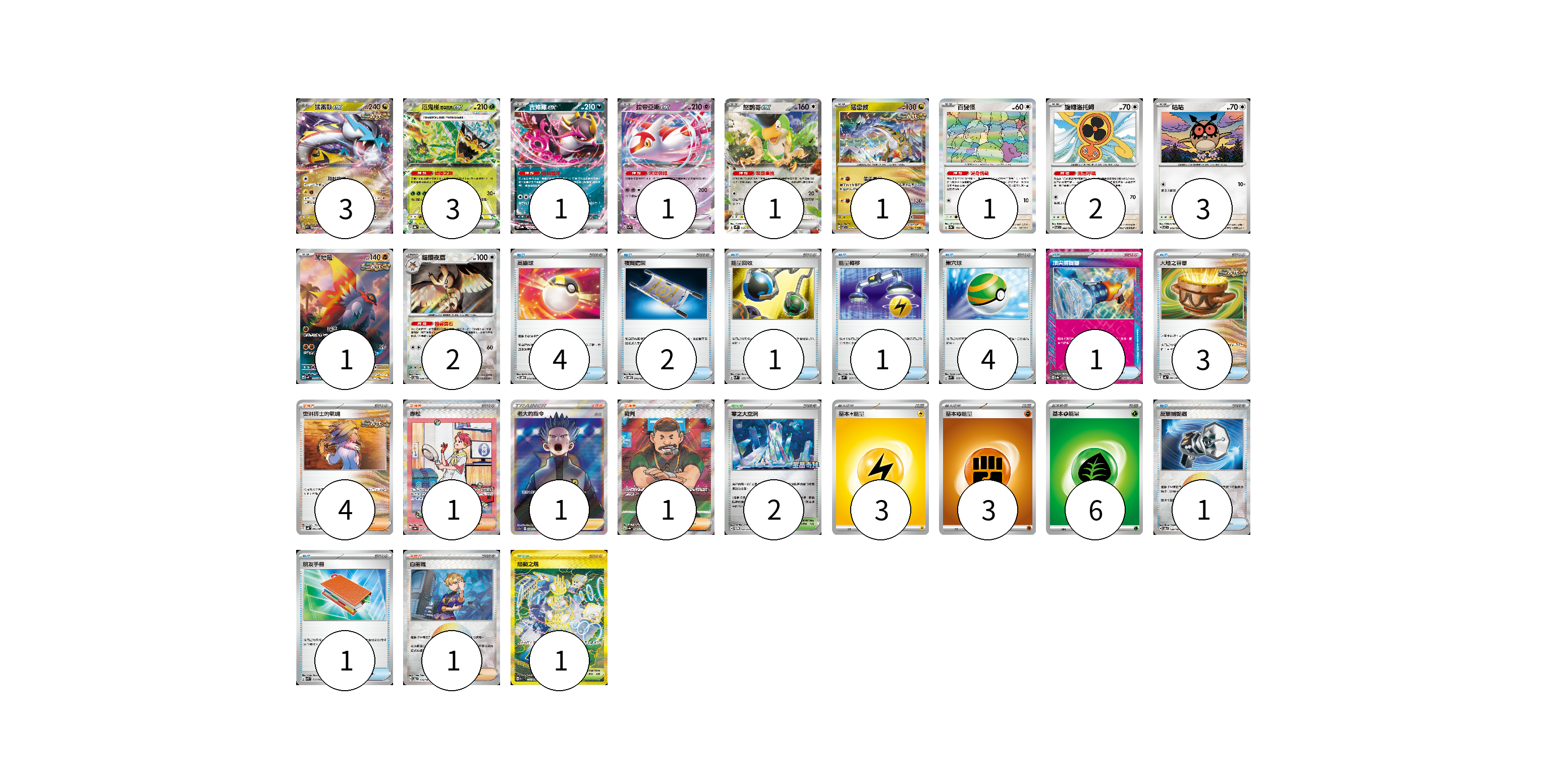 牌組構築方案 以此牌組為基礎新構築牌組 顯示卡面 顯示列表 寶可夢卡(19) 3 3 1 1 1 1 1 2 3 1 2 物品卡(18) 4 2 1 1 4 1 3 1 1 支援者卡(8) 4 1 1 1 1 競技場卡(3) 2 1 能量卡(12) 3 3 6 寶可夢卡(19) 卡牌名稱 張數 卡牌名稱 張數 猛雷鼓ex SV5K 053/071 03 厄鬼椪 碧草面具ex SV8a 020/187 03 吉雉雞ex SV8a 104/187 01 拉帝亞斯ex SV7a 019/064 01 怒鸚哥ex SV2P 065/071 01 猛雷鼓 SV7 075/102 01 百變怪 SV2a 132/165 01 旋轉洛托姆 SV7 080/102 02 咕咕 SV7 076/102 03 爬地翅 SV4K 074/066 01 貓頭夜鷹 SV8a 128/187 02 物品卡(18) 卡牌名稱 張數 卡牌名稱 張數 高級球 SVOD 012/020 04 夜間擔架 SVOM 016/021 02 能量回收 SVM 125/175 01 能量轉移 SVM 127/175 01 巢穴球 SVM 133/175 04 頂尖捕捉器 SV8a 148/187 01 大地之容器 SV4K 060/066 03 反擊捕捉器 SV8a 139/187 01 朋友手冊 SVK 014/042 01 支援者卡(8) 卡牌名稱 張數 卡牌名稱 張數 奧琳博士的氣魄 SV4K 064/066 04 赤松 SV8a 227/187 01 老大的指令(赤日) S12a 250/172 01 裁判 SV4a 342/190 01 白蕾雅 SV8a 176/187 01 競技場卡(3) 卡牌名稱 張數 卡牌名稱 張數 零之大空洞 SV-P 151/SV-P 02 阻礙之塔 SV10 132/098 01 能量卡(12) 卡牌名稱 張數 卡牌名稱 張數 基本【雷】能量 SVTR LIG 03 基本【鬥】能量 SVHK FIG 03 基本【草】能量 SVF GRA 06 以此牌組為基礎新構築牌組 牌組編碼 LDUdBC-vWUoTA-nyDJah copy 列印牌組單 牌組編碼已複製 分享至SNS