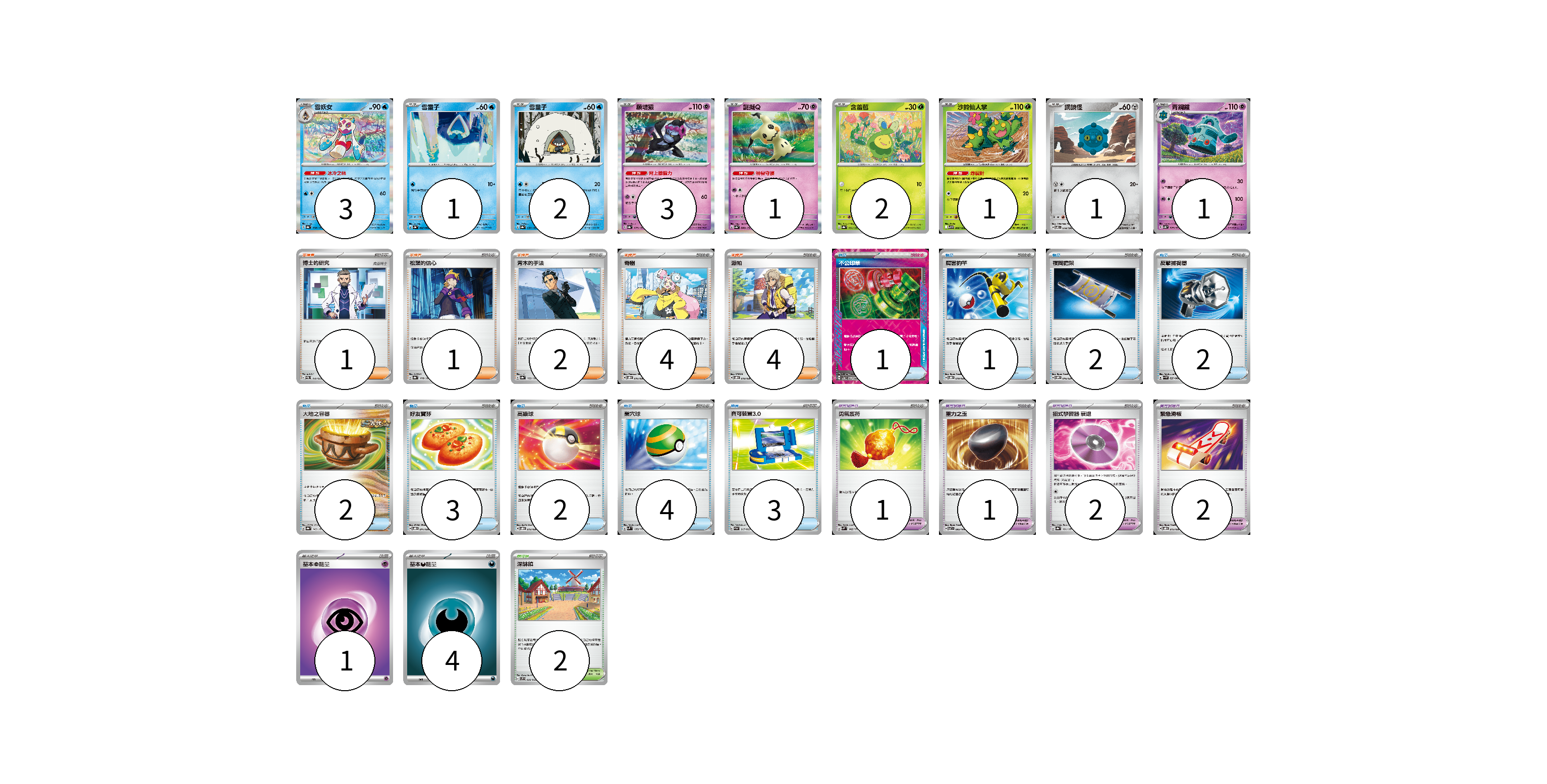 牌組構築方案 以此牌組為基礎新構築牌組 顯示卡面 顯示列表 寶可夢卡(15) 3 1 2 3 1 2 1 1 1 寶可夢道具(6) 1 1 2 2 物品卡(20) 1 1 2 2 2 3 2 4 3 支援者卡(12) 1 1 2 4 4 競技場卡(2) 2 能量卡(5) 1 4 寶可夢卡(15) 卡牌名稱 張數 卡牌名稱 張數 雪妖女 SV8a 038/187 03 雪童子 SV3a 005/062 01 雪童子 SV8a 037/187 02 願增猿 SV8a 075/187 03 謎擬Q SV4a 088/190 01 含羞苞 SV8a 001/187 02 沙鈴仙人掌 SV9 006/100 01 銅鏡怪 SV8 078/106 01 青銅鐘 SV5K 029/071 01 寶可夢道具(6) 卡牌名稱 張數 卡牌名稱 張數 勇氣護符 SVM 142/175 01 重力之玉 SV7 095/102 01 招式學習器 衰退 SV8a 161/187 02 緊急滑板 SVOD 015/020 02 物品卡(20) 卡牌名稱 張數 卡牌名稱 張數 不公印章 SV5a 053/066 01 厲害釣竿 SVOD 010/020 01 夜間擔架 SVOM 016/021 02 反擊捕捉器 SV4M 059/066 02 大地之容器 SV8a 143/187 02 好友寶芬 SVOD 011/020 03 高級球 SVOD 012/020 02 巢穴球 SVM 133/175 04 寶可裝置3.0 SVAM 017/023 03 支援者卡(12) 卡牌名稱 張數 卡牌名稱 張數 博士的研究 SVEM 019/020 01 松葉的信心 SV8a 178/187 01 青木的手法 SV8a 162/187 02 奇樹 SVOD 016/020 04 派帕 SVOD 018/020 04 競技場卡(2) 卡牌名稱 張數 卡牌名稱 張數 深缽鎮 SVF 036/038 02 能量卡(5) 卡牌名稱 張數 卡牌名稱 張數 基本超能量 sv-p PSY 01 基本惡能量 sv-p DAR 04 以此牌組為基礎新構築牌組 牌組編碼 LEPdNC-QWZnny-RamUQh copy 列印牌組單 牌組編碼已複製 分享至SNS