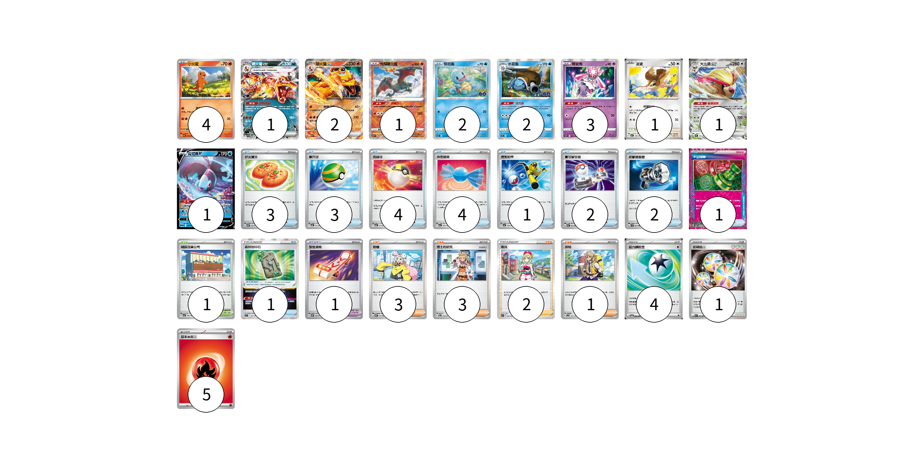 牌組構築方案 以此牌組為基礎新構築牌組 顯示卡面 顯示列表 寶可夢卡(18) 4 1 2 1 2 2 3 1 1 1 寶可夢道具(2) 1 1 物品卡(20) 3 3 4 4 1 2 2 1 支援者卡(9) 3 3 2 1 競技場卡(1) 1 能量卡(10) 4 1 5 寶可夢卡(18) 卡牌名稱 張數 卡牌名稱 張數 小火龍 SV4a 025/190 04 噴火龍ex SV3 066/108 01 噴火龍ex SV2a 006/165 02 光輝噴火龍 SVF 001/038 01 傑尼龜 S10b 015/071 02 水箭龜 S10b 017/071 02 蒂安希 S12a 063/172 03 波波 SV4a 137/190 01 大比鳥ex SV4a 139/190 01 霓虹魚V SVHK 004/022 01 寶可夢道具(2) 卡牌名稱 張數 卡牌名稱 張數 森林封印石 S12 092/098 01 緊急滑板 SV5K 064/071 01 物品卡(20) 卡牌名稱 張數 卡牌名稱 張數 好友寶芬 SV5K 063/071 03 巢穴球 SVHK 012/022 03 高級球 SVHK 013/022 04 神奇糖果 SV4a 163/190 04 厲害釣竿 SV4a 158/190 01 寶可夢交替 SV3a 054/062 02 反擊捕捉器 SV4M 059/066 02 不公印章 SV5a 053/066 01 支援者卡(9) 卡牌名稱 張數 卡牌名稱 張數 奇樹 SVHK 019/022 03 博士的研究 SVEL 018/020 03 珠貝 SVF 025/038 02 派帕 SVD 137/139 01 競技場卡(1) 卡牌名稱 張數 卡牌名稱 張數 城鎮百貨公司 SV4a 183/190 01 能量卡(10) 卡牌名稱 張數 卡牌名稱 張數 回力鏢能量 SV5a 066/066 04 反轉能量 SV2P 071/071 01 基本【火】能量 SVHK FIR 05 以此牌組為基礎新構築牌組 牌組編碼 LEoAAo-dnzljK-hjQufu copy 列印牌組單 牌組編碼已複製 分享至SNS