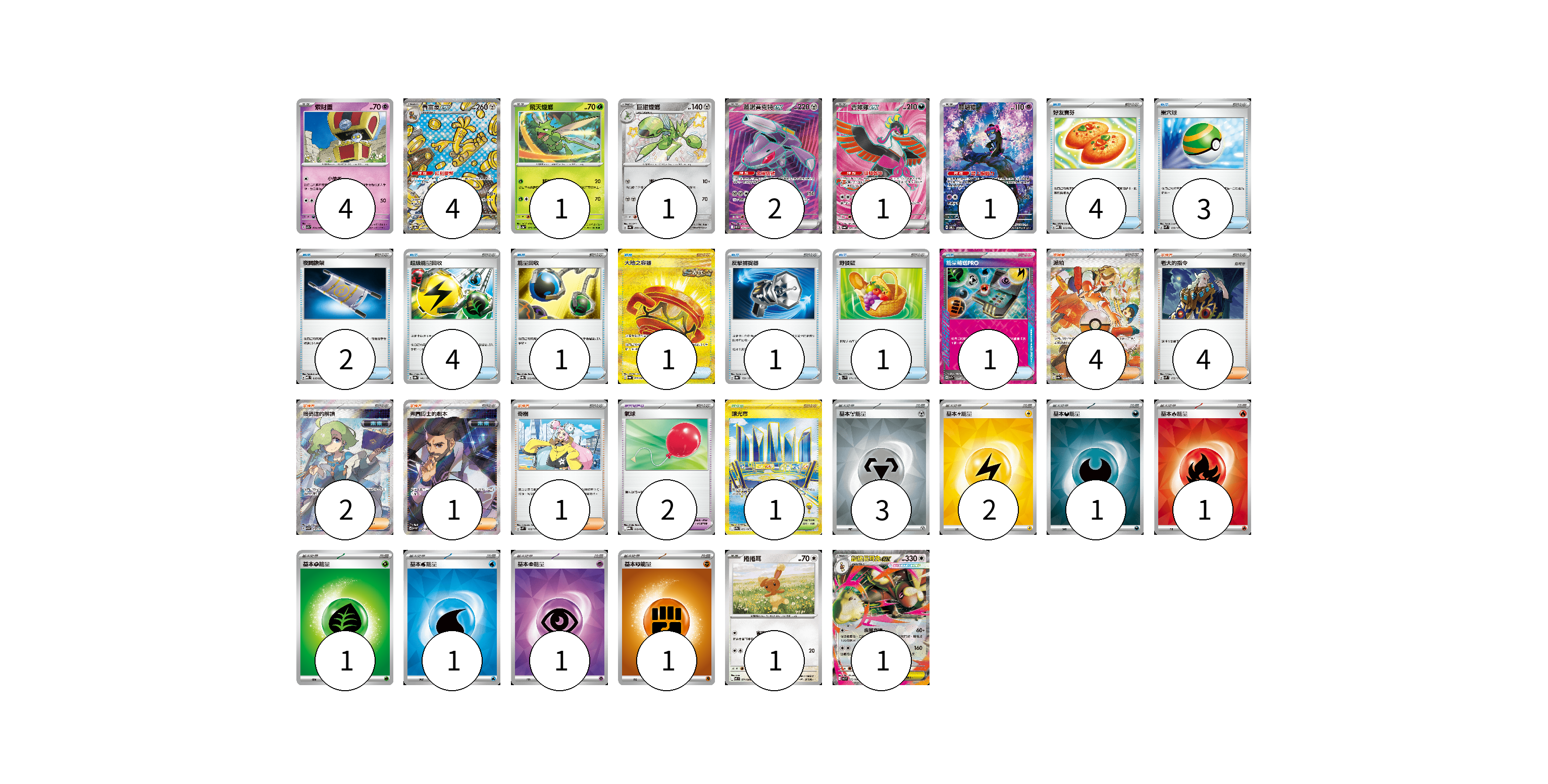 牌組構築方案 以此牌組為基礎新構築牌組 顯示卡面 顯示列表 寶可夢卡(16) 4 4 1 1 2 1 1 1 1 寶可夢道具(2) 2 物品卡(18) 4 3 2 4 1 1 1 1 1 支援者卡(12) 4 4 2 1 1 競技場卡(1) 1 能量卡(11) 3 2 1 1 1 1 1 1 寶可夢卡(16) 卡牌名稱 張數 卡牌名稱 張數 索財靈 SV7a 024/064 04 賽富豪ex SV8a 220/187 04 飛天螳螂 SV2a 123/165 01 巨鉗螳螂 SV4a 299/190 01 蓋諾賽克特ex SV11B 164/086 02 吉雉雞ex SV6a 081/064 01 願增猿 SV6 107/101 01 捲捲耳 M2 071/080 01 超級長耳兔ex M2 072/080 01 寶可夢道具(2) 卡牌名稱 張數 卡牌名稱 張數 氣球 MBG 019/022 02 物品卡(18) 卡牌名稱 張數 卡牌名稱 張數 好友寶芬 MBD 013/022 04 巢穴球 SVM 133/175 03 夜間擔架 MBD 016/022 02 超級能量回收 SV8a 141/187 04 能量回收 SVQL 012/022 01 大地之容器 SV6a 093/064 01 反擊捕捉器 SV8a 139/187 01 野餐籃 SV1V 071/078 01 能量輸送PRO SV7a 052/064 01 支援者卡(12) 卡牌名稱 張數 卡牌名稱 張數 派帕 SV4a 353/190 04 老大的指令 SVM 172/175 04 暗碼迷的解讀 SV5M 090/071 02 弗圖博士的劇本 SV4M 086/066 01 奇樹 SVM 160/175 01 競技場卡(1) 卡牌名稱 張數 卡牌名稱 張數 釀光市 SV9a 092/063 01 能量卡(11) 卡牌名稱 張數 卡牌名稱 張數 基本【鋼】能量 SVOD MET 03 基本【雷】能量 SVQP LIG 02 基本【惡】能量 SVOM DAR 01 基本【火】能量 SVQL FIR 01 基本【草】能量 M-P GRA 01 基本【水】能量 SVK WAT 01 基本【超】能量 SVOD PSY 01 基本【鬥】能量 M-P FIG 01 以此牌組為基礎新構築牌組 牌組編碼 LEsIRO-oeWMZa-CrijfE copy 列印牌組單 牌組編碼已複製 分享至SNS
