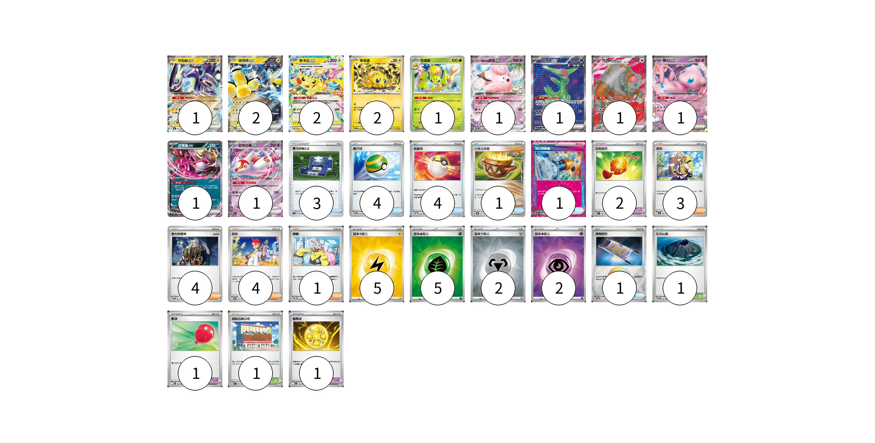 牌組構築方案 以此牌組為基礎新構築牌組 顯示卡面 顯示列表 寶可夢卡(14) 1 2 2 2 1 1 1 1 1 1 1 寶可夢道具(4) 2 1 1 物品卡(14) 3 4 4 1 1 1 支援者卡(12) 3 4 4 1 競技場卡(2) 1 1 能量卡(14) 5 5 2 2 寶可夢卡(14) 卡牌名稱 張數 卡牌名稱 張數 密勒頓ex SV4a 071/190 01 鐵臂膀ex SV8a 054/187 02 皮卡丘ex SV-P 185/SV-P 02 電電蟲 SV7 032/102 02 電蜘蛛 SV6a 002/064 01 莉莉艾的皮皮ex SV9 033/100 01 鐵斑葉ex SV5M 084/071 01 月月熊 赫月 ex SV5a 084/066 01 夢幻ex SVK 001/042 01 吉雉雞ex SVOD 004/020 01 拉帝亞斯ex SV7a 019/064 01 寶可夢道具(4) 卡牌名稱 張數 卡牌名稱 張數 勇氣護符 SVM 142/175 02 氣球 MBD 018/022 01 電氣球 M2a 163/193 01 物品卡(14) 卡牌名稱 張數 卡牌名稱 張數 寶可齒輪3.0 SLD 014/020 03 巢穴球 SVTG 012/019 04 高級球 SVOD 012/020 04 大地之容器 SV8a 143/187 01 頂尖捕捉器 SV8a 148/187 01 夜間擔架 SV8a 151/187 01 支援者卡(12) 卡牌名稱 張數 卡牌名稱 張數 派帕 SV4a 180/190 03 老大的指令 SVTH 017/018 04 赤松 SV8a 163/187 04 奇樹 SVOM 018/021 01 競技場卡(2) 卡牌名稱 張數 卡牌名稱 張數 引力山岳 SV8 106/106 01 城鎮百貨公司 SVK 037/042 01 能量卡(14) 卡牌名稱 張數 卡牌名稱 張數 基本【雷】能量 SVK LIG 05 基本【草】能量 SVK GRA 05 基本【鋼】能量 SVOD MET 02 基本【超】能量 SVOD PSY 02 以此牌組為基礎新構築牌組 牌組編碼 LIEKOm-SncEAg-wLeKHh copy 列印牌組單 牌組編碼已複製 分享至SNS