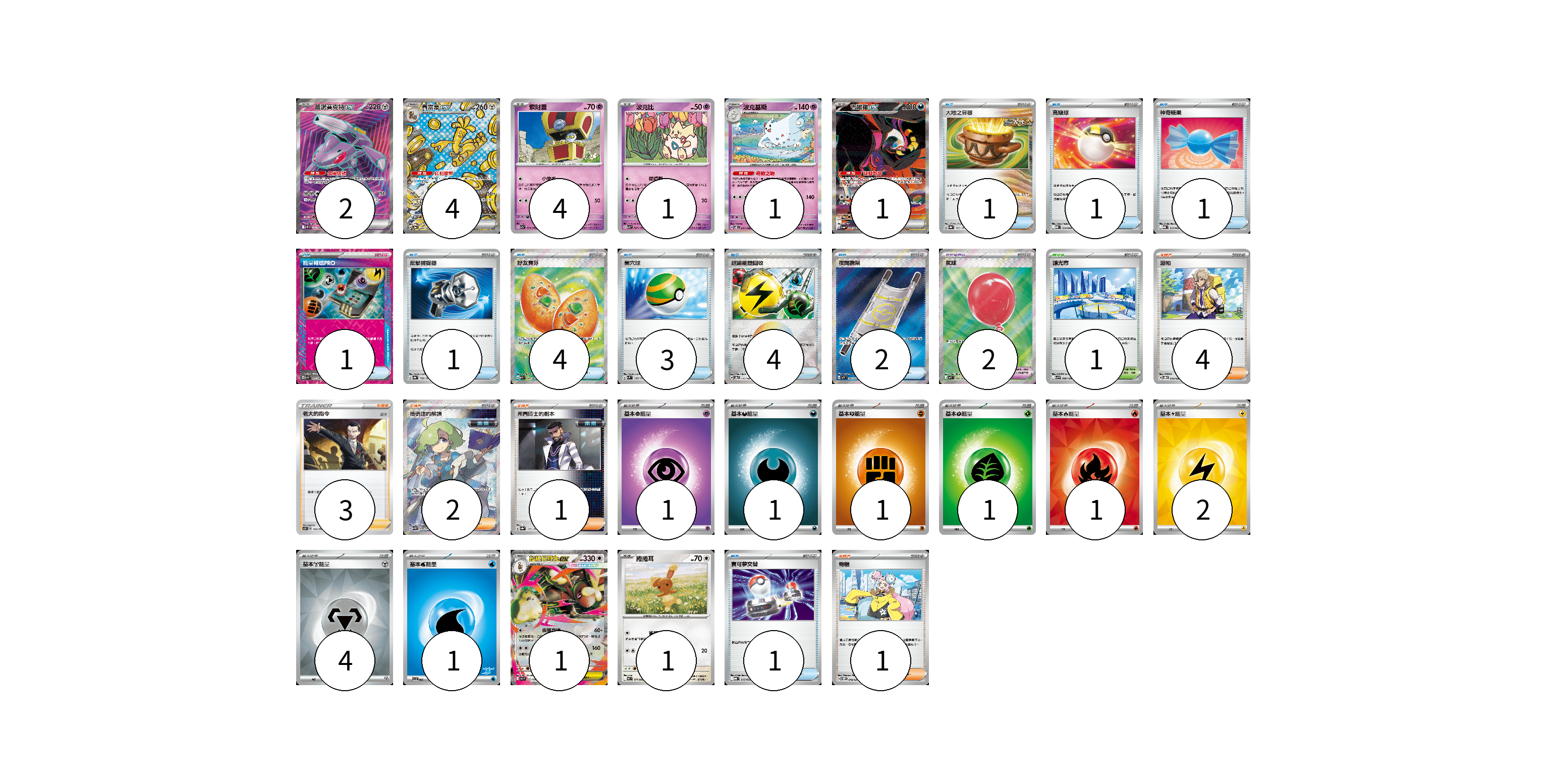 牌組構築方案 以此牌組為基礎新構築牌組 顯示卡面 顯示列表 寶可夢卡(15) 2 4 4 1 1 1 1 1 寶可夢道具(2) 2 物品卡(19) 1 1 1 1 1 4 3 4 2 1 支援者卡(11) 4 3 2 1 1 競技場卡(1) 1 能量卡(12) 1 1 1 1 1 2 4 1 寶可夢卡(15) 卡牌名稱 張數 卡牌名稱 張數 蓋諾賽克特ex SV11B 164/086 02 賽富豪ex SV8a 220/187 04 索財靈 SV7a 024/064 04 波克比 SV3 043/108 01 波克基斯 SV8 047/106 01 吉雉雞ex SV6a 089/064 01 超級長耳兔ex M2 072/080 01 捲捲耳 M2 071/080 01 寶可夢道具(2) 卡牌名稱 張數 卡牌名稱 張數 氣球 M1L 084/063 02 物品卡(19) 卡牌名稱 張數 卡牌名稱 張數 大地之容器 SV8a 143/187 01 高級球 MBD 014/022 01 神奇糖果 MBG 013/022 01 能量輸送PRO SV7a 052/064 01 反擊捕捉器 SV8a 139/187 01 好友寶芬 M1S 081/063 04 巢穴球 SVM 133/175 03 超級能量回收 SV8a 141/187 04 夜間擔架 M1L 083/063 02 寶可夢交替 MBG 015/022 01 支援者卡(11) 卡牌名稱 張數 卡牌名稱 張數 派帕 SVOD 018/020 04 老大的指令(坂木) SCB 140/156 03 暗碼迷的解讀 SV5M 090/071 02 弗圖博士的劇本 SV8a 175/187 01 奇樹 SVOM 018/021 01 競技場卡(1) 卡牌名稱 張數 卡牌名稱 張數 釀光市 SV9 098/100 01 能量卡(12) 卡牌名稱 張數 卡牌名稱 張數 基本【超】能量 MBD PSY 01 基本【惡】能量 MBG DAR 01 基本【鬥】能量 M-P FIG 01 基本【草】能量 M-P GRA 01 基本【火】能量 SVQL FIR 01 基本【雷】能量 SVQP LIG 02 基本【鋼】能量 SVOD MET 04 基本【水】能量 SVI WAT 01 以此牌組為基礎新構築牌組 牌組編碼 LIPNDV-ZCNXbx-BfjWPE copy 列印牌組單 牌組編碼已複製 分享至SNS
