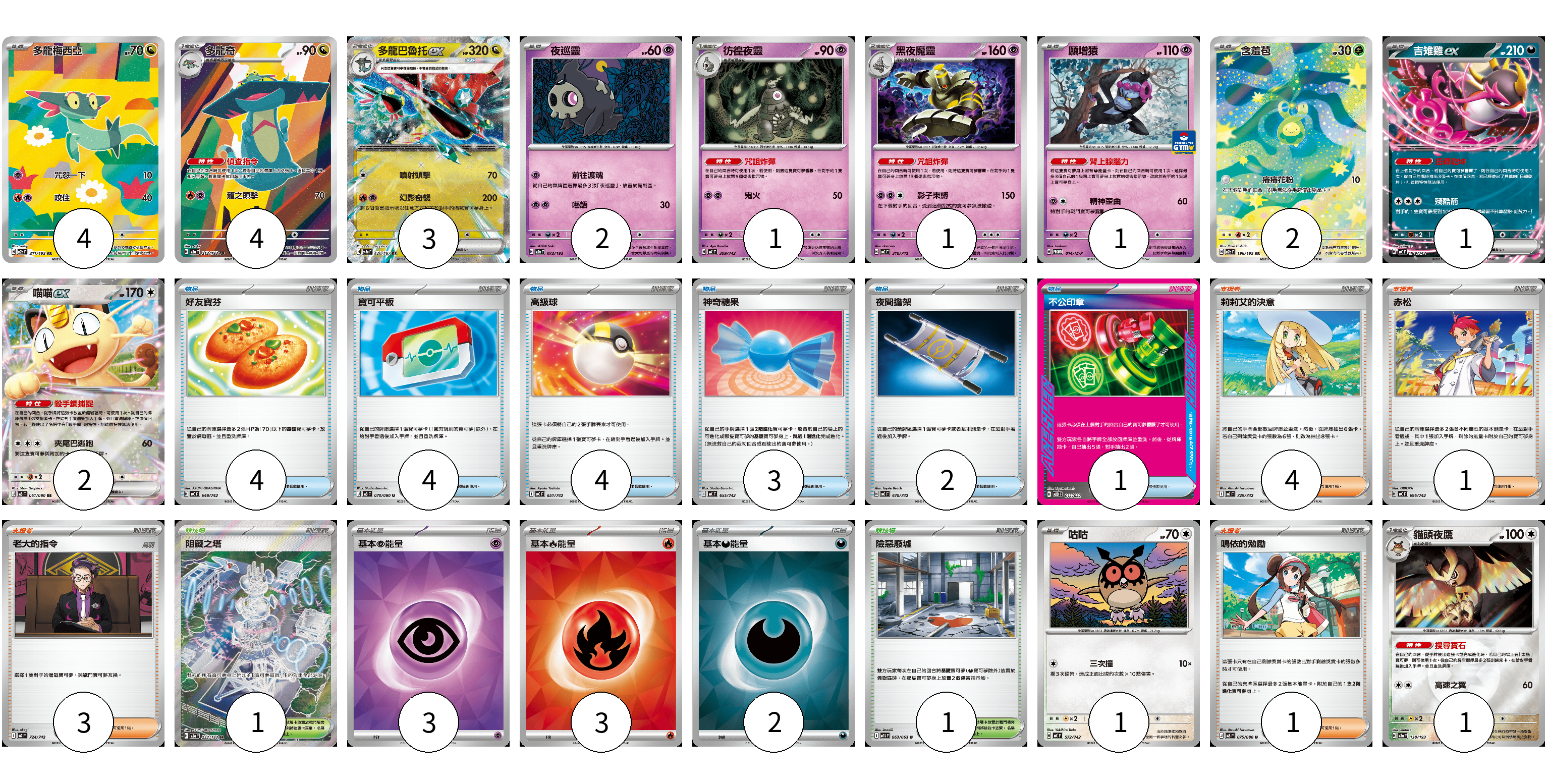 牌組構築方案 以此牌組為基礎新構築牌組 顯示卡面 顯示列表 寶可夢卡(23) 4 4 3 2 1 1 1 2 1 2 1 1 物品卡(18) 4 4 4 3 2 1 支援者卡(9) 4 1 3 1 競技場卡(2) 1 1 能量卡(8) 3 3 2 寶可夢卡(23) 卡牌名稱 張數 卡牌名稱 張數 多龍梅西亞 M2a 211/193 04 多龍奇 M2a 212/193 04 多龍巴魯托ex SV8a 120/187 03 夜巡靈 M2a 072/193 02 彷徨夜靈 MC 309/742 01 黑夜魔靈 MC 310/742 01 願增猿 M-P 014/M-P 01 含羞苞 M2a 196/193 02 吉雉雞ex MC 489/742 01 喵喵ex M3 061/080 02 咕咕 MC 572/742 01 貓頭夜鷹 M2a 138/193 01 物品卡(18) 卡牌名稱 張數 卡牌名稱 張數 好友寶芬 MC 648/742 04 寶可平板 M3 070/080 04 高級球 MC 651/742 04 神奇糖果 MC 655/742 03 夜間擔架 MC 670/742 02 不公印章 MBD 011/022 01 支援者卡(9) 卡牌名稱 張數 卡牌名稱 張數 莉莉艾的決意 MC 729/742 04 赤松 MC 696/742 01 老大的指令 MC 724/742 03 鳴依的勉勵 M3 075/080 01 競技場卡(2) 卡牌名稱 張數 卡牌名稱 張數 阻礙之塔 M2a 222/193 01 險惡廢墟 M1L 063/063 01 能量卡(8) 卡牌名稱 張數 卡牌名稱 張數 基本【超】能量 SVOD PSY 03 基本【火】能量 SVM FIR 03 基本【惡】能量 SVM DAR 02 以此牌組為基礎新構築牌組 牌組編碼 LIbeEW-wlHGYG-ydGAPM copy 列印牌組單 牌組編碼已複製 分享至SNS