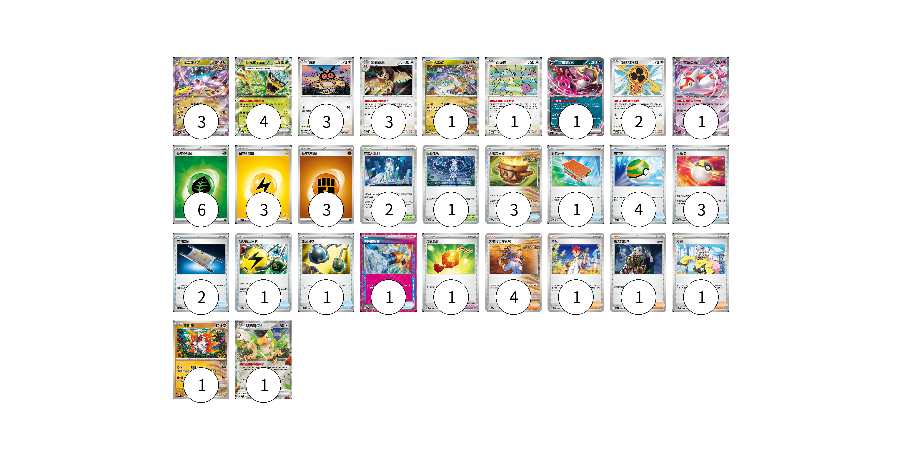 牌組構築方案 以此牌組為基礎新構築牌組 顯示卡面 顯示列表 寶可夢卡(21) 3 4 3 3 1 1 1 2 1 1 1 寶可夢道具(1) 1 物品卡(16) 3 1 4 3 2 1 1 1 支援者卡(7) 4 1 1 1 競技場卡(3) 2 1 能量卡(12) 6 3 3 寶可夢卡(21) 卡牌名稱 張數 卡牌名稱 張數 猛雷鼓ex SV8a 124/187 03 厄鬼椪 碧草面具ex SV8a 020/187 04 咕咕 SV7 076/102 03 貓頭夜鷹 SV8a 128/187 03 猛雷鼓 SV7 075/102 01 百變怪 SV4a 144/190 01 吉雉雞ex SVOD 004/020 01 旋轉洛托姆 SV8a 131/187 02 拉帝亞斯ex SV7a 019/064 01 爬地翅 SV8a 087/187 01 怒鸚哥ex SV4a 154/190 01 寶可夢道具(1) 卡牌名稱 張數 卡牌名稱 張數 勇氣護符 SVM 142/175 01 物品卡(16) 卡牌名稱 張數 卡牌名稱 張數 大地之容器 SV8a 143/187 03 朋友手冊 SVK 014/042 01 巢穴球 SVM 133/175 04 高級球 SVOD 012/020 03 夜間擔架 SVOM 016/021 02 超級能量回收 SV8a 141/187 01 能量回收 SVM 125/175 01 頂尖捕捉器 SV8a 148/187 01 支援者卡(7) 卡牌名稱 張數 卡牌名稱 張數 奧琳博士的氣魄 SV8a 167/187 04 赤松 SV8a 163/187 01 老大的指令 SVOD 019/020 01 奇樹 SVM 160/175 01 競技場卡(3) 卡牌名稱 張數 卡牌名稱 張數 零之大空洞 SV8a 182/187 02 阻礙之塔 SV8a 181/187 01 能量卡(12) 卡牌名稱 張數 卡牌名稱 張數 基本【草】能量 SVK GRA 06 基本【雷】能量 SVI LIG 03 基本【鬥】能量 SVTG FIG 03 以此牌組為基礎新構築牌組 牌組編碼 LLMxJf-SvuKXa-TjnrqH copy 列印牌組單 牌組編碼已複製 分享至SNS