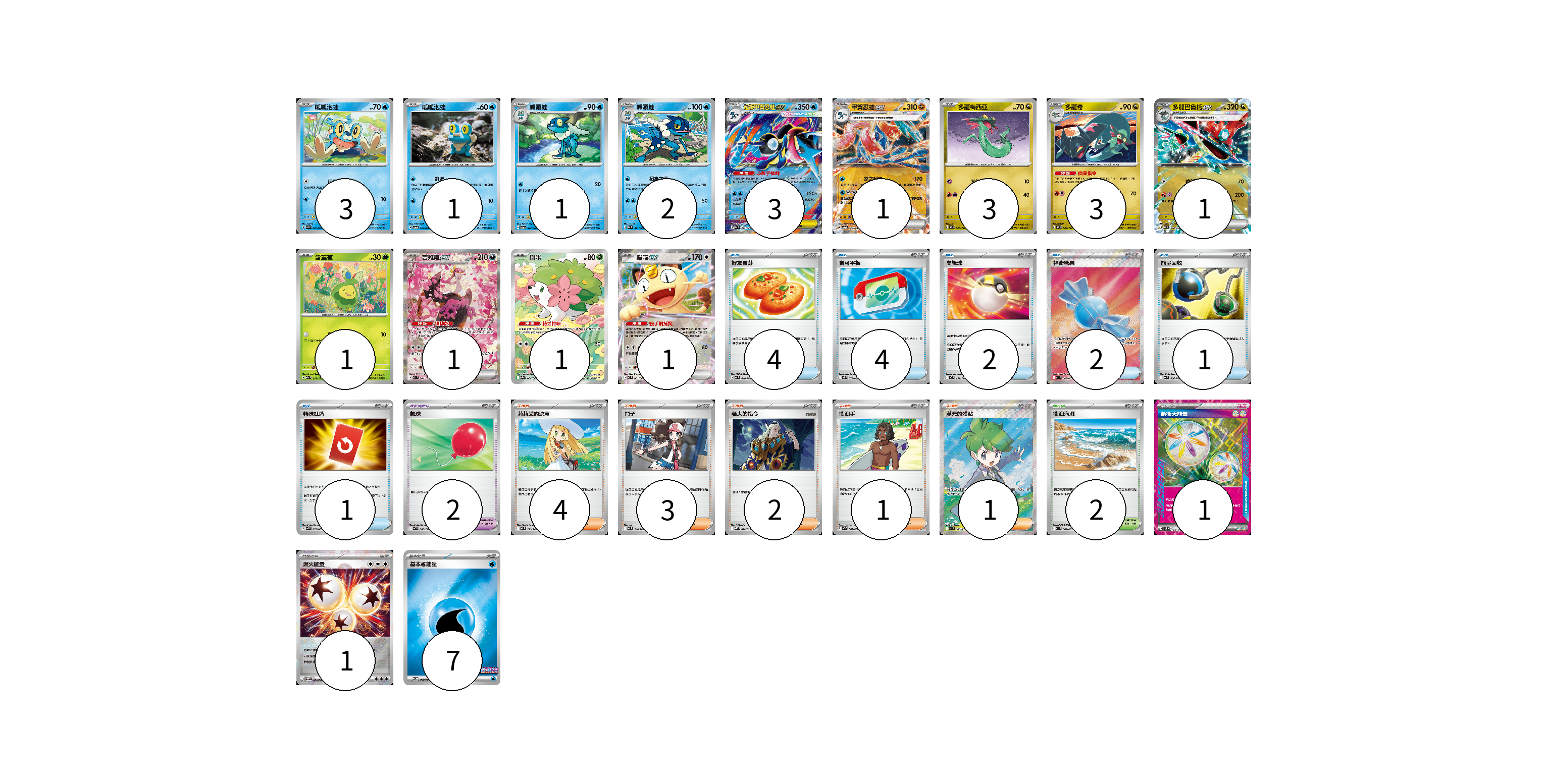 牌組構築方案 以此牌組為基礎新構築牌組 顯示卡面 顯示列表 寶可夢卡(22) 3 1 1 2 3 1 3 3 1 1 1 1 1 寶可夢道具(2) 2 物品卡(14) 4 4 2 2 1 1 支援者卡(11) 4 3 2 1 1 競技場卡(2) 2 能量卡(9) 1 1 7 寶可夢卡(22) 卡牌名稱 張數 卡牌名稱 張數 呱呱泡蛙 M4 020/083 03 呱呱泡蛙 SV5a 023/066 01 呱頭蛙 SV5a 024/066 01 呱頭蛙 M4 021/083 02 超級甲賀忍蛙ex M4 022/083 03 甲賀忍蛙ex SV5a 045/066 01 多龍梅西亞 MC 546/742 03 多龍奇 MC 547/742 03 多龍巴魯托ex MC 548/742 01 含羞苞 M2a 011/193 01 吉雉雞ex M2a 244/193 01 謝米 SV9a 066/063 01 喵喵ex M3 061/080 01 寶可夢道具(2) 卡牌名稱 張數 卡牌名稱 張數 氣球 MC 688/742 02 物品卡(14) 卡牌名稱 張數 卡牌名稱 張數 好友寶芬 MC 648/742 04 寶可平板 M3 070/080 04 高級球 MC 651/742 02 神奇糖果 M1S 082/063 02 能量回收 MC 636/742 01 特殊紅牌 M4 072/083 01 支援者卡(11) 卡牌名稱 張數 卡牌名稱 張數 莉莉艾的決意 MC 729/742 04 鬥子 MC 718/742 03 老大的指令 MBD 020/022 02 衝浪手 SV7a 061/064 01 滿充的體貼 M1S 085/063 01 競技場卡(2) 卡牌名稱 張數 卡牌名稱 張數 衝浪海灘 M1S 062/063 02 能量卡(9) 卡牌名稱 張數 卡牌名稱 張數 新衝天能量 SV5K 071/071 01 燃火能量 SV11W 086/086 01 基本【水】能量 M-P 098/M-P 07 以此牌組為基礎新構築牌組 牌組編碼 LMLREh-rfgRBW-urKuHe copy 列印牌組單 牌組編碼已複製 分享至SNS