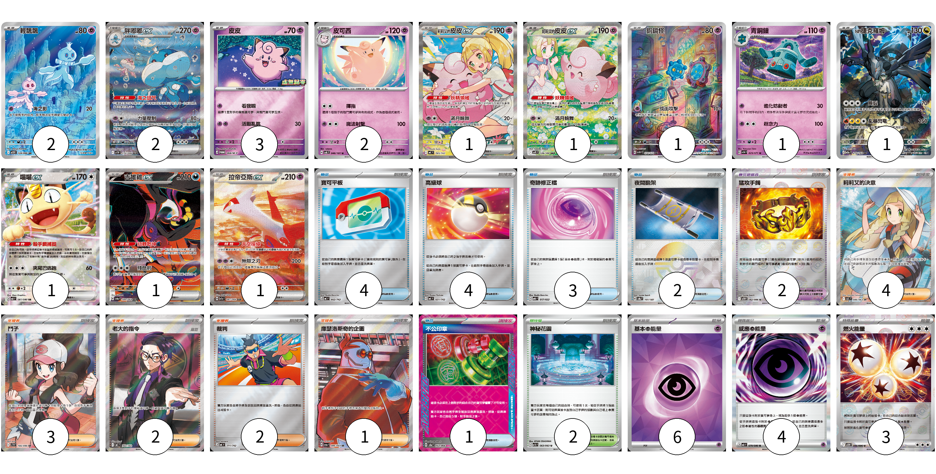牌組構築方案 以此牌組為基礎新構築牌組 顯示卡面 顯示列表 寶可夢卡(17) 2 2 3 2 1 1 1 1 1 1 1 1 寶可夢道具(2) 2 物品卡(14) 4 4 3 2 1 支援者卡(12) 4 3 2 2 1 競技場卡(2) 2 能量卡(13) 6 4 3 寶可夢卡(17) 卡牌名稱 張數 卡牌名稱 張數 輕飄飄 SV11W 124/086 02 胖嘟嘟ex SV11W 170/086 02 皮皮 M-P 068/M-P 03 皮可西 SV6 046/101 02 莉莉艾的皮皮ex MC 765/742 01 莉莉艾的皮皮ex SV9 126/100 01 銅鏡怪 SV5K 074/071 01 青銅鐘 SV5K 029/071 01 N的捷克羅姆 M2a 210/193 01 喵喵ex M3 061/080 01 吉雉雞ex SV6a 089/064 01 拉帝亞斯ex SV7a 087/064 01 寶可夢道具(2) 卡牌名稱 張數 卡牌名稱 張數 猛攻手鐲 SV11W 082/086 02 物品卡(14) 卡牌名稱 張數 卡牌名稱 張數 寶可平板 MC 662/742 04 高級球 MC 651/742 04 奇跡修正檔 MBD 017/022 03 夜間擔架 SV8a 151/187 02 不公印章 SV5a 053/066 01 支援者卡(12) 卡牌名稱 張數 卡牌名稱 張數 莉莉艾的決意 M1L 086/063 04 鬥子 SV11W 166/086 03 老大的指令(烏羽) MC 760/742 02 裁判 MC 711/742 02 庫瑟洛斯奇的企圖 SV6a 086/064 01 競技場卡(2) 卡牌名稱 張數 卡牌名稱 張數 神秘花園 M1S 063/063 02 能量卡(13) 卡牌名稱 張數 卡牌名稱 張數 基本【超】能量 SVM PSY 06 感應【超】能量 M3 079/080 04 燃火能量 SV11W 086/086 03 以此牌組為基礎新構築牌組 牌組編碼 LMjdso-vWLXNa-JeZEUR copy 列印牌組單 牌組編碼已複製 分享至SNS