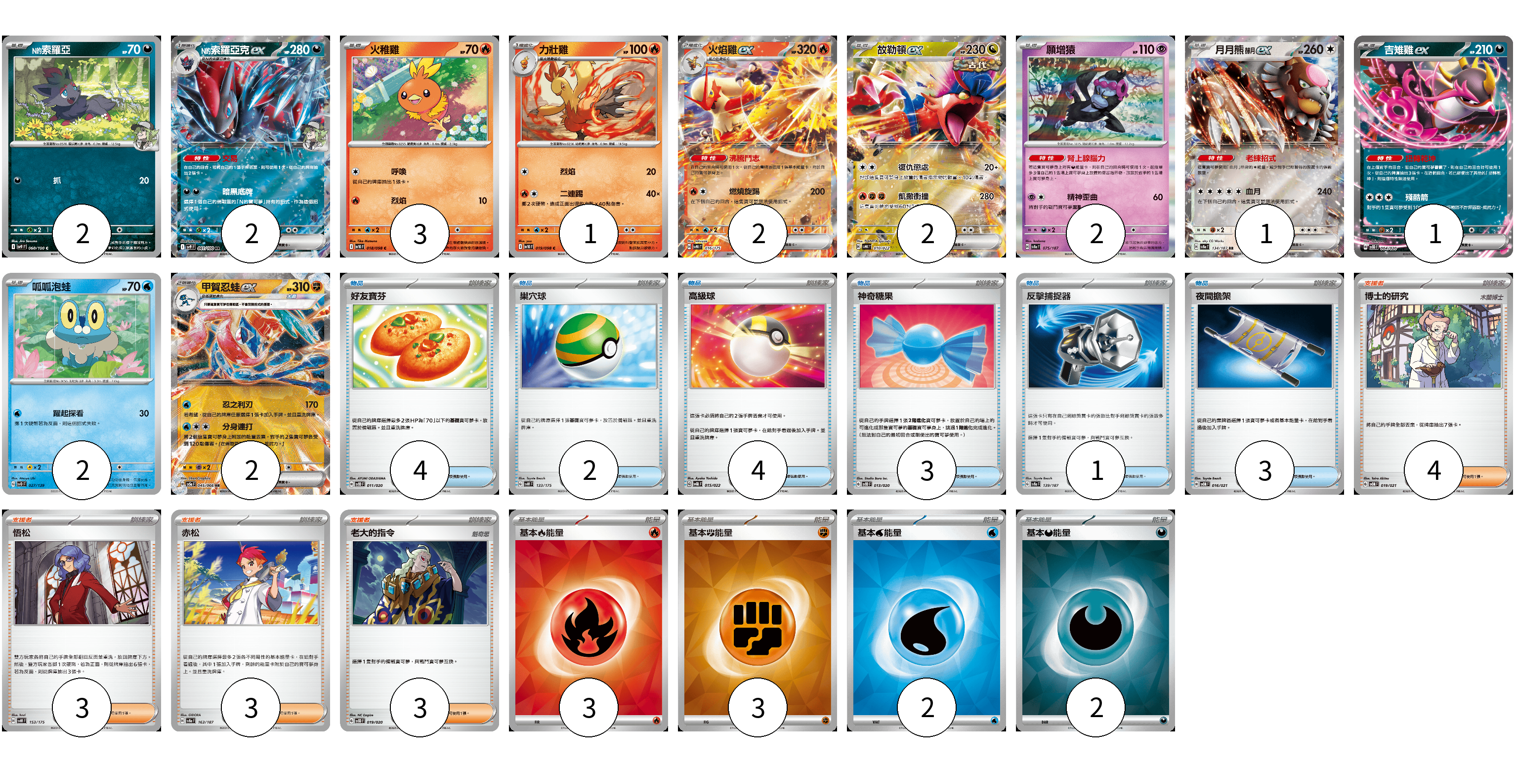 牌組構築方案 以此牌組為基礎新構築牌組 顯示卡面 顯示列表 寶可夢卡(20) 2 2 3 1 2 2 2 1 1 2 2 物品卡(17) 4 2 4 3 1 3 支援者卡(13) 4 3 3 3 能量卡(10) 3 3 2 2 寶可夢卡(20) 卡牌名稱 張數 卡牌名稱 張數 N的索羅亞 SV9 060/100 02 N的索羅亞克ex SV9 061/100 02 火稚雞 SV10 018/098 03 力壯雞 SV10 019/098 01 火焰雞ex SVM 016/175 02 故勒頓ex SVHK 010/022 02 願增猿 SV8a 075/187 02 月月熊 赫月ex SV8a 134/187 01 吉雉雞ex SVOD 004/020 01 呱呱泡蛙 SVD 027/139 02 甲賀忍蛙ex SV5a 045/066 02 物品卡(17) 卡牌名稱 張數 卡牌名稱 張數 好友寶芬 SVOD 011/020 04 巢穴球 SVM 133/175 02 高級球 SVQL 015/022 04 神奇糖果 SVOD 013/020 03 反擊捕捉器 SV8a 139/187 01 夜間擔架 SVOM 016/021 03 支援者卡(13) 卡牌名稱 張數 卡牌名稱 張數 博士的研究 SVOM 019/021 04 悟松 SVM 153/175 03 赤松 SV8a 163/187 03 老大的指令 SVOD 019/020 03 能量卡(10) 卡牌名稱 張數 卡牌名稱 張數 基本【火】能量 SVQL FIR 03 基本【鬥】能量 SVM FIG 03 基本【水】能量 SVM WAT 02 基本【惡】能量 SVOM DAR 02 以此牌組為基礎新構築牌組 牌組編碼 LPIoRi-TfApey-ROfcNQ copy 列印牌組單 牌組編碼已複製 分享至SNS