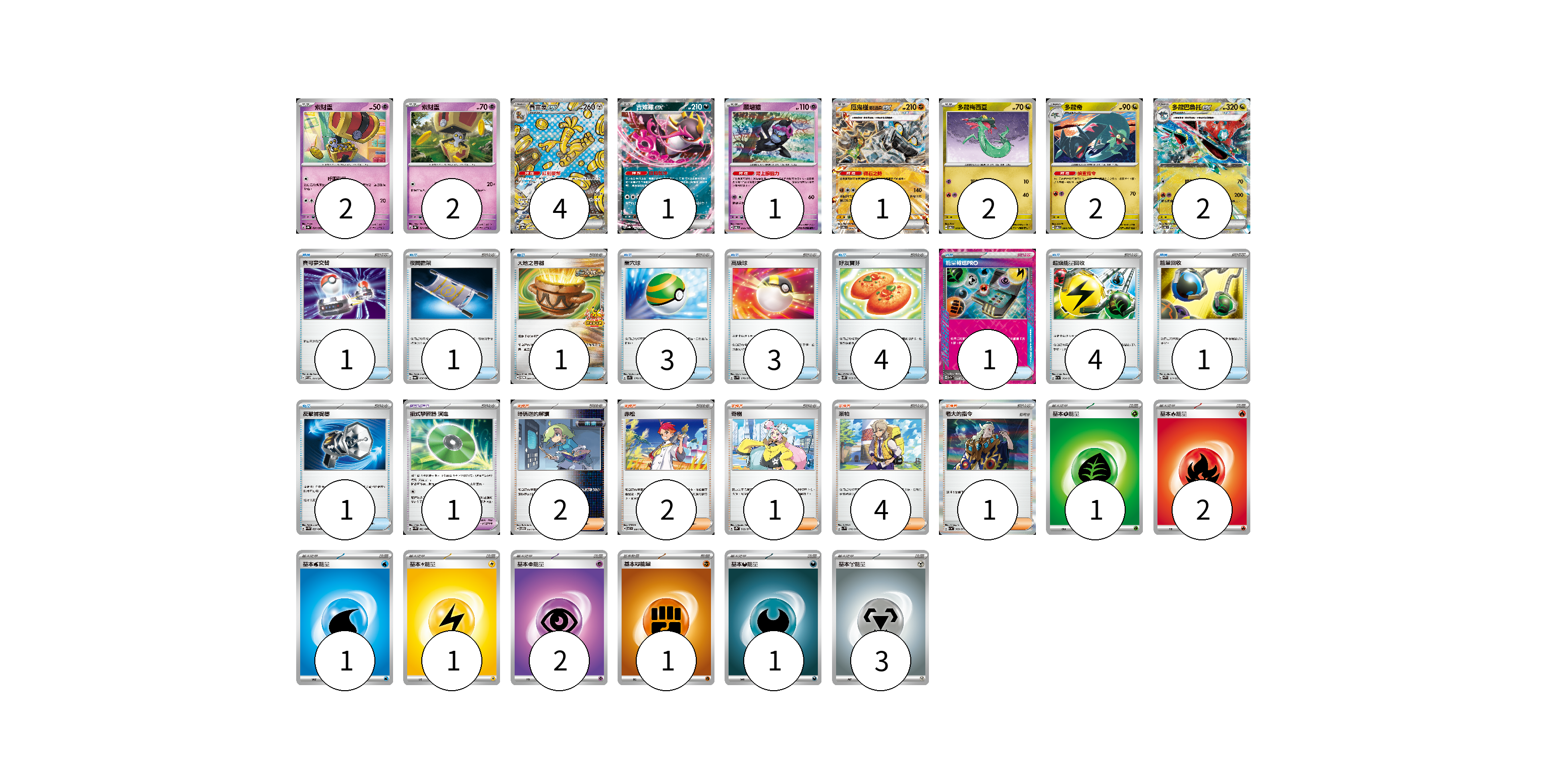 牌組構築方案 以此牌組為基礎新構築牌組 顯示卡面 顯示列表 寶可夢卡(17) 2 2 4 1 1 1 2 2 2 寶可夢道具(1) 1 物品卡(20) 1 1 1 3 3 4 1 4 1 1 支援者卡(10) 2 2 1 4 1 能量卡(12) 1 2 1 1 2 1 1 3 寶可夢卡(17) 卡牌名稱 張數 卡牌名稱 張數 索財靈 SV3a 020/062 02 索財靈 SV3a 021/062 02 賽富豪ex SV8a 220/187 04 吉雉雞ex SV8a 104/187 01 願增猿 SV6 055/101 01 厄鬼椪 礎石面具ex SV6 065/101 01 多龍梅西亞 SV6 079/101 02 多龍奇 SV6 080/101 02 多龍巴魯托ex SV6 081/101 02 寶可夢道具(1) 卡牌名稱 張數 卡牌名稱 張數 招式學習器 演進 SV4M 063/066 01 物品卡(20) 卡牌名稱 張數 卡牌名稱 張數 寶可夢交替 SV-P 014/SV-P 01 夜間擔架 SV6a 056/064 01 大地之容器 SV-P 084/SV-P 01 巢穴球 SV1S 070/078 03 高級球 SV1V 070/078 03 好友寶芬 SV5K 063/071 04 能量輸送PRO SV7a 052/064 01 超級能量回收 SV1a 064/073 04 能量回收 SVAW 011/023 01 反擊捕捉器 SV4M 059/066 01 支援者卡(10) 卡牌名稱 張數 卡牌名稱 張數 暗碼迷的解讀 SV5M 067/071 02 赤松 SV7 097/102 02 奇樹 SV2D 069/071 01 派帕 SV1V 076/078 04 老大的指令 SV1a 069/073 01 能量卡(12) 卡牌名稱 張數 卡牌名稱 張數 基本草能量 sv-p GRA 01 基本火能量 sv-p FIR 02 基本水能量 sv-p WAT 01 基本雷能量 sv-p LIG 01 基本超能量 sv-p PSY 02 基本【鬥】能量 SVAM FIG 01 基本惡能量 sv-p DAR 01 基本鋼能量 sv-p MET 03 以此牌組為基礎新構築牌組 牌組編碼 LPrbTG-NQFsFg-UxFFws copy 列印牌組單 牌組編碼已複製 分享至SNS