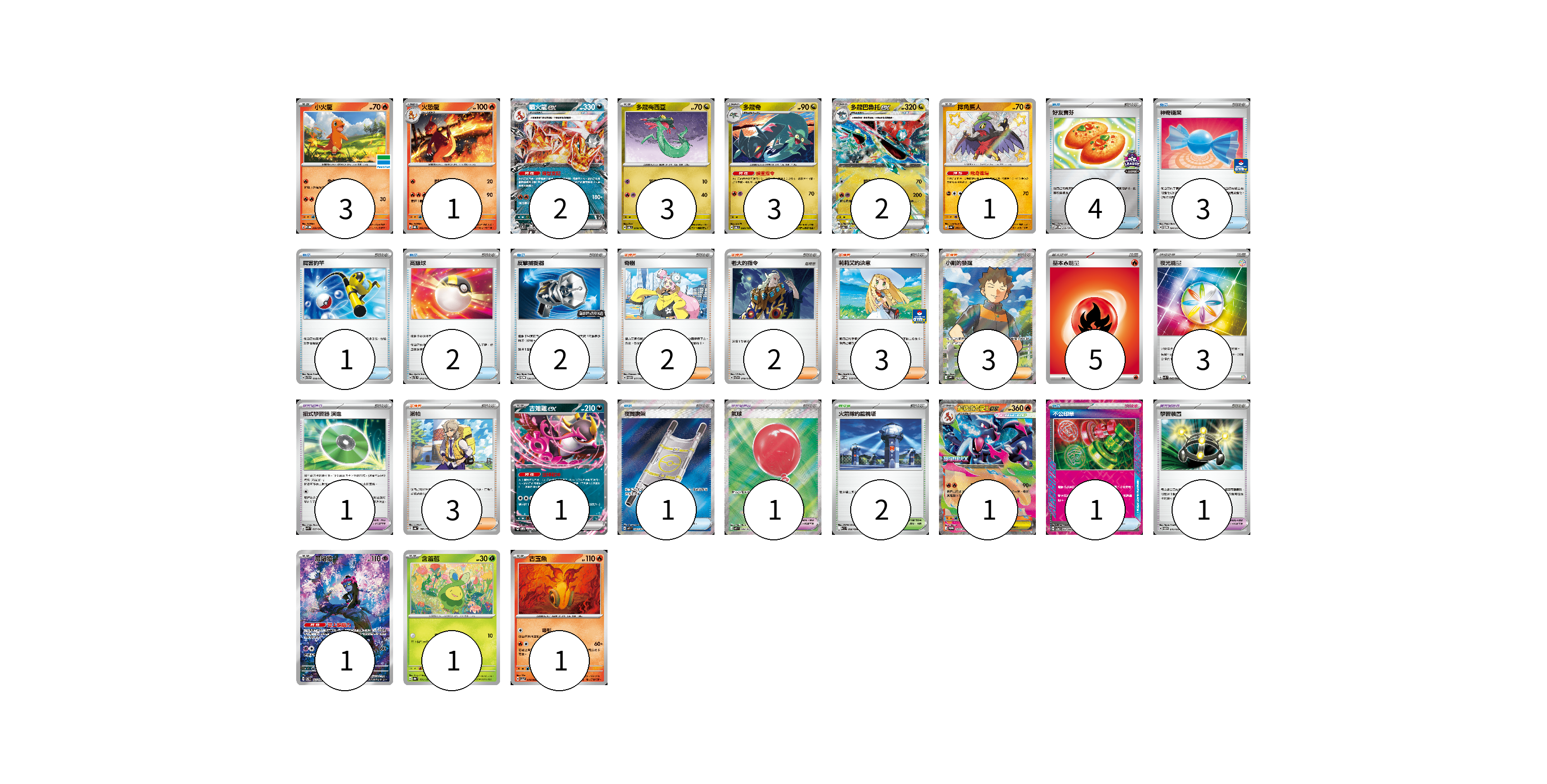 牌組構築方案 以此牌組為基礎新構築牌組 顯示卡面 顯示列表 寶可夢卡(20) 3 1 2 3 3 2 1 1 1 1 1 1 寶可夢道具(3) 1 1 1 物品卡(14) 4 3 1 2 2 1 1 支援者卡(13) 2 2 3 3 3 競技場卡(2) 2 能量卡(8) 5 3 寶可夢卡(20) 卡牌名稱 張數 卡牌名稱 張數 小火龍 SV-P 232/SV-P 03 火恐龍 SVQL 002/022 01 噴火龍ex SVTL 006/021 02 多龍梅西亞 SV6 079/101 03 多龍奇 SV6 080/101 03 多龍巴魯托ex SV6 081/101 02 摔角鷹人 SV4a 282/190 01 吉雉雞ex SVOM 009/021 01 超級噴火龍Xex M-P 029/M-P 01 願增猿 SV6 107/101 01 含羞苞 SV8a 001/187 01 古玉魚 SV5a 018/066 01 寶可夢道具(3) 卡牌名稱 張數 卡牌名稱 張數 招式學習器 演進 SVK 025/042 01 氣球 M1L 084/063 01 學習裝置 SVTM 016/022 01 物品卡(14) 卡牌名稱 張數 卡牌名稱 張數 好友寶芬 SV-P 230/SV-P 04 神奇糖果 SV-P 104/SV-P 03 厲害釣竿 SVTH 008/018 01 高級球 SVTL 012/021 02 反擊捕捉器 SV-P 136/SV-P 02 夜間擔架 M1L 083/063 01 不公印章 SV5a 053/066 01 支援者卡(13) 卡牌名稱 張數 卡牌名稱 張數 奇樹 SVTM 017/022 02 老大的指令 SVTG 019/019 02 莉莉艾的決意 M-P 018/M-P 03 小剛的發掘 SV9 123/100 03 派帕 SV4a 180/190 03 競技場卡(2) 卡牌名稱 張數 卡牌名稱 張數 火箭隊的監視塔 SV10 096/098 02 能量卡(8) 卡牌名稱 張數 卡牌名稱 張數 基本火能量 sv-p FIR 05 夜光能量 SVK 042/042 03 以此牌組為基礎新構築牌組 牌組編碼 LPwMly-CBVrkV-mgSsxA copy 列印牌組單 牌組編碼已複製 分享至SNS