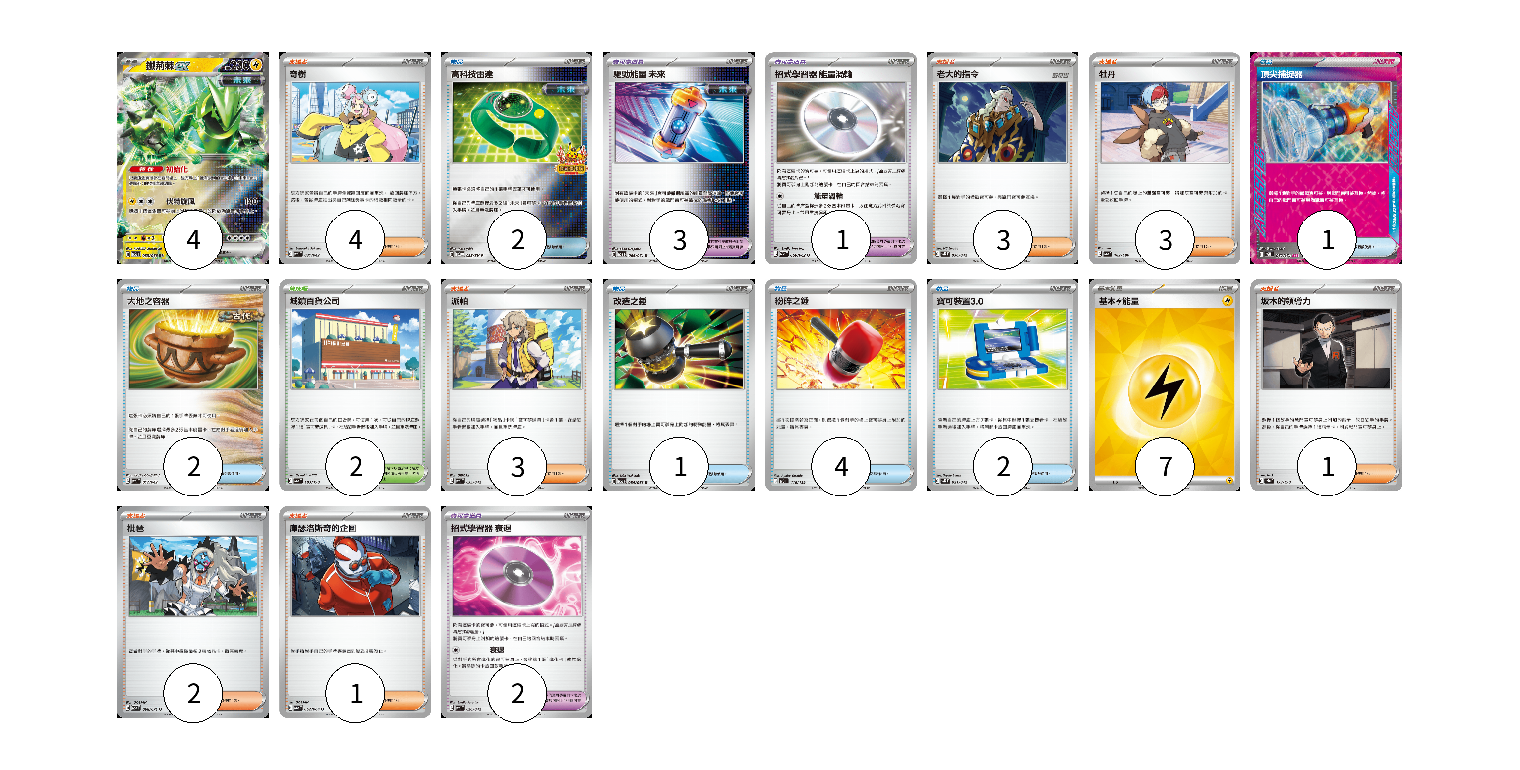 牌組構築方案 以此牌組為基礎新構築牌組 顯示卡面 顯示列表 寶可夢卡(4) 4 寶可夢道具(6) 3 1 2 物品卡(12) 2 1 2 1 4 2 支援者卡(17) 4 3 3 3 1 2 1 競技場卡(2) 2 能量卡(7) 7 寶可夢卡(4) 卡牌名稱 張數 卡牌名稱 張數 鐵荊棘ex SV5a 033/066 04 寶可夢道具(6) 卡牌名稱 張數 卡牌名稱 張數 驅勁能量 未來 SV5M 065/071 03 招式學習器 能量渦輪 SV3a 056/062 01 招式學習器 衰退 SVK 026/042 02 物品卡(12) 卡牌名稱 張數 卡牌名稱 張數 高科技雷達 SV-P 085/SV-P 02 頂尖捕捉器 SV5M 062/071 01 大地之容器 SVK 012/042 02 改造之錘 SV5a 054/066 01 粉碎之錘 SVD 116/139 04 寶可裝置3.0 SVK 021/042 02 支援者卡(17) 卡牌名稱 張數 卡牌名稱 張數 奇樹 SVK 031/042 04 老大的指令 SVK 036/042 03 牡丹 SV4a 182/190 03 派帕 SVK 035/042 03 坂木的領導力 SV4a 173/190 01 枇琶 SV5K 068/071 02 庫瑟洛斯奇的企圖 SV6a 062/064 01 競技場卡(2) 卡牌名稱 張數 卡牌名稱 張數 城鎮百貨公司 SV4a 183/190 02 能量卡(7) 卡牌名稱 張數 卡牌名稱 張數 基本【雷】能量 SVK LIG 07 以此牌組為基礎新構築牌組 牌組編碼 LRpZht-gGDAWj-aOxPUG copy 列印牌組單 牌組編碼已複製 分享至SNS
