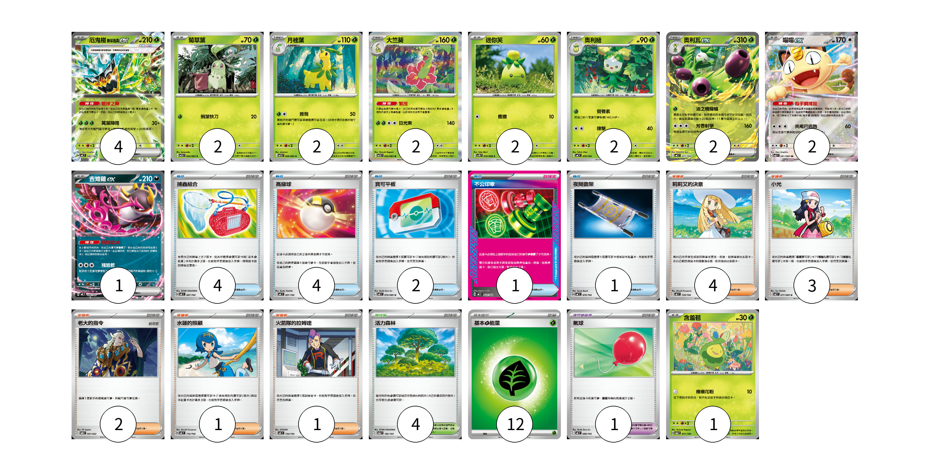 牌組構築方案 以此牌組為基礎新構築牌組 顯示卡面 顯示列表 寶可夢卡(20) 4 2 2 2 2 2 2 2 1 1 寶可夢道具(1) 1 物品卡(12) 4 4 2 1 1 支援者卡(11) 4 3 2 1 1 競技場卡(4) 4 能量卡(12) 12 寶可夢卡(20) 卡牌名稱 張數 卡牌名稱 張數 厄鬼椪 碧草面具ex MC 082/742 04 菊草葉 M1S 003/063 02 月桂葉 M1S 004/063 02 大竺葵 M1S 005/063 02 迷你芙 SV10 010/098 02 奧利紐 MC 070/742 02 奧利瓦ex MC 071/742 02 喵喵ex M3 061/080 02 吉雉雞ex MC 489/742 01 含羞苞 M2a 011/193 01 寶可夢道具(1) 卡牌名稱 張數 卡牌名稱 張數 氣球 MC 688/742 01 物品卡(12) 卡牌名稱 張數 卡牌名稱 張數 捕蟲組合 MC 667/742 04 高級球 MC 651/742 04 寶可平板 M3 070/080 02 不公印章 MC 633/742 01 夜間擔架 MC 670/742 01 支援者卡(11) 卡牌名稱 張數 卡牌名稱 張數 莉莉艾的決意 MC 729/742 04 小光 M2 077/080 03 老大的指令 MBG 021/022 02 水蓮的照顧 MC 712/742 01 火箭隊的拉姆達 MC 734/742 01 競技場卡(4) 卡牌名稱 張數 卡牌名稱 張數 活力森林 M2a 182/193 04 能量卡(12) 卡牌名稱 張數 卡牌名稱 張數 基本【草】能量 MJ GRA 12 以此牌組為基礎新構築牌組 牌組編碼 LRugtE-MjEfHY-MLFKoM copy 列印牌組單 牌組編碼已複製 分享至SNS