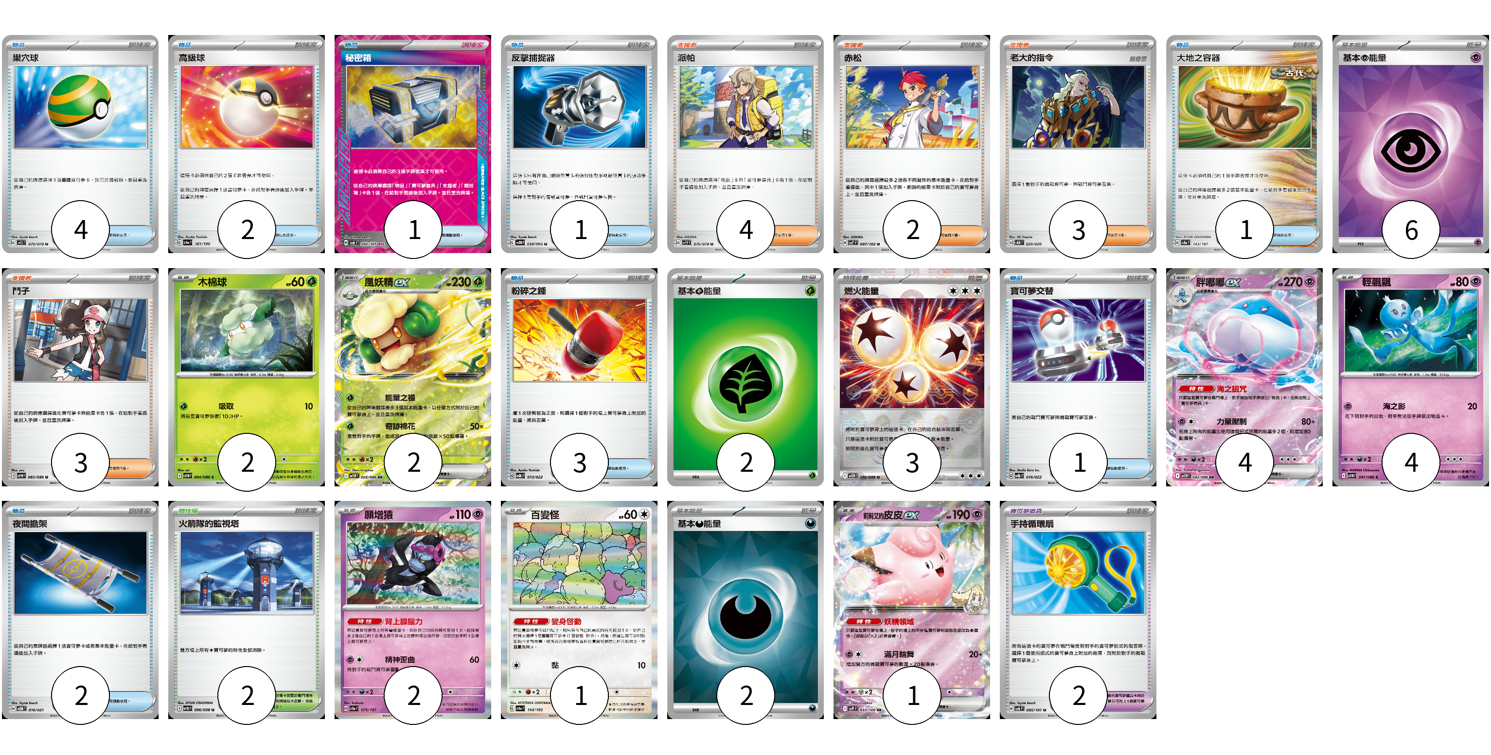 牌組構築方案 以此牌組為基礎新構築牌組 顯示卡面 顯示列表 寶可夢卡(16) 2 2 4 4 2 1 1 寶可夢道具(2) 2 物品卡(15) 4 2 1 1 1 3 1 2 支援者卡(12) 4 2 3 3 競技場卡(2) 2 能量卡(13) 6 2 3 2 寶可夢卡(16) 卡牌名稱 張數 卡牌名稱 張數 木棉球 SV11W 004/086 02 風妖精ex SV11W 005/086 02 胖嘟嘟ex SV11W 042/086 04 輕飄飄 SV11W 041/086 04 願增猿 SV8a 075/187 02 百變怪 SV4a 144/190 01 莉莉艾的皮皮ex SV9 033/100 01 寶可夢道具(2) 卡牌名稱 張數 卡牌名稱 張數 手持循環扇 SV6 095/101 02 物品卡(15) 卡牌名稱 張數 卡牌名稱 張數 巢穴球 SV1S 070/078 04 高級球 SV4a 161/190 02 秘密箱 SV6 092/101 01 反擊捕捉器 SV4M 059/066 01 大地之容器 SV8a 143/187 01 粉碎之錘 SVQL 013/022 03 寶可夢交替 SVQL 016/022 01 夜間擔架 SVOM 016/021 02 支援者卡(12) 卡牌名稱 張數 卡牌名稱 張數 派帕 SV1V 076/078 04 赤松 SV7 097/102 02 老大的指令 SVEM 020/020 03 鬥子 SV11W 085/086 03 競技場卡(2) 卡牌名稱 張數 卡牌名稱 張數 火箭隊的監視塔 SV10 096/098 02 能量卡(13) 卡牌名稱 張數 卡牌名稱 張數 基本【超】能量 SVOD PSY 06 基本【草】能量 SVTM GRA 02 燃火能量 SV11W 086/086 03 基本【惡】能量 SVOM DAR 02 以此牌組為基礎新構築牌組 牌組編碼 LSIkNm-protLP-oMABbY copy 列印牌組單 牌組編碼已複製 分享至SNS