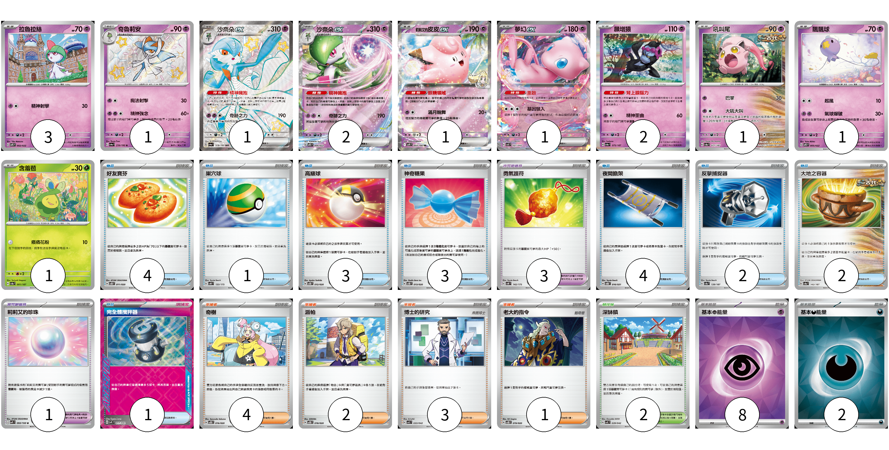 牌組構築方案 以此牌組為基礎新構築牌組 顯示卡面 顯示列表 寶可夢卡(14) 3 1 1 2 1 1 2 1 1 1 寶可夢道具(4) 3 1 物品卡(20) 4 1 3 3 4 2 2 1 支援者卡(10) 4 2 3 1 競技場卡(2) 2 能量卡(10) 8 2 寶可夢卡(14) 卡牌名稱 張數 卡牌名稱 張數 拉魯拉絲 SVTS 002/022 03 奇魯莉安 SV4a 259/190 01 沙奈朵ex SV4a 328/190 01 沙奈朵ex SVTS 004/022 02 莉莉艾的皮皮ex SV9 033/100 01 夢幻ex SVK 001/042 01 願增猿 SV8a 075/187 02 吼叫尾 SV8a 071/187 01 飄飄球 SVTS 005/022 01 含羞苞 SV8a 001/187 01 寶可夢道具(4) 卡牌名稱 張數 卡牌名稱 張數 勇氣護符 SVM 142/175 03 莉莉艾的珍珠 SV9 093/100 01 物品卡(20) 卡牌名稱 張數 卡牌名稱 張數 好友寶芬 SVOD 011/020 04 巢穴球 SVM 133/175 01 高級球 SVOD 012/020 03 神奇糖果 SVOD 013/020 03 夜間擔架 SVOM 016/021 04 反擊捕捉器 SV8a 139/187 02 大地之容器 SV8a 143/187 02 完全體攪拌器 SVK 017/042 01 支援者卡(10) 卡牌名稱 張數 卡牌名稱 張數 奇樹 SVOD 016/020 04 派帕 SVOD 018/020 02 博士的研究 SVK 033/042 03 老大的指令 SVOD 019/020 01 競技場卡(2) 卡牌名稱 張數 卡牌名稱 張數 深缽鎮 SVK 039/042 02 能量卡(10) 卡牌名稱 張數 卡牌名稱 張數 基本【超】能量 SVOD PSY 08 基本【惡】能量 SVOM DAR 02 以此牌組為基礎新構築牌組 牌組編碼 LUcrvN-qRxvZZ-fIcjsR copy 列印牌組單 牌組編碼已複製 分享至SNS