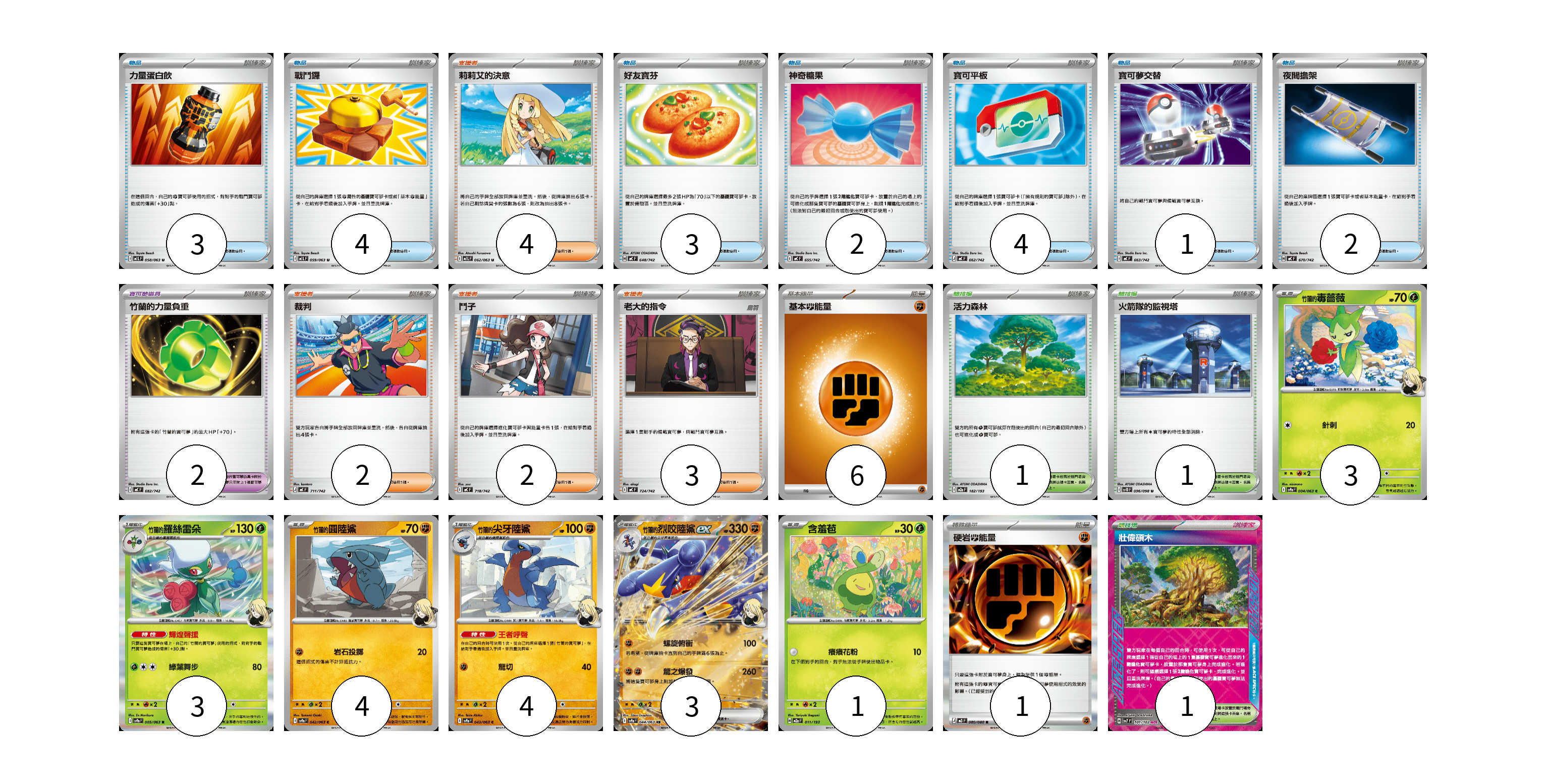 牌組構築方案 以此牌組為基礎新構築牌組 顯示卡面 顯示列表 寶可夢卡(18) 3 3 4 4 3 1 寶可夢道具(2) 2 物品卡(19) 3 4 3 2 4 1 2 支援者卡(11) 4 2 2 3 競技場卡(3) 1 1 1 能量卡(7) 6 1 寶可夢卡(18) 卡牌名稱 張數 卡牌名稱 張數 <竹蘭的>毒薔薇 SV9a 004/063 03 <竹蘭的>羅絲雷朵 SV9a 005/063 03 <竹蘭的>圓陸鯊 SV9a 042/063 04 <竹蘭的>尖牙陸鯊 SV9a 043/063 04 <竹蘭的>烈咬陸鯊ex SV9a 044/063 03 含羞苞 M2a 011/193 01 寶可夢道具(2) 卡牌名稱 張數 卡牌名稱 張數 竹蘭的力量負重 MC 682/742 02 物品卡(19) 卡牌名稱 張數 卡牌名稱 張數 力量蛋白飲 M1L 058/063 03 戰鬥鑼 M1L 059/063 04 好友寶芬 MC 648/742 03 神奇糖果 MC 655/742 02 寶可平板 MC 662/742 04 寶可夢交替 MC 663/742 01 夜間擔架 MC 670/742 02 支援者卡(11) 卡牌名稱 張數 卡牌名稱 張數 莉莉艾的決意 M1L 062/063 04 裁判 MC 711/742 02 鬥子 MC 718/742 02 老大的指令 MC 724/742 03 競技場卡(3) 卡牌名稱 張數 卡牌名稱 張數 活力森林 M2a 182/193 01 火箭隊的監視塔 SV10 096/098 01 壯偉碩木 SV7 101/102 01 能量卡(7) 卡牌名稱 張數 卡牌名稱 張數 基本【鬥】能量 MC FIG 06 硬岩【鬥】能量 M3 080/080 01 以此牌組為基礎新構築牌組 牌組編碼 LXrEUT-ZrsfkU-HPenHw copy 列印牌組單 牌組編碼已複製 分享至SNS