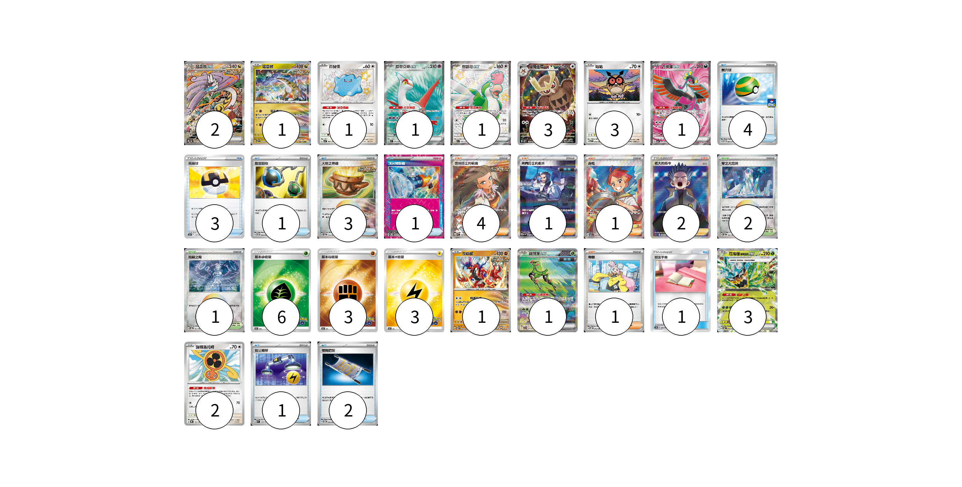 牌組構築方案 以此牌組為基礎新構築牌組 顯示卡面 顯示列表 寶可夢卡(20) 2 1 1 1 1 3 3 1 1 1 3 2 物品卡(16) 4 3 1 3 1 1 1 2 支援者卡(9) 4 1 1 2 1 競技場卡(3) 2 1 能量卡(12) 6 3 3 寶可夢卡(20) 卡牌名稱 張數 卡牌名稱 張數 猛雷鼓ex SV8a 222/187 02 猛雷鼓 SV7 075/102 01 百變怪 SV4a 309/190 01 拉帝亞斯ex SV7a 078/064 01 怒鸚哥ex SV4a 337/190 01 貓頭夜鷹 SV7 114/102 03 咕咕 SV7 076/102 03 吉雉雞ex SV6a 081/064 01 故勒頓 SV8 069/106 01 鐵斑葉ex SV5M 093/071 01 厄鬼椪 碧草面具ex SV6 016/101 03 旋轉洛托姆 SV8a 131/187 02 物品卡(16) 卡牌名稱 張數 卡牌名稱 張數 巢穴球 SV-P 091/SV-P 04 高級球 S12a 138/172 03 能量回收 SVTM 009/022 01 大地之容器 SV8a 143/187 03 頂尖捕捉器 SV5M 062/071 01 朋友手冊 AS6b 188/194 01 能量轉移 SVM 127/175 01 夜間擔架 SVOM 016/021 02 支援者卡(9) 卡牌名稱 張數 卡牌名稱 張數 奧琳博士的氣魄 SV4K 085/066 04 弗圖博士的劇本 SV4M 091/066 01 赤松 SV7 123/102 01 老大的指令(赤日) S12a 250/172 02 奇樹 SVOD 016/020 01 競技場卡(3) 卡牌名稱 張數 卡牌名稱 張數 零之大空洞 SV8a 182/187 02 阻礙之塔 SV8a 181/187 01 能量卡(12) 卡牌名稱 張數 卡牌名稱 張數 基本草能量 S10b GRA 06 基本鬥能量 S10b FIG 03 基本雷能量 S10b LIG 03 以此牌組為基礎新構築牌組 牌組編碼 LZsWbE-OhELdy-PbfVeN copy 列印牌組單 牌組編碼已複製 分享至SNS