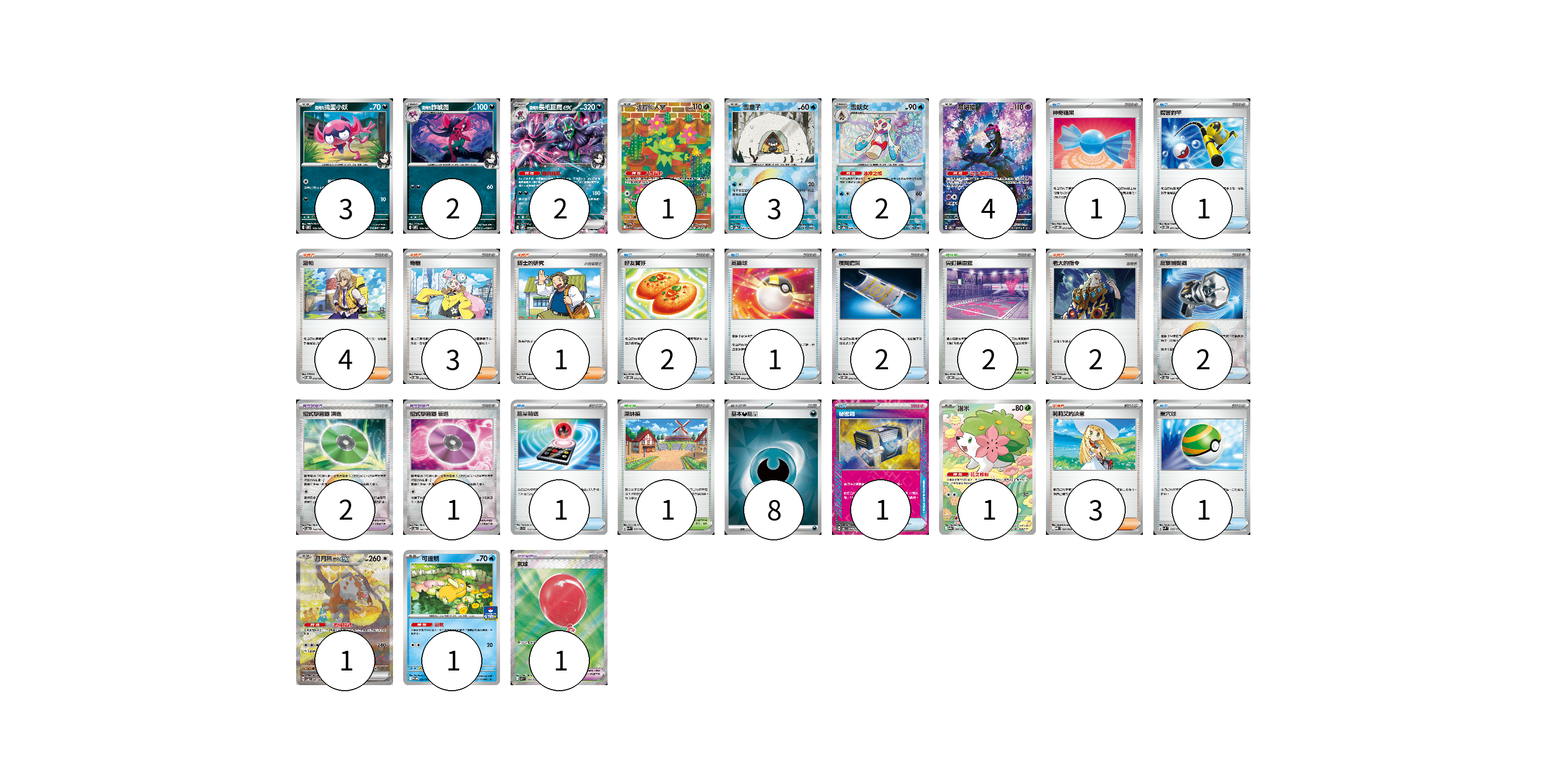 牌組構築方案 以此牌組為基礎新構築牌組 顯示卡面 顯示列表 寶可夢卡(20) 3 2 2 1 3 2 4 1 1 1 寶可夢道具(4) 2 1 1 物品卡(12) 1 1 2 1 2 2 1 1 1 支援者卡(13) 4 3 1 2 3 競技場卡(3) 2 1 能量卡(8) 8 寶可夢卡(20) 卡牌名稱 張數 卡牌名稱 張數 <瑪俐的>搗蛋小妖 SVOM 005/021 03 <瑪俐的>詐唬魔 SVOM 006/021 02 <瑪俐的>長毛巨魔ex SVOM 007/021 02 沙鈴仙人掌 SV9 101/100 01 雪童子 SV8a 037/187 03 雪妖女 SV8a 038/187 02 願增猿 SV6 107/101 04 謝米 SV9a 066/063 01 月月熊 赫月 ex SV5a 091/066 01 可達鴨 SV-P 220/SV-P 01 寶可夢道具(4) 卡牌名稱 張數 卡牌名稱 張數 招式學習器 演進 SV8a 160/187 02 招式學習器 衰退 SV8a 161/187 01 氣球 M1L 084/063 01 物品卡(12) 卡牌名稱 張數 卡牌名稱 張數 神奇糖果 SVOD 013/020 01 厲害釣竿 SVOM 011/021 01 好友寶芬 SVOM 012/021 02 高級球 SVOM 013/021 01 夜間擔架 SVOM 016/021 02 反擊捕捉器 SV8a 139/187 02 能量輸送 SVD 112/139 01 秘密箱 SV6 092/101 01 巢穴球 SVM 133/175 01 支援者卡(13) 卡牌名稱 張數 卡牌名稱 張數 派帕 SVOD 018/020 04 奇樹 SVOD 016/020 03 博士的研究 SVOD 017/020 01 老大的指令 SVOM 020/021 02 莉莉艾的決意 MBD 021/022 03 競技場卡(3) 卡牌名稱 張數 卡牌名稱 張數 尖釘鎮道館 SVOM 021/021 02 深缽鎮 SVK 039/042 01 能量卡(8) 卡牌名稱 張數 卡牌名稱 張數 基本【惡】能量 SVOM DAR 08 以此牌組為基礎新構築牌組 牌組編碼 LbFmTD-VIqTsQ-iagmoM copy 列印牌組單 牌組編碼已複製 分享至SNS