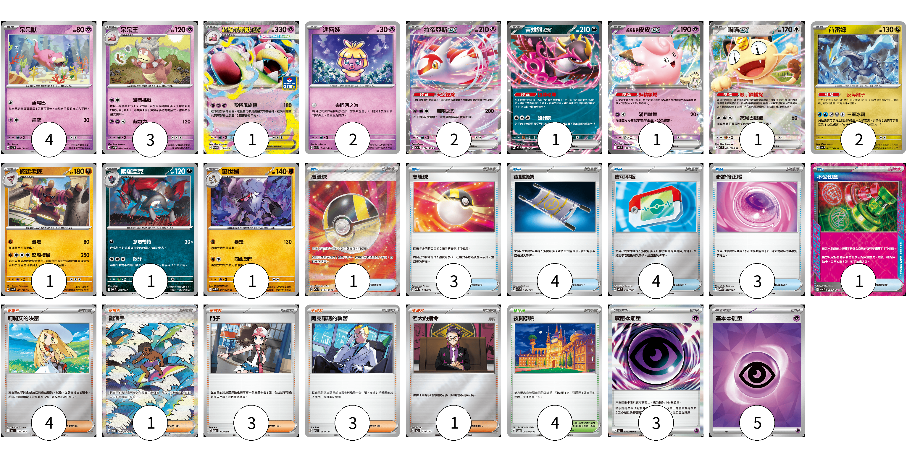 牌組構築方案 以此牌組為基礎新構築牌組 顯示卡面 顯示列表 寶可夢卡(20) 4 3 1 2 2 1 1 1 2 1 1 1 物品卡(16) 1 3 4 4 3 1 支援者卡(12) 4 1 3 3 1 競技場卡(4) 4 能量卡(8) 3 5 寶可夢卡(20) 卡牌名稱 張數 卡牌名稱 張數 呆呆獸 SV7 038/102 04 呆呆王 SV7 039/102 03 超級呆殼獸ex M-P 077/M-P 01 迷唇娃 SV7a 018/064 02 拉帝亞斯ex M2a 075/193 02 吉雉雞ex MC 489/742 01 <莉莉艾的>皮皮ex MC 287/742 01 喵喵ex M3 061/080 01 酋雷姆 SV6a 047/064 02 修建老匠 SV6 061/101 01 索羅亞克 MC 468/742 01 棄世猴 SV8 062/106 01 物品卡(16) 卡牌名稱 張數 卡牌名稱 張數 高級球 M2a 216/193 01 高級球 MBD 014/022 03 夜間擔架 M2a 159/193 04 寶可平板 MC 662/742 04 奇跡修正檔 MBD 017/022 03 不公印章 SV5a 053/066 01 支援者卡(12) 卡牌名稱 張數 卡牌名稱 張數 莉莉艾的決意 MC 729/742 04 衝浪手 M2a 249/193 01 鬥子 M2a 172/193 03 阿克羅瑪的執著 SV8a 164/187 03 老大的指令 MC 724/742 01 競技場卡(4) 卡牌名稱 張數 卡牌名稱 張數 夜間學院 SV6a 064/064 04 能量卡(8) 卡牌名稱 張數 卡牌名稱 張數 感應【超】能量 M3 079/080 03 基本【超】能量 SVOD PSY 05 以此牌組為基礎新構築牌組 牌組編碼 LcxLoW-bqArDF-ABjTJo copy 列印牌組單 牌組編碼已複製 分享至SNS