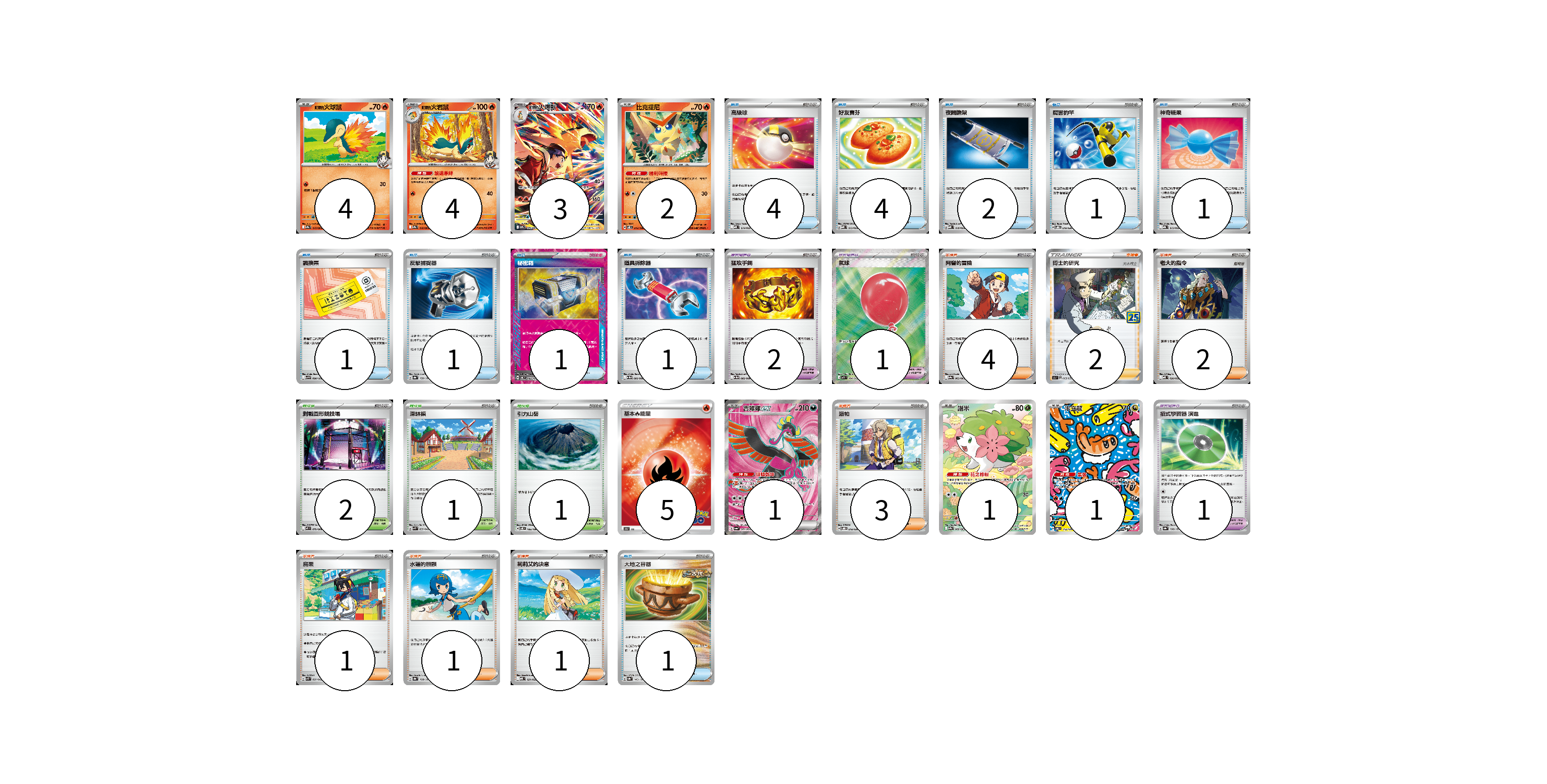 牌組構築方案 以此牌組為基礎新構築牌組 顯示卡面 顯示列表 寶可夢卡(16) 4 4 3 2 1 1 1 寶可夢道具(4) 2 1 1 物品卡(17) 4 4 2 1 1 1 1 1 1 1 支援者卡(14) 4 2 2 3 1 1 1 競技場卡(4) 2 1 1 能量卡(5) 5 寶可夢卡(16) 卡牌名稱 張數 卡牌名稱 張數 <阿響的>火球鼠 SV9a 015/063 04 <阿響的>火岩鼠 SV9a 016/063 04 <阿響的>火爆獸 SV9a 070/063 03 比克提尼 SV8 012/106 02 吉雉雞ex SV6a 081/064 01 謝米 SV9a 066/063 01 米立龍 SV6 112/101 01 寶可夢道具(4) 卡牌名稱 張數 卡牌名稱 張數 猛攻手鐲 SV11W 082/086 02 氣球 M1L 084/063 01 招式學習器 演進 SV8a 160/187 01 物品卡(17) 卡牌名稱 張數 卡牌名稱 張數 高級球 MBD 014/022 04 好友寶芬 MBD 013/022 04 夜間擔架 MBD 016/022 02 厲害釣竿 SVOD 010/020 01 神奇糖果 MBG 013/022 01 調換票 SV9 090/100 01 反擊捕捉器 SV8a 139/187 01 秘密箱 SV6 092/101 01 道具拆除器 SV11W 080/086 01 大地之容器 SV8a 143/187 01 支援者卡(14) 卡牌名稱 張數 卡牌名稱 張數 阿響的冒險 SV9a 063/063 04 博士的研究(大木博士) S8a 003/028 02 老大的指令 MBD 020/022 02 派帕 SVOD 018/020 03 烏栗 SVK 029/042 01 水蓮的照顧 SV8a 168/187 01 莉莉艾的決意 MBD 021/022 01 競技場卡(4) 卡牌名稱 張數 卡牌名稱 張數 對戰圓形競技場 M2 079/080 02 深缽鎮 SVK 039/042 01 引力山岳 SV8 106/106 01 能量卡(5) 卡牌名稱 張數 卡牌名稱 張數 基本火能量 S10b FIR 05 以此牌組為基礎新構築牌組 牌組編碼 LdGmHn-XxTDQR-Pvwktc copy 列印牌組單 牌組編碼已複製 分享至SNS