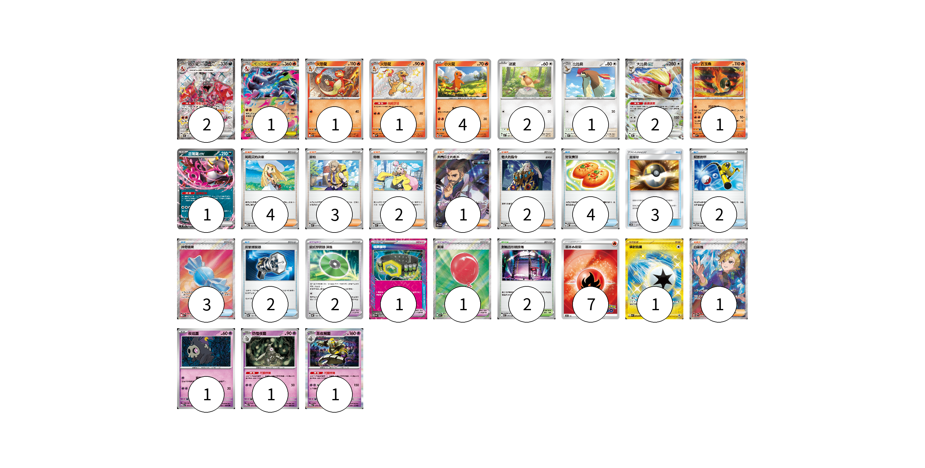 牌組構築方案 以此牌組為基礎新構築牌組 顯示卡面 顯示列表 寶可夢卡(19) 2 1 1 1 4 2 1 2 1 1 1 1 1 寶可夢道具(4) 2 1 1 物品卡(14) 4 3 2 3 2 支援者卡(13) 4 3 2 1 2 1 競技場卡(2) 2 能量卡(8) 7 1 寶可夢卡(19) 卡牌名稱 張數 卡牌名稱 張數 噴火龍ex SV4a 331/190 02 超級噴火龍Xex M2 013/080 01 火恐龍 M2 012/080 01 火恐龍 SV4a 211/190 01 小火龍 SVTL 001/021 04 波波 SV3 087/108 02 比比鳥 SVK 004/042 01 大比鳥ex SV4a 139/190 02 古玉魚 SV4K 016/066 01 吉雉雞ex SVOM 009/021 01 夜巡靈 M2a 072/193 01 彷徨夜靈 M2a 073/193 01 黑夜魔靈 M2a 074/193 01 寶可夢道具(4) 卡牌名稱 張數 卡牌名稱 張數 招式學習器 演進 SV8a 160/187 02 極限腰帶 SV5K 066/071 01 氣球 M1L 084/063 01 物品卡(14) 卡牌名稱 張數 卡牌名稱 張數 好友寶芬 MBD 013/022 04 高級球 AS6D 147/168 03 厲害釣竿 SVOD 010/020 02 神奇糖果 M1S 082/063 03 反擊捕捉器 SV8a 139/187 02 支援者卡(13) 卡牌名稱 張數 卡牌名稱 張數 莉莉艾的決意 MBG 022/022 04 派帕 SVK 035/042 03 奇樹 SVK 031/042 02 弗圖博士的劇本 SV4M 086/066 01 老大的指令 MBG 021/022 02 白蕾雅 SV7 126/102 01 競技場卡(2) 卡牌名稱 張數 卡牌名稱 張數 對戰圓形競技場 M2 079/080 02 能量卡(8) 卡牌名稱 張數 卡牌名稱 張數 基本火能量 S10b FIR 07 噴射能量 SV7a 094/064 01 以此牌組為基礎新構築牌組 牌組編碼 LgHZcE-XypsKt-nktfhc copy 列印牌組單 牌組編碼已複製 分享至SNS